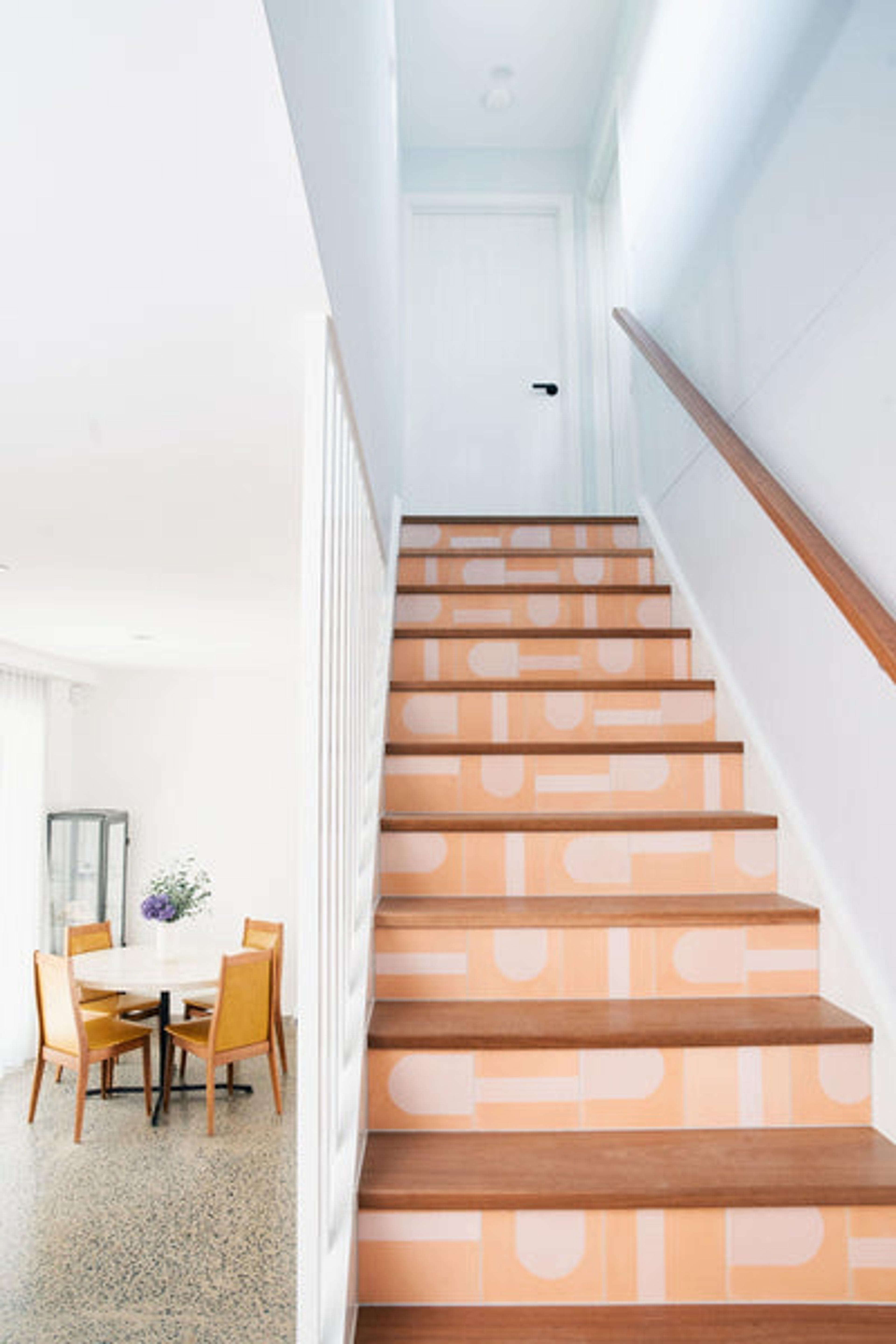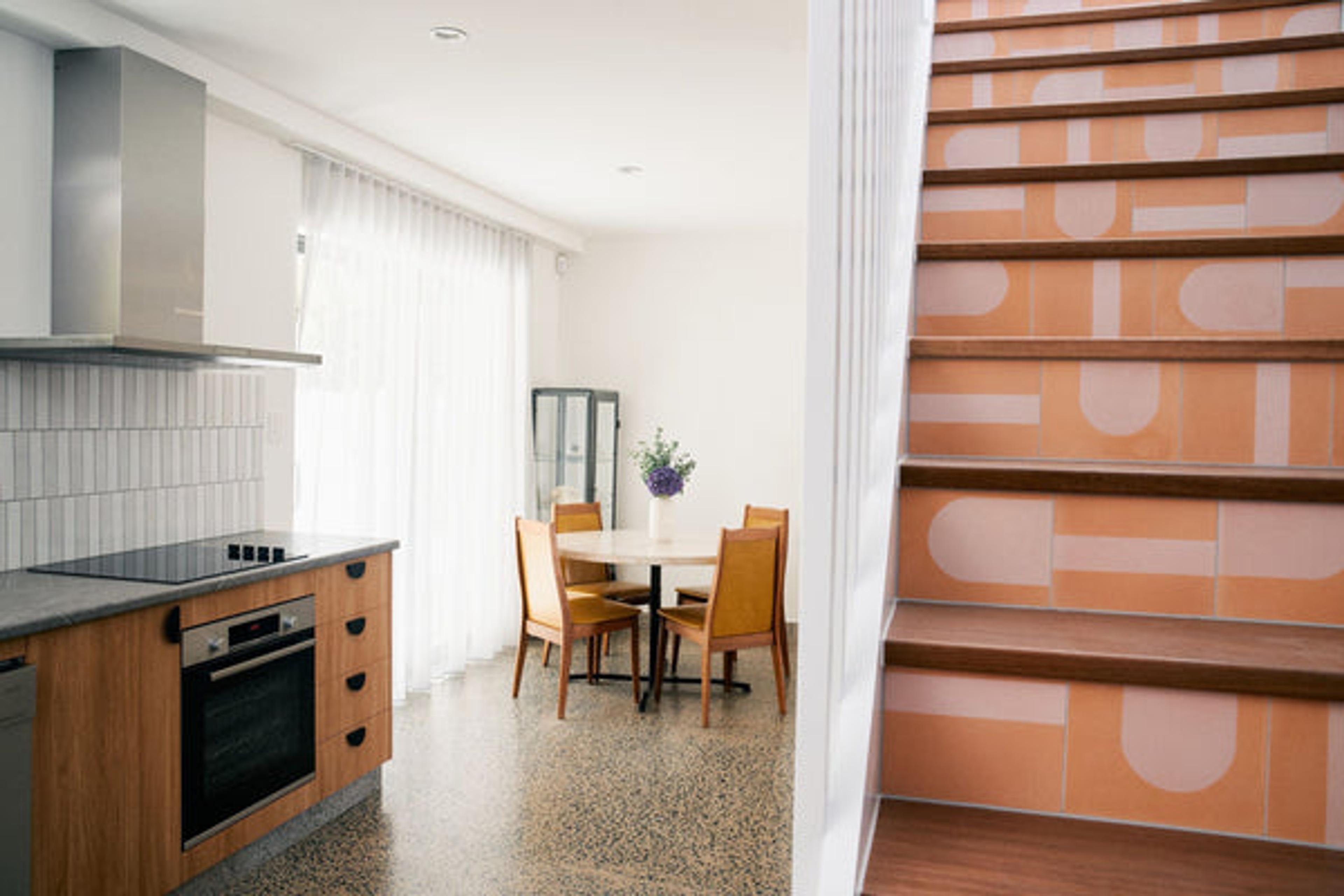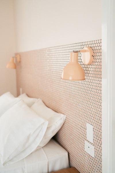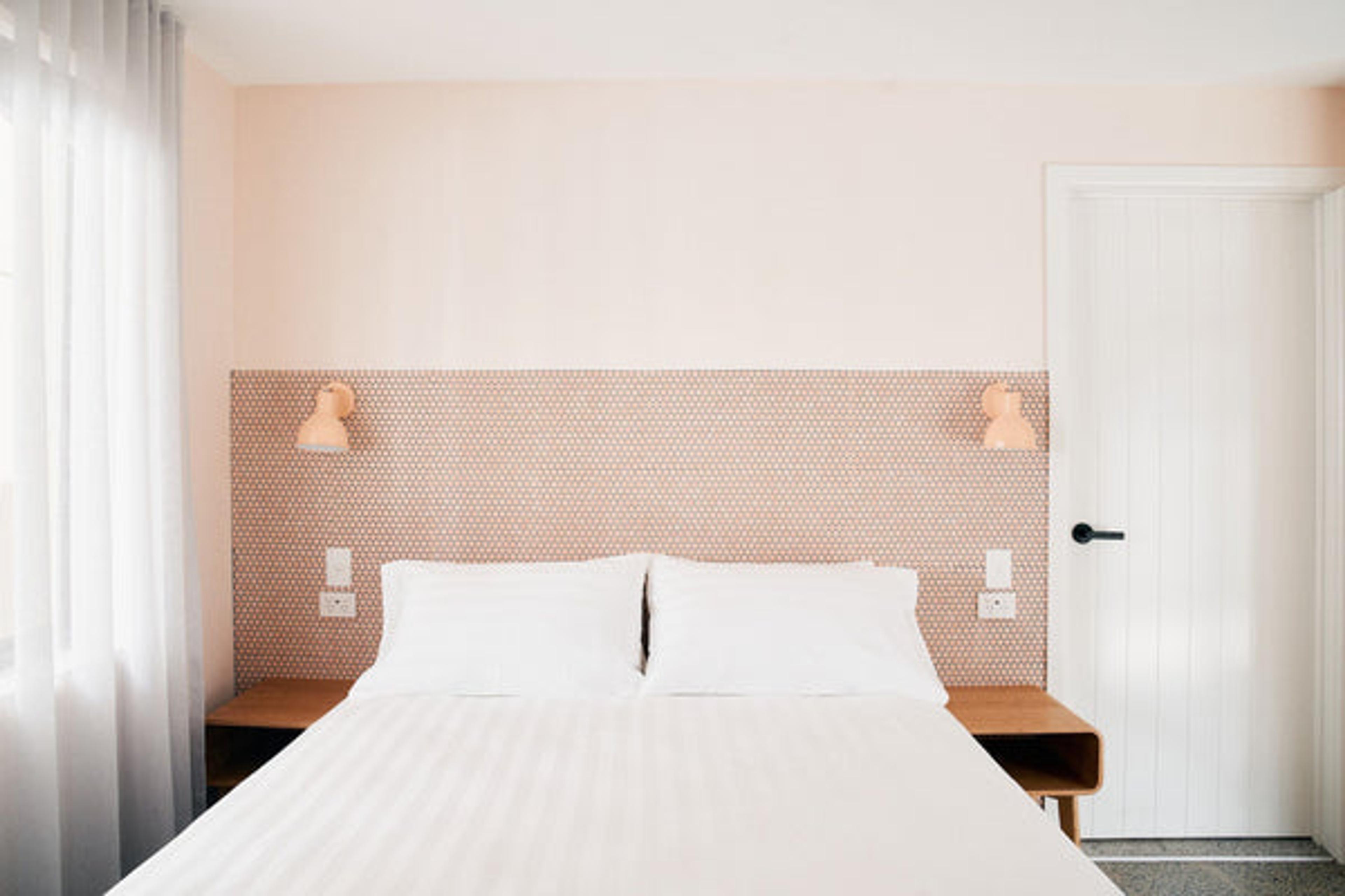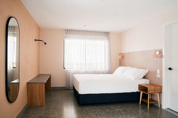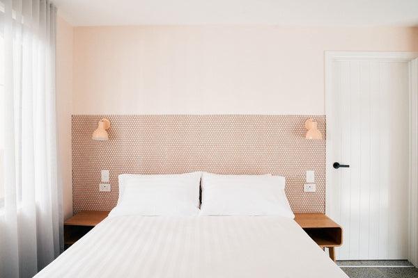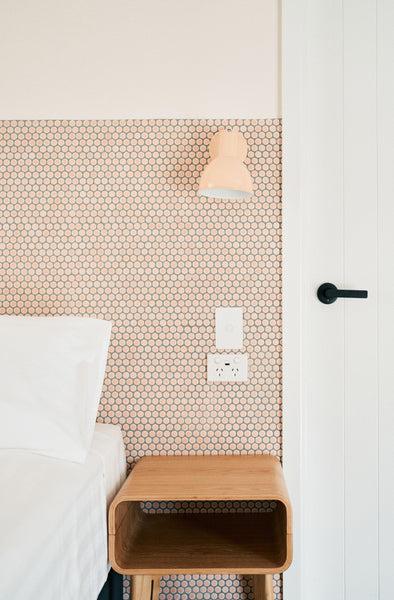 We chose TileCloud for quality and uniqueness. We had a very fun aesthetic in mind and you had options to suit, including the ‘Bangalow’ tile, which we used in The Merillo room to jazz up the staircase and turn it into something visually interesting. The ‘Broadwater Pink Gloss Penny Round’ was the perfect tile to complement the peach hues in the Hilton Archway room. Plus, we figured a tiled bedhead is not only different, it can be cleaned easily, which makes for an extra hygienic space.