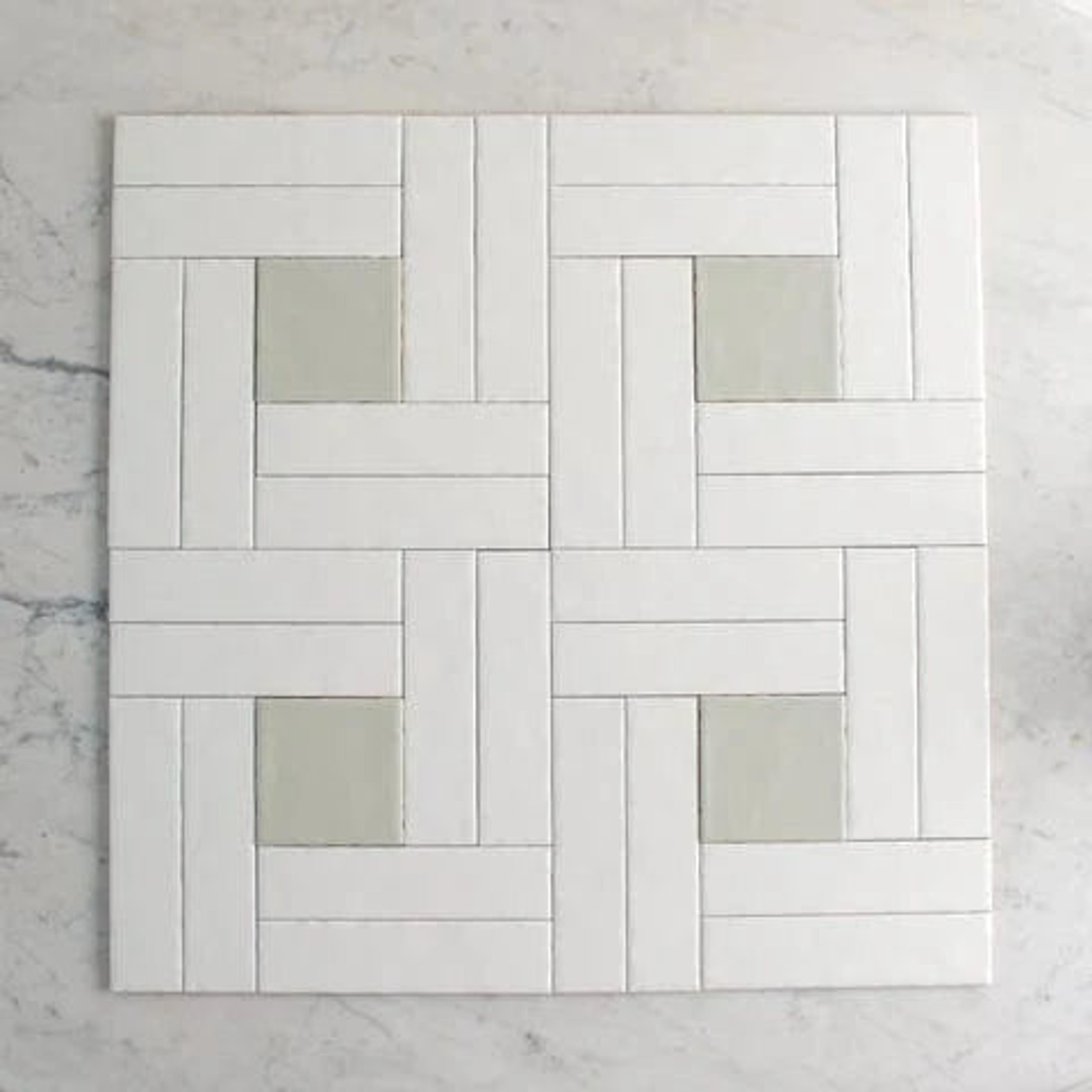 Pinwheel pattern tiles are similar to windmills. In each larger square, four rectangles surround a different-coloured small central square. Usually, the centre will have a darker colour than the outside rectangles. These look best on floors in hallways, bathrooms and kitchens.