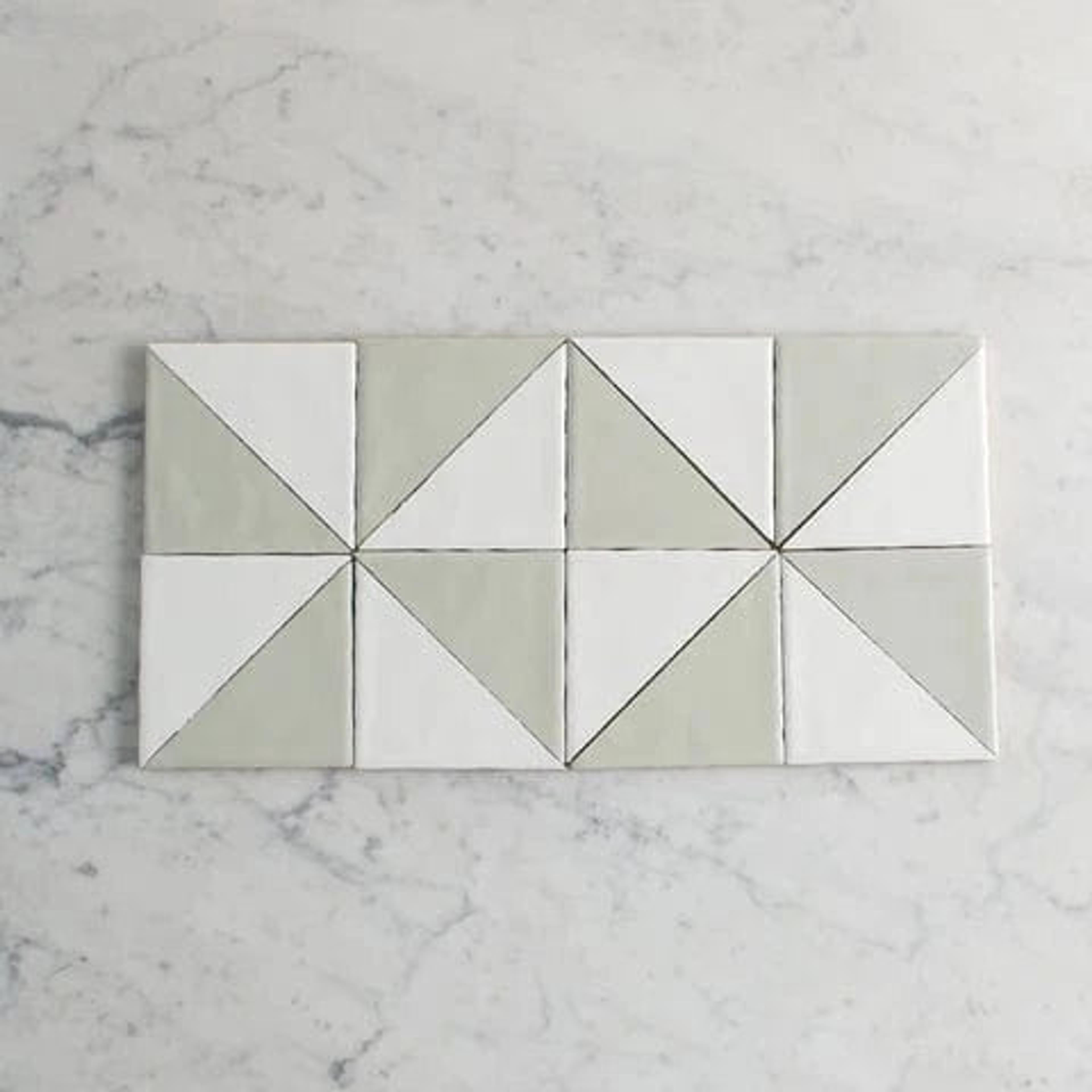 Windmill pattern tiles form a windmill shape with four smaller squares sliced in half diagonally to create right triangles. Contrasting colours highlight this pattern, but you can also opt to colour only a few pieces for a more unusual look. You normally see this pattern on floors, but it can work anywhere.
