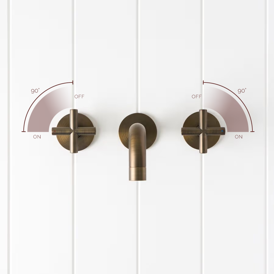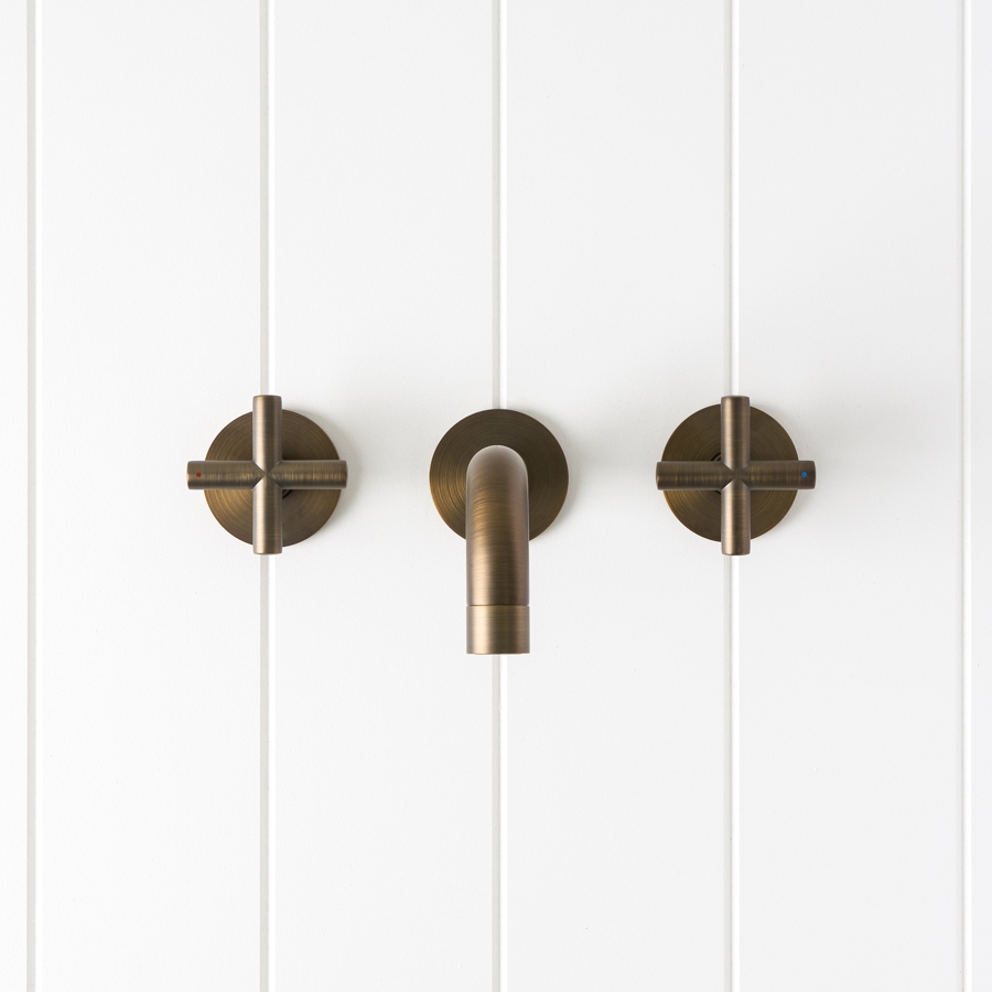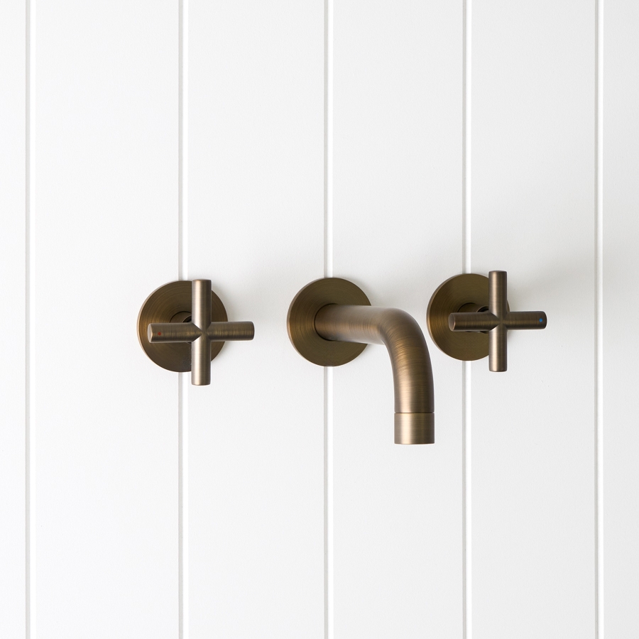 The Sydney Wall Spout and Cross Taps in Antique Brass brings a warm, sculptural moment to the basin or bath wall. The curved wall spout and slim cross taps in Antique Brass over stainless steel feel calm against stone and textured tiles. This three piece tap set adds character while keeping lines clean.