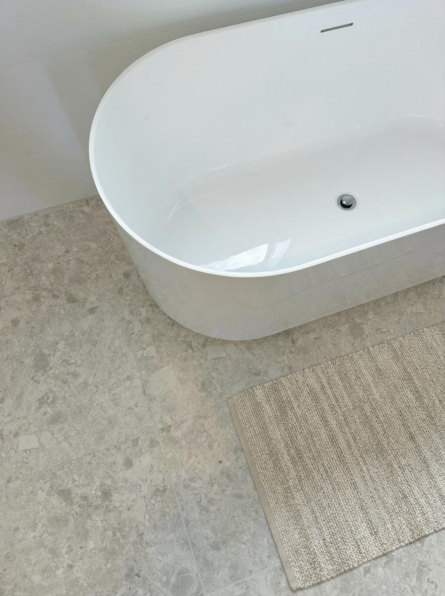 The Stirling White Terrazzo Look Tile layers soft grey and white chips across a calm matte surface, perfect for contemporary homes. Laid from bathroom to living and out to the patio, it creates a seamless flow with gentle texture underfoot. Suitable for floors and walls indoors and outdoors, it pairs beautifully with warm timber, brushed metals and fresh white paint.