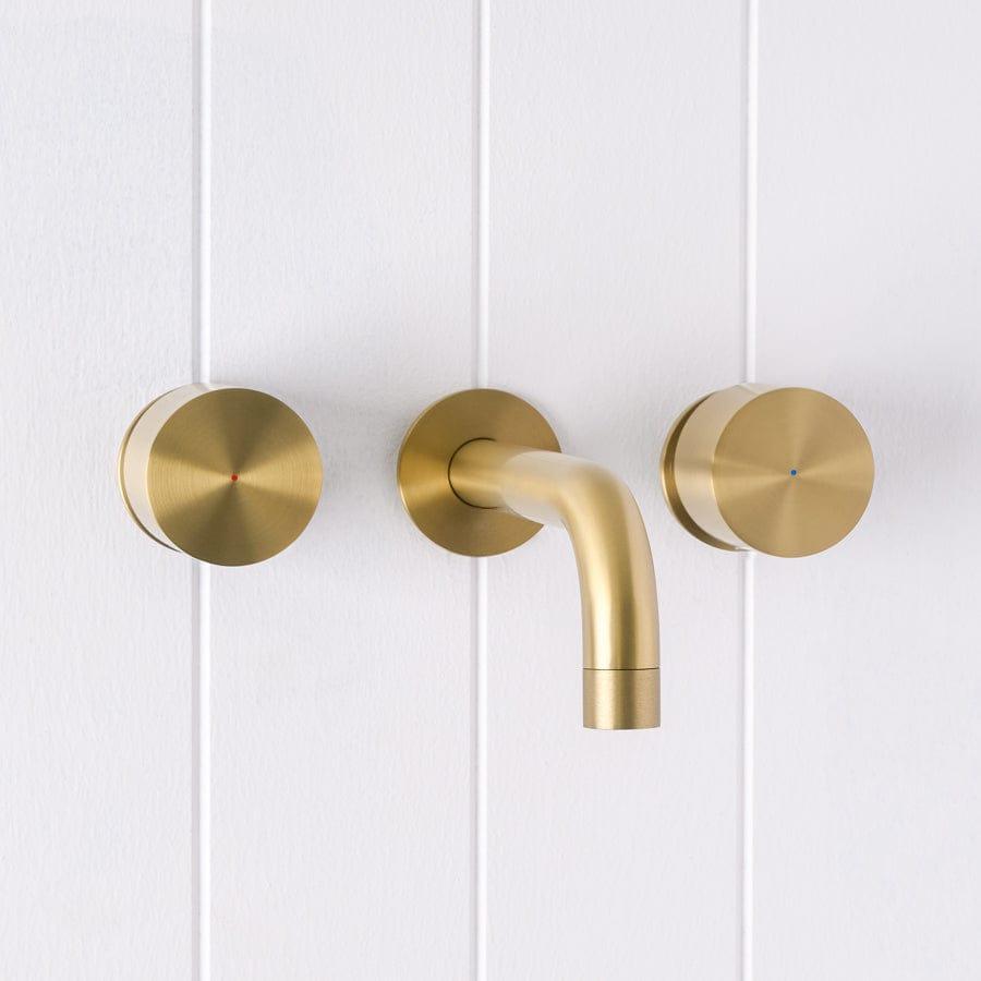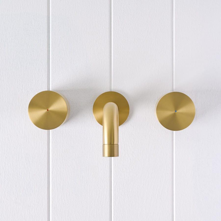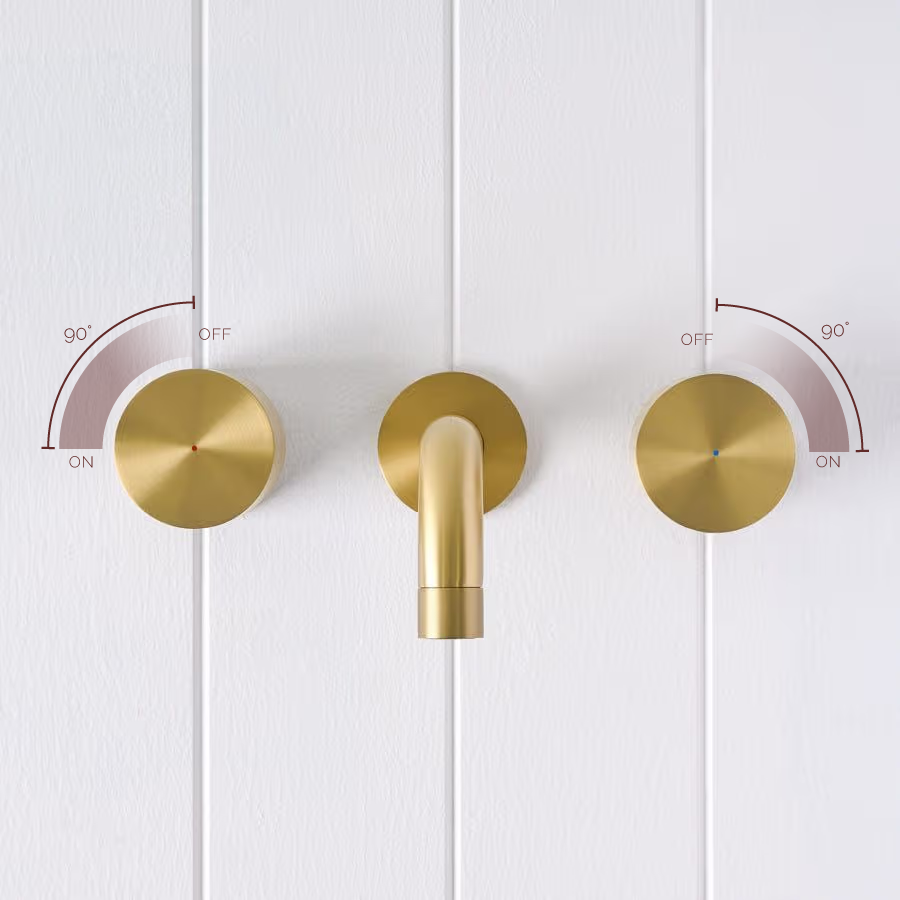The Sydney Wall Spout and Round Wall Taps in Brushed Brass adds soft glow and simple geometry to bathroom walls. The brushed finish over stainless steel feels calm against warm tiles and timber, while the curved spout creates a gentle water fall into the basin. This set gives a considered focal point without visual clutter.