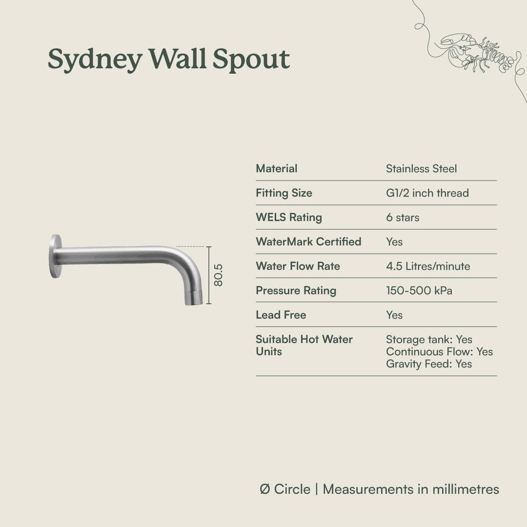 The Sydney Wall Spout and Round Wall Taps in Brushed Brass adds soft glow and simple geometry to bathroom walls. The brushed finish over stainless steel feels calm against warm tiles and timber, while the curved spout creates a gentle water fall into the basin. This set gives a considered focal point without visual clutter.
