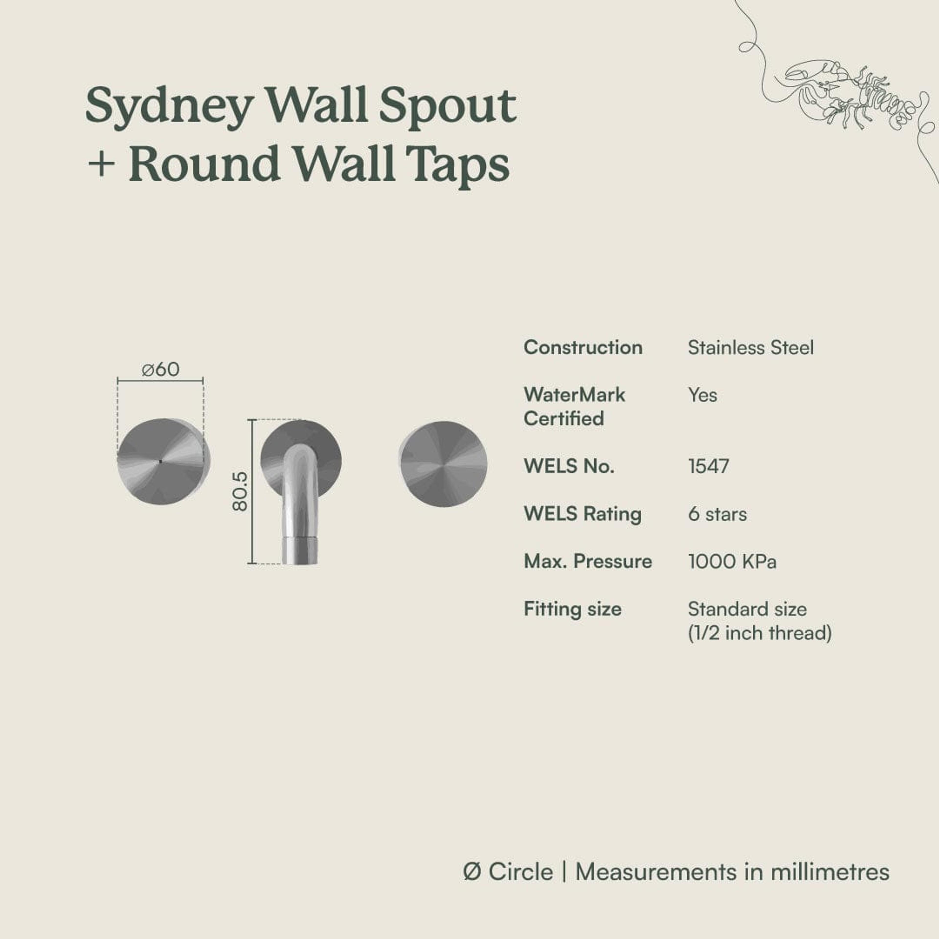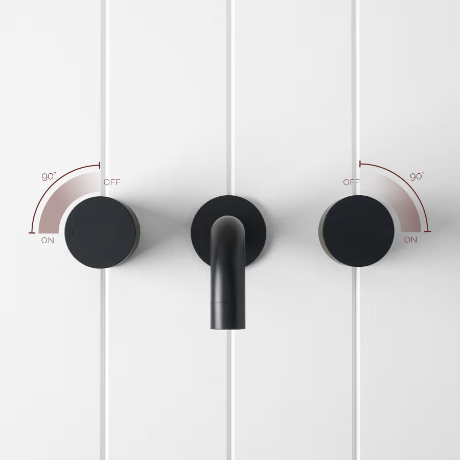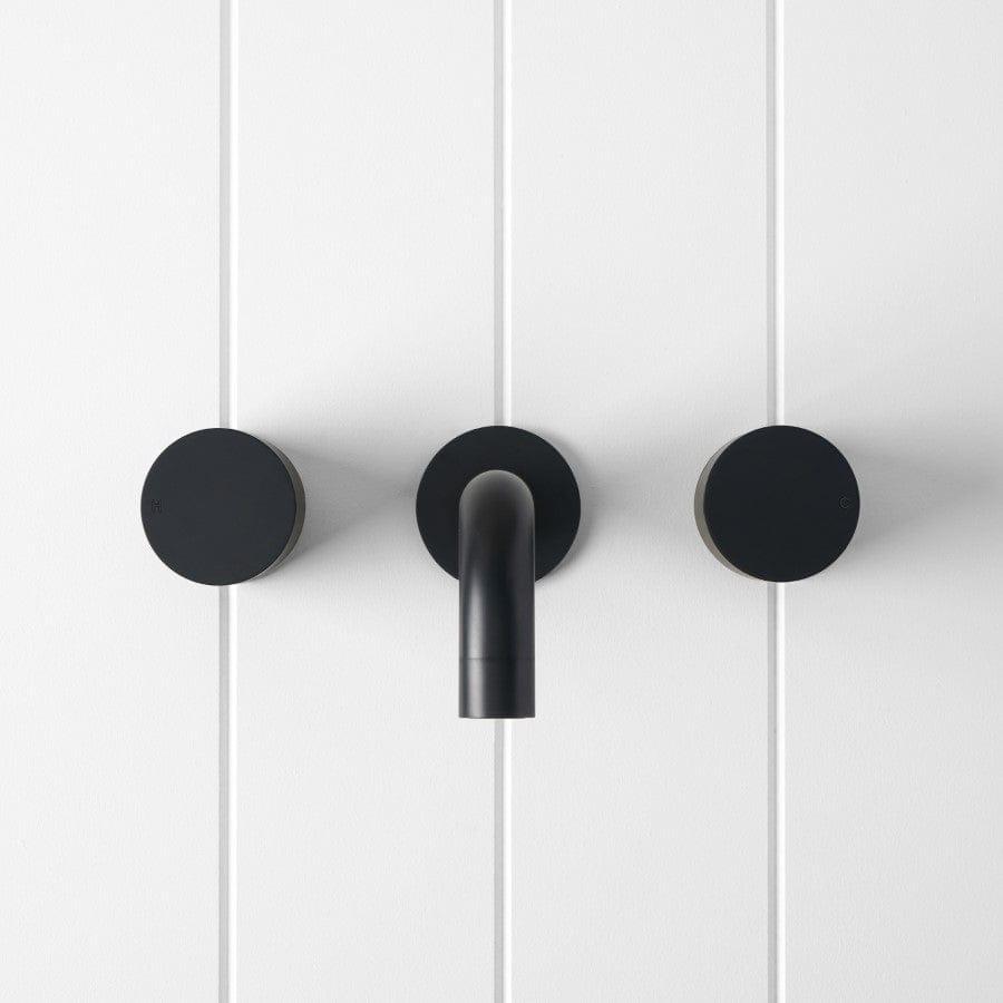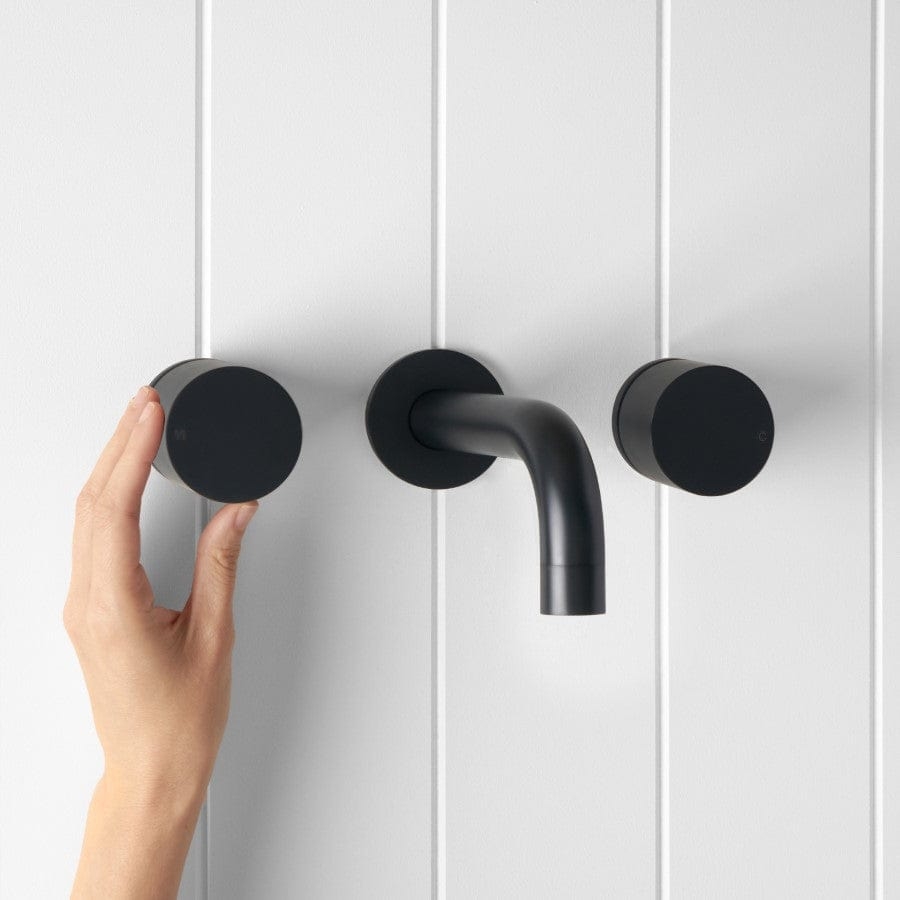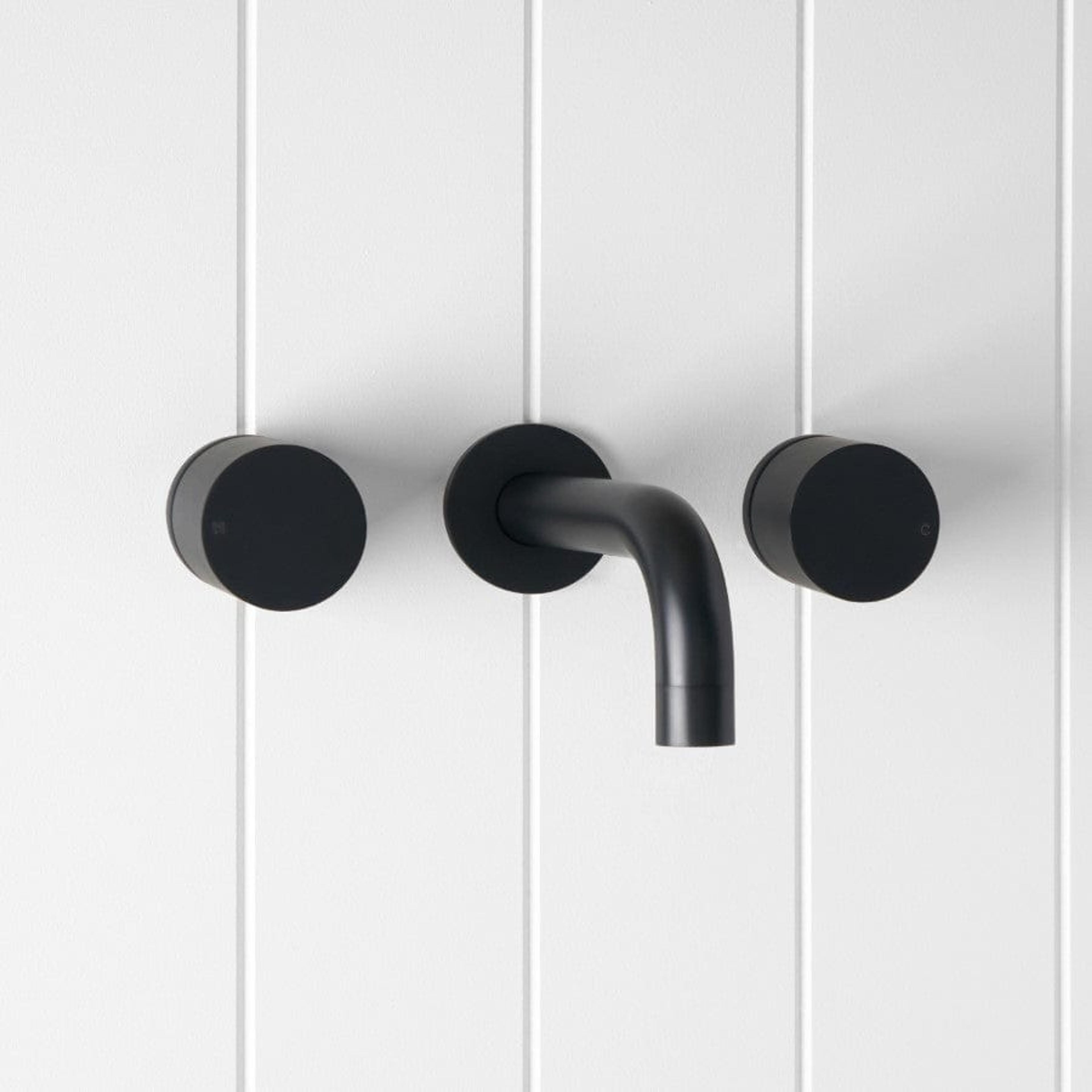 The Sydney Wall Spout and Round Wall Taps in Matte Black adds confident contrast and crisp circles to the wall. The curved spout and round taps in Matte Black sit sharply against white or textured tiles, creating a calm but striking basin or bath feature. It completes a considered black tapware story.