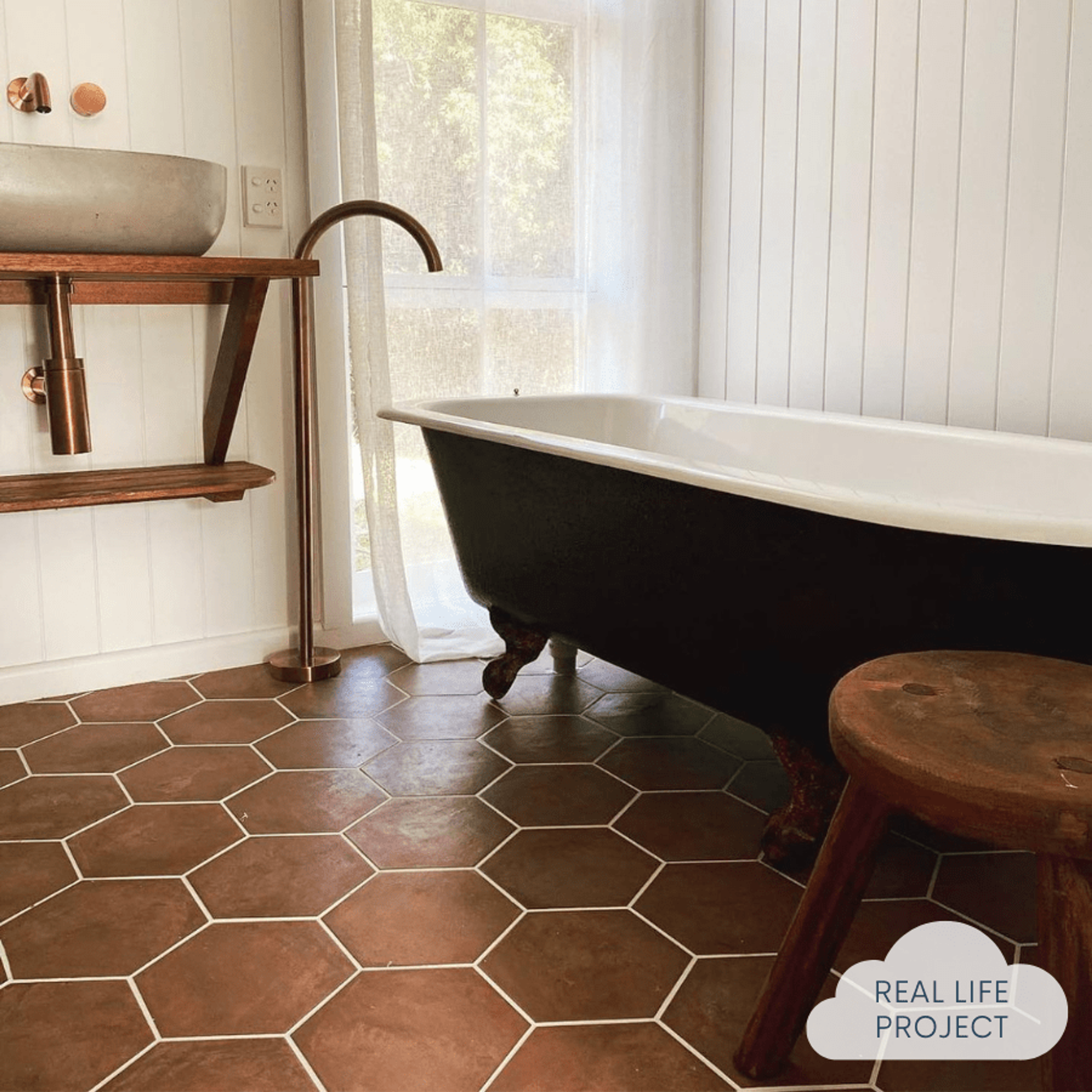 The Boat Harbour Beach Terracotta Encaustic Look Hexagon Tile brings a warm, textural charm to any space. Its encaustic design and hexagonal shape create a layered, inviting atmosphere, perfect for adding a touch of Australian style to your home. Ideal for those seeking a relaxed yet refined look.