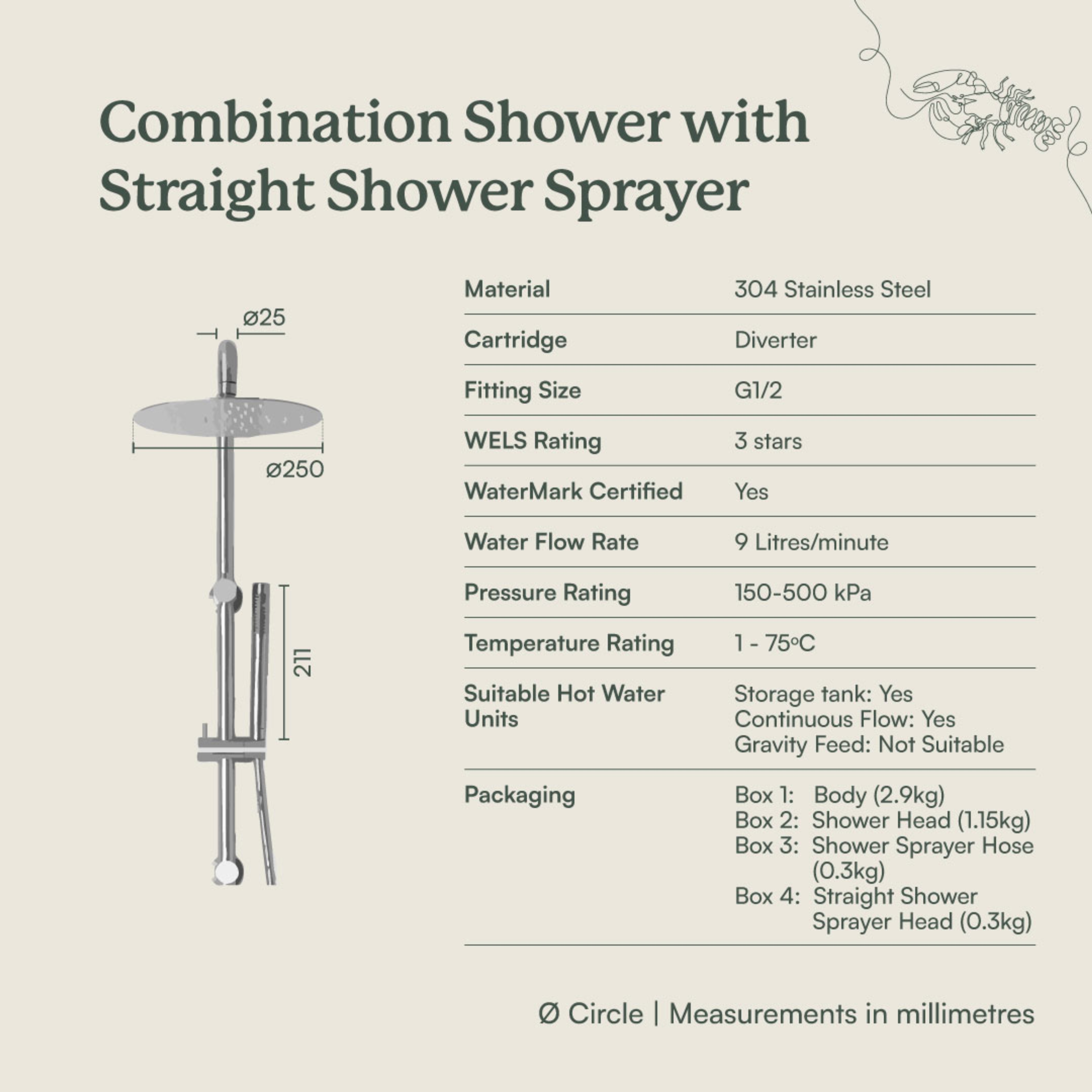 The combination shower has a diverter that is located on the shower rail.The combination shower requires taps or mixer to be purchased separately. Options linked below.