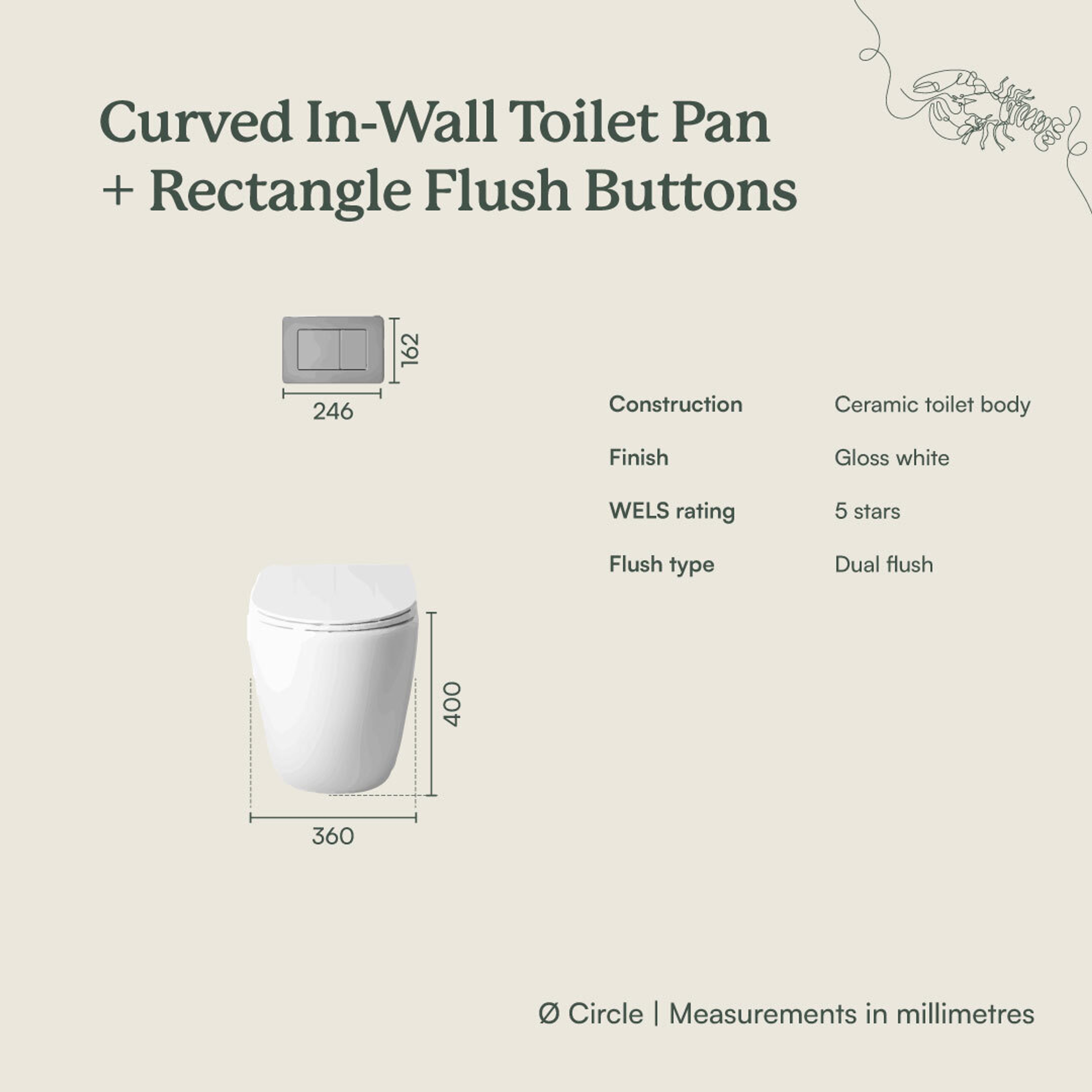 | Construction | Ceramic toilet body In-wall cistern compatible with Yabby flush buttons only |
