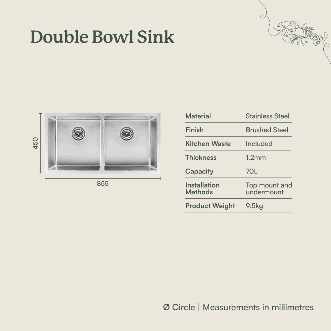 The Double Bowl Sink 855x450mm Stainless Steel brings a refined touch to your kitchen space. As part of our SINK collection, this double sink combines functionality with a sleek design, enhancing the textural depth of your home. Experience a harmonious blend of practicality and style, perfect for creating a warm, inviting atmosphere.