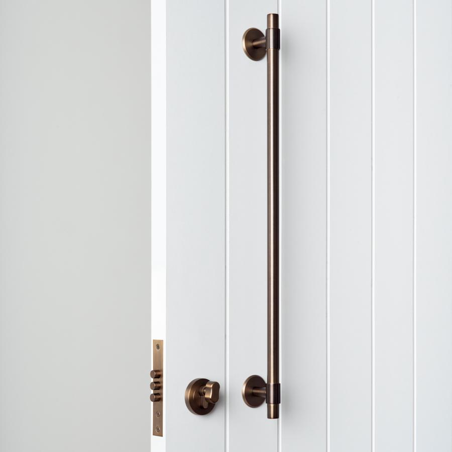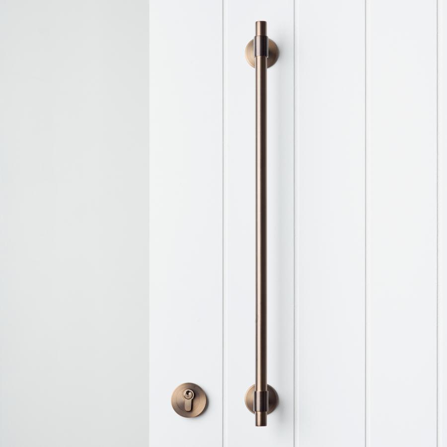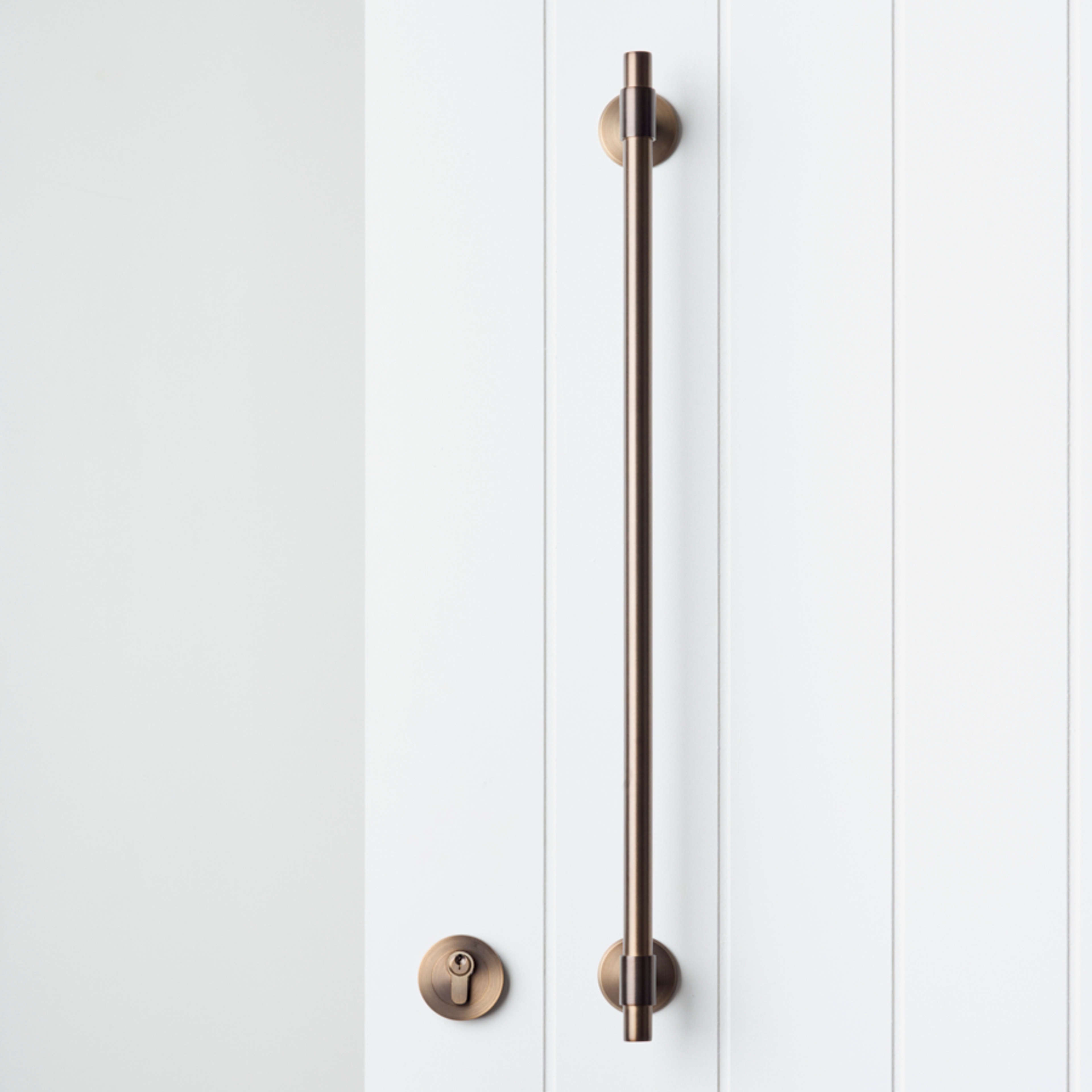 The Front Door Double Side Pull Handle with Lock Set in Antique Brass blends timeless style with everyday practicality. The warm antique finish adds depth and character to your entryway, while the durable construction ensures smooth, reliable performance. Designed for longevity, this complete set includes two matching pulls (one for each side of your door), a lock, and keys.