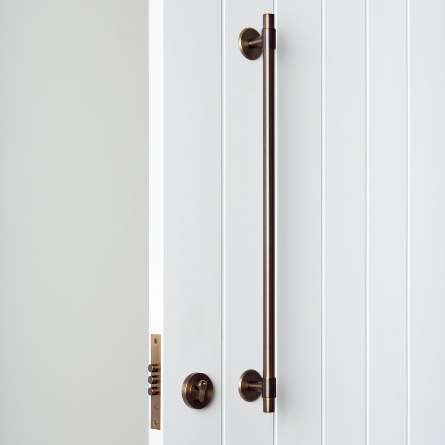 The Front Door Double Side Pull Handle with Lock Set in Antique Brass blends timeless style with everyday practicality. The warm antique finish adds depth and character to your entryway, while the durable construction ensures smooth, reliable performance. Designed for longevity, this complete set includes two matching pulls (one for each side of your door), a lock, and keys.