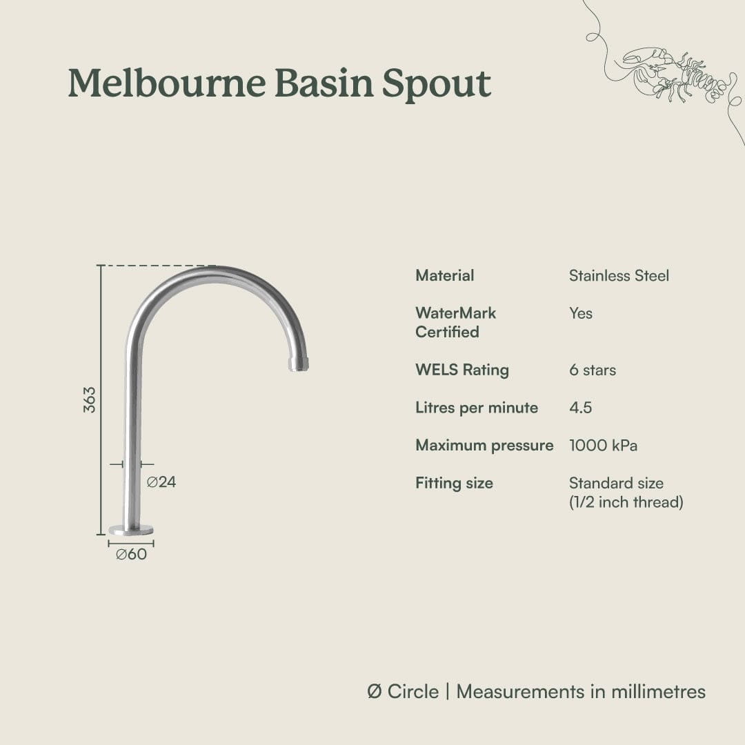The Melbourne Basin Spout in Antique Brass brings warmth and character to your bathroom design. Its soft, aged tone pairs beautifully with natural textures and classic finishes. Crafted from durable stainless steel, it balances modern function with timeless appeal.