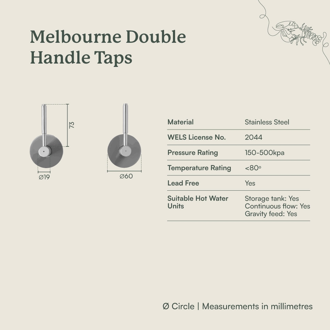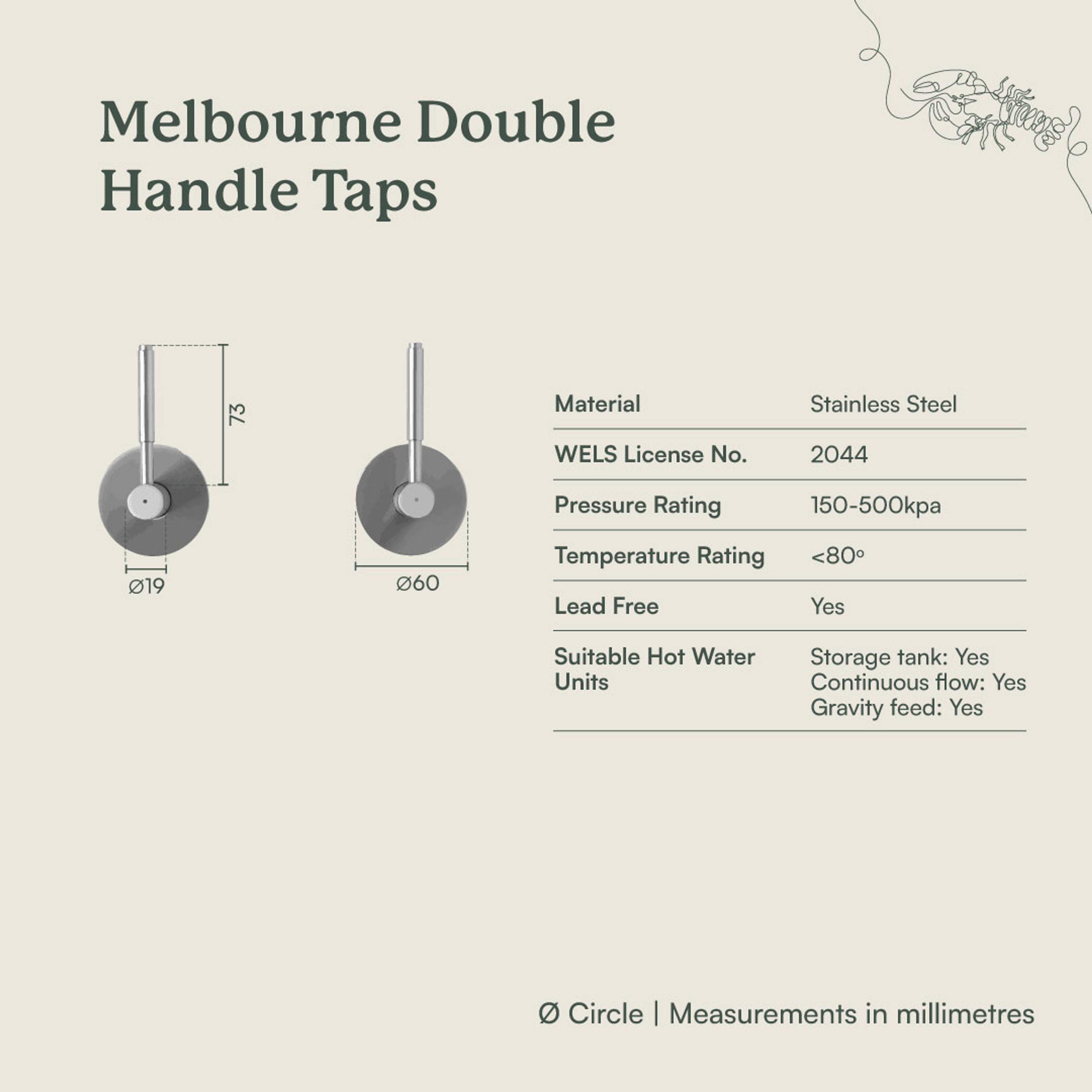 The Melbourne Double Handle Taps in Warm Brushed Nickel bring a warm, classic touch to your bathroom or powder room, offering simple and intuitive control over your hot and cold water. Their timeless design adds a soft farmhouse feel, helping create a space that feels comfortable and lived-in.