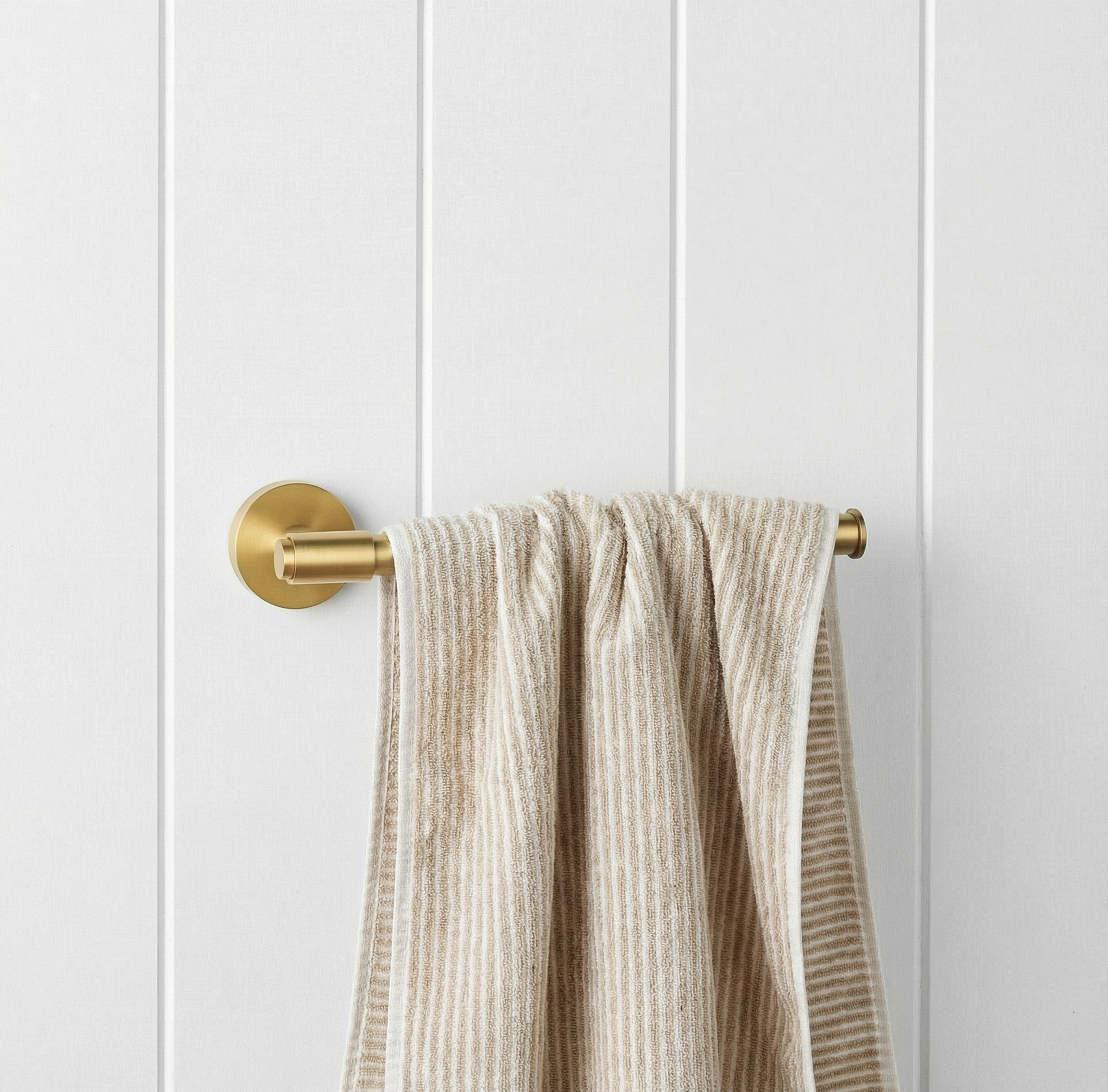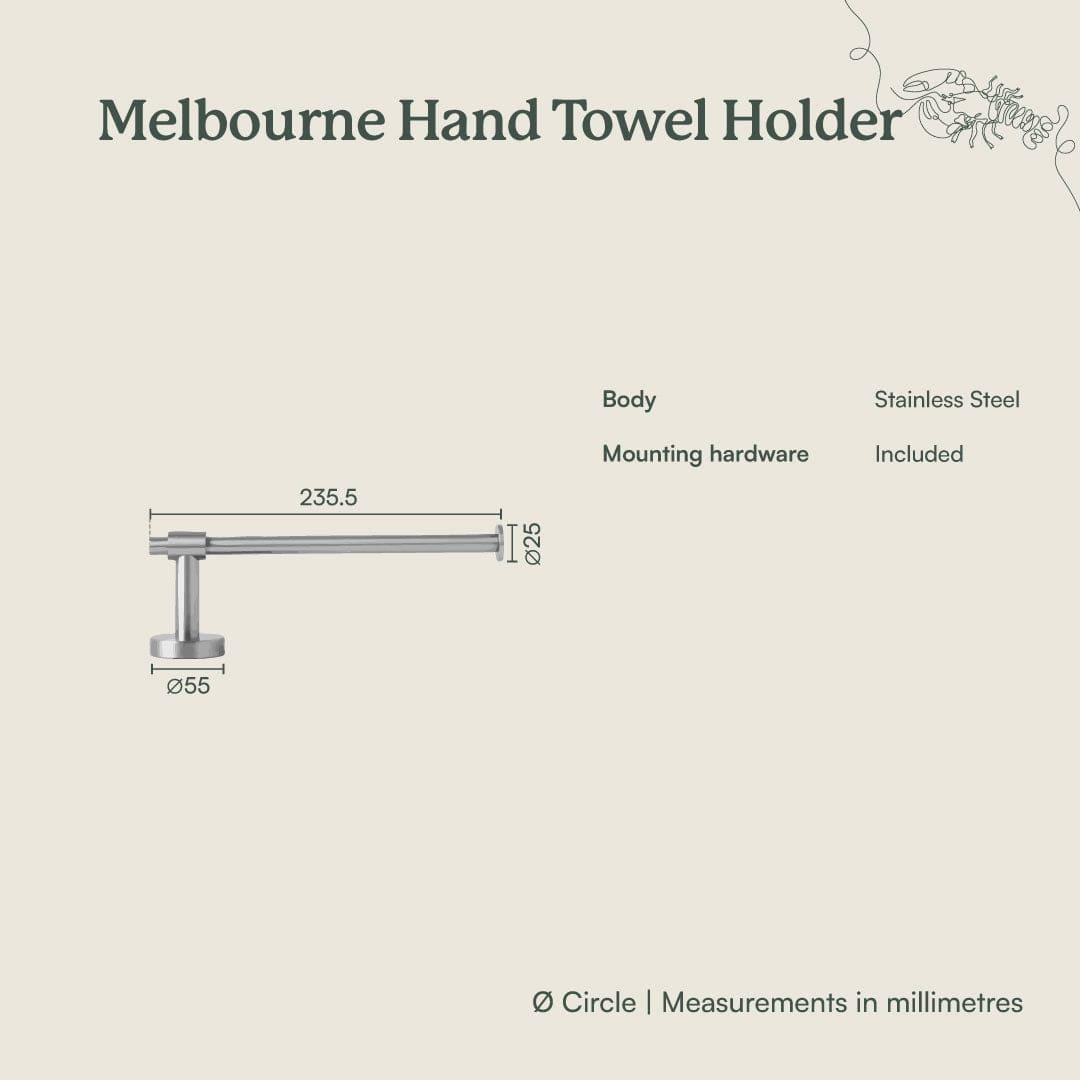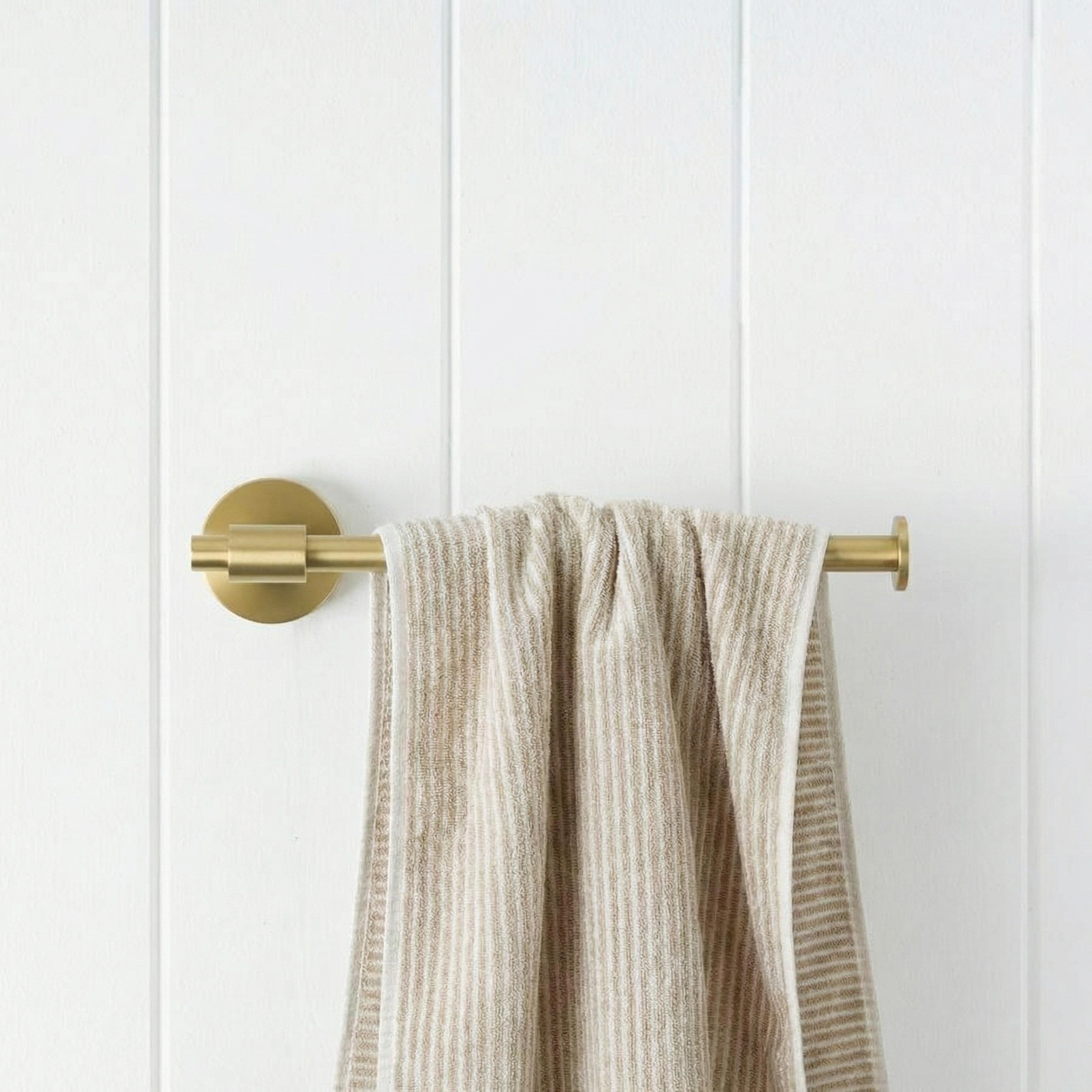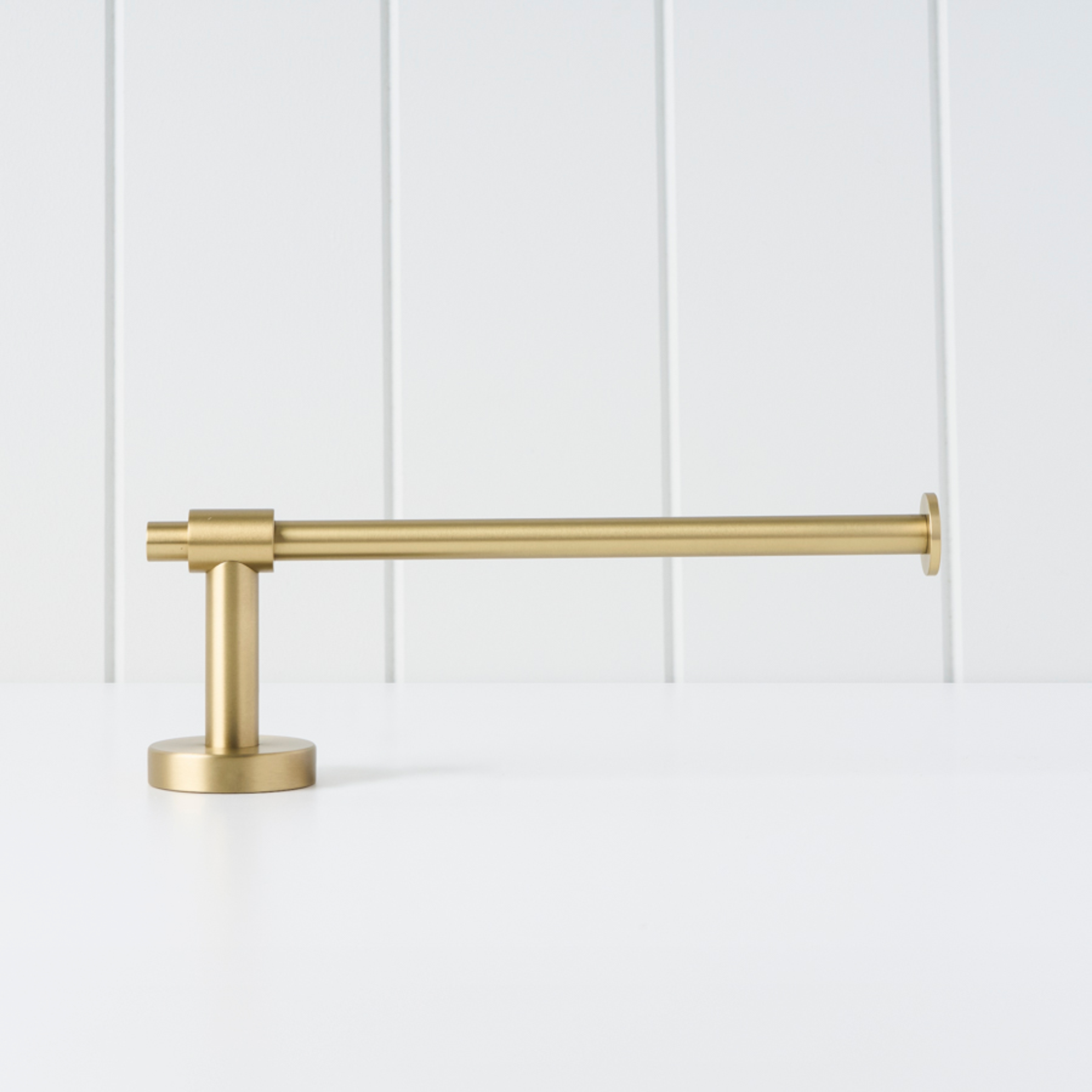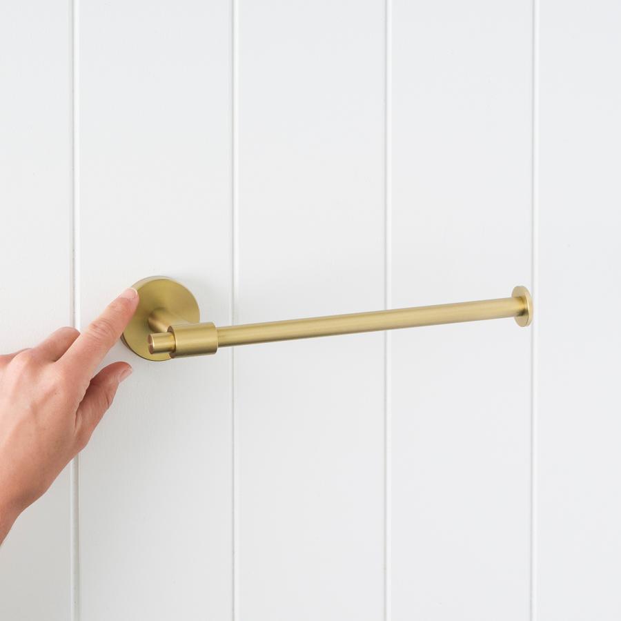 The Melbourne Hand Towel Holder in Brushed Brass is designed to keep your everyday essentials within easy reach, making it perfect for placing beside a vanity or basin in a bathroom or powder room. Sized specifically for a hand towel, it offers a simple and practical way to keep your space tidy and organised.