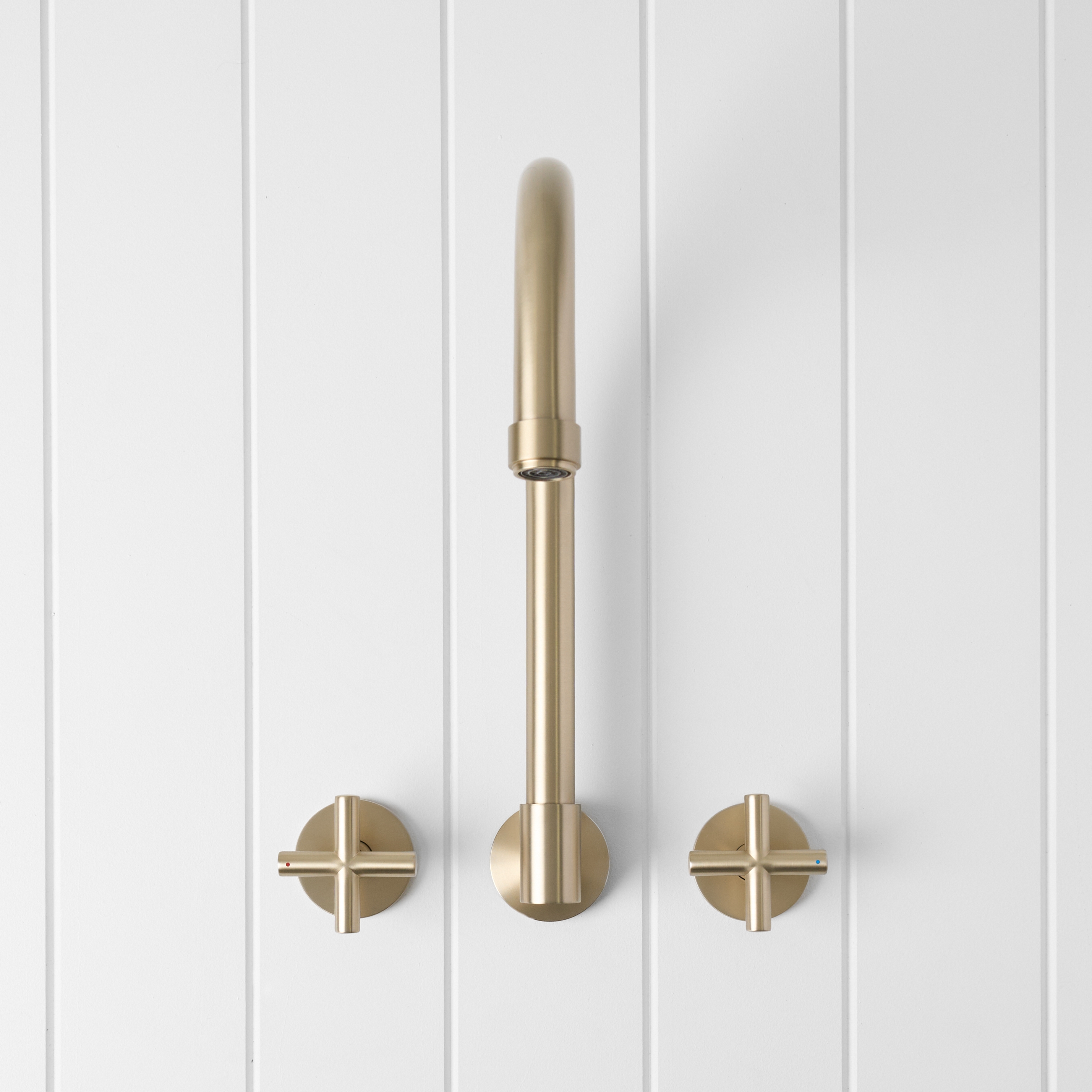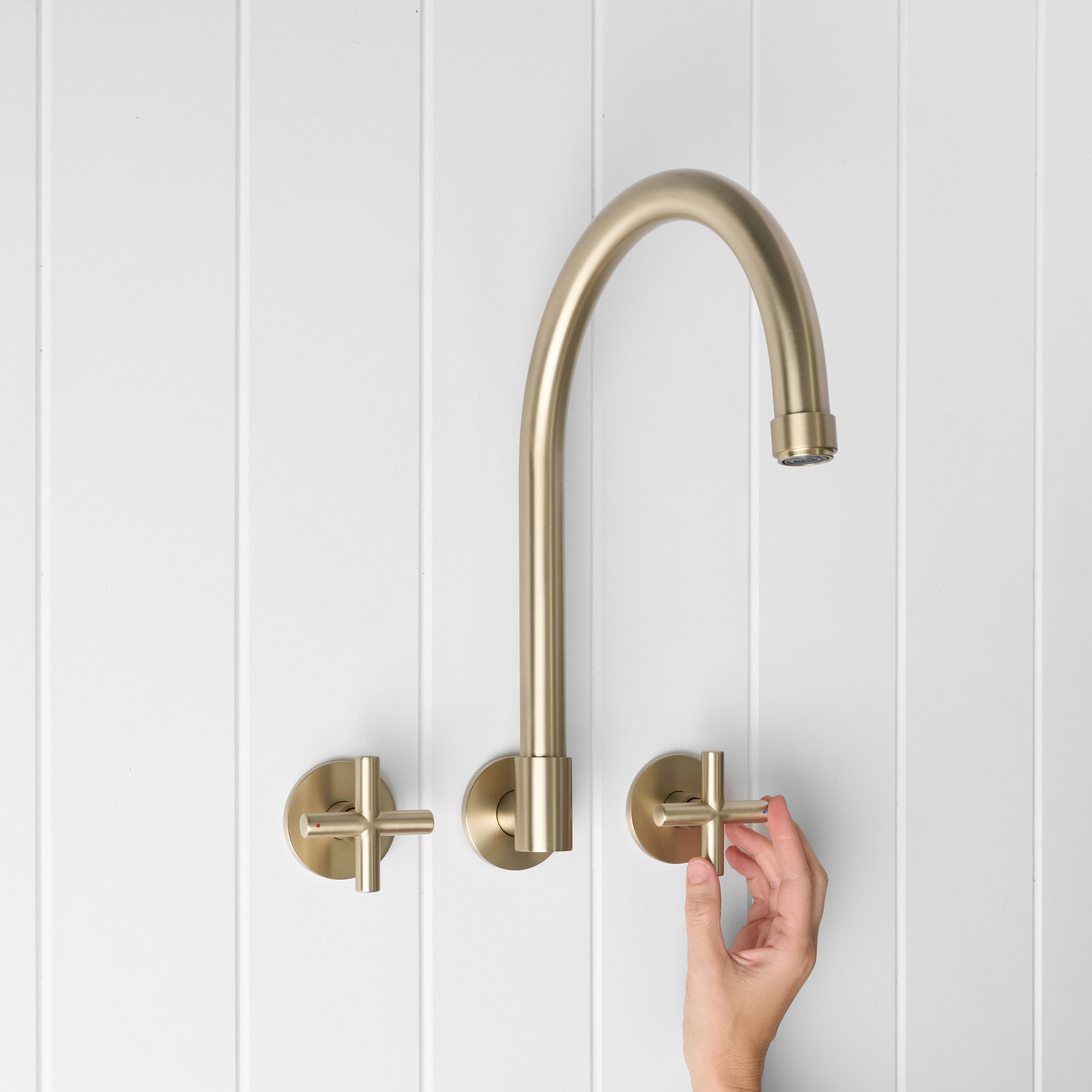 The Melbourne Swivel Spout + Cross Taps Warm Brushed Nickel combines a soft gooseneck profile with practical flexibility, offering a refined solution for compact spaces. Wall-mounted and designed to swivel up to 180 degrees, it allows you to adjust the direction of the water flow to suit your setup.