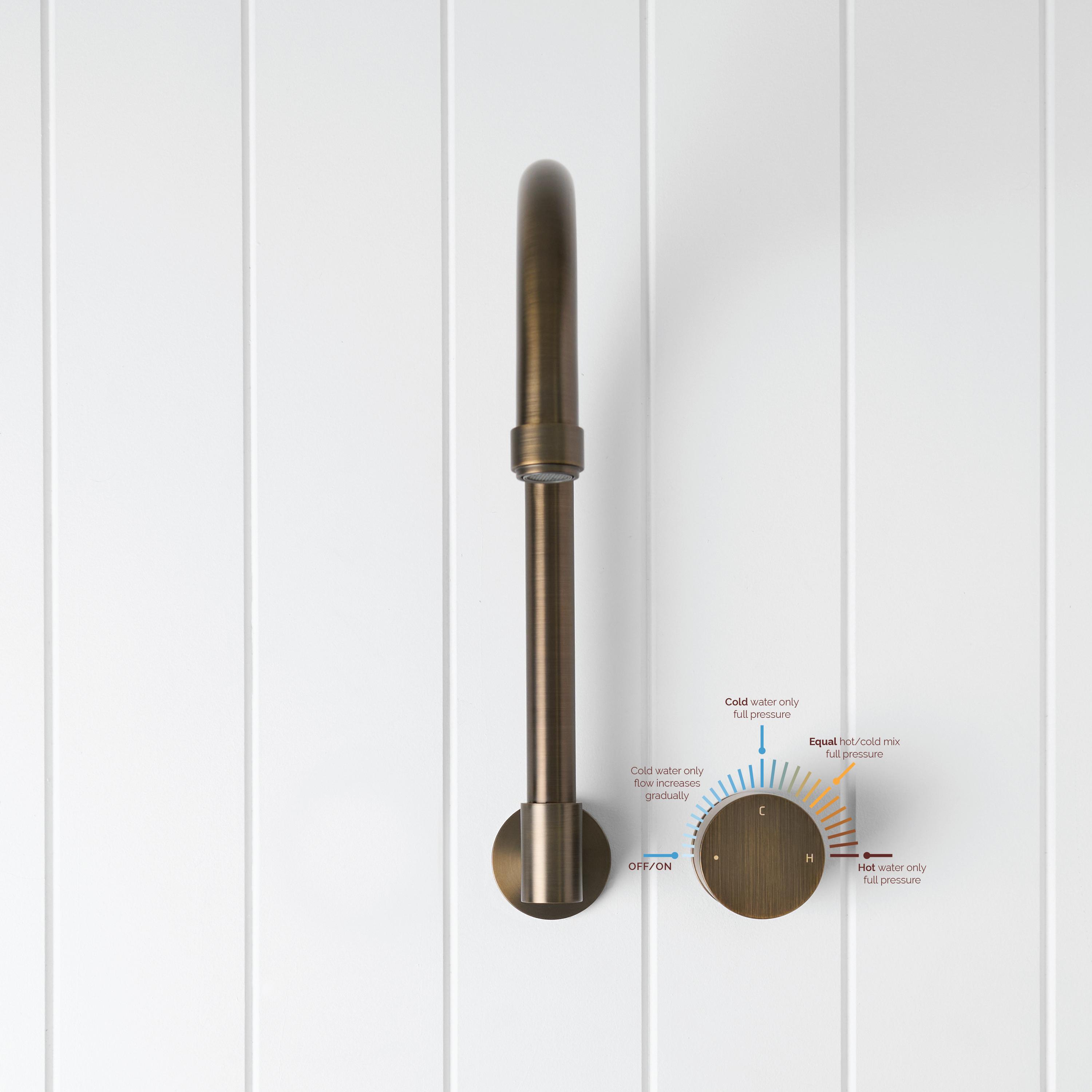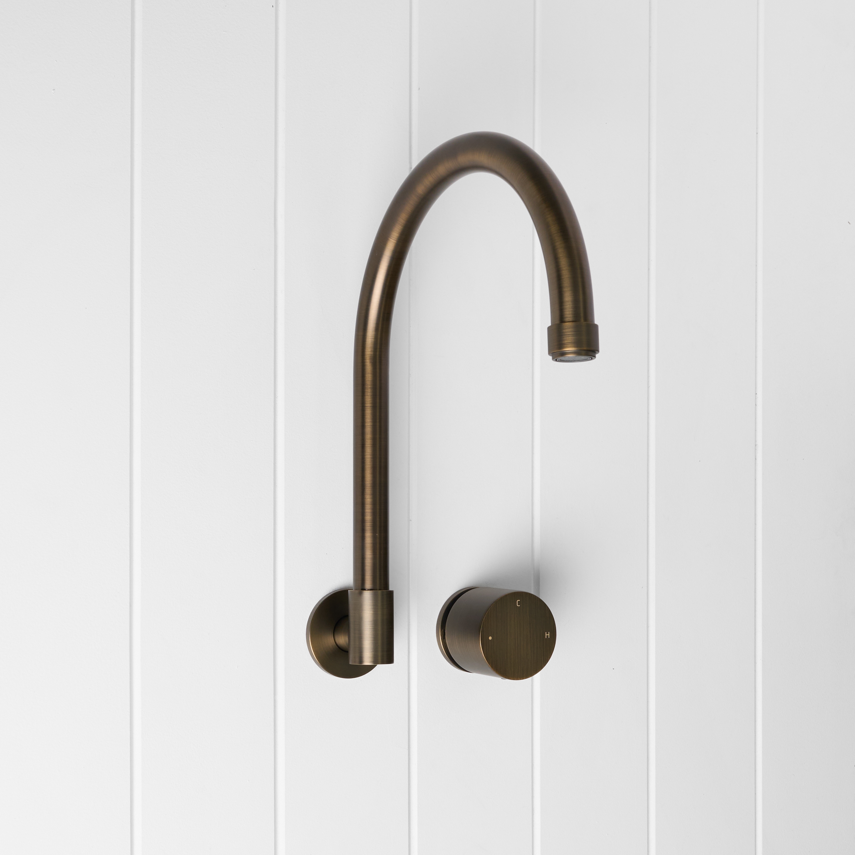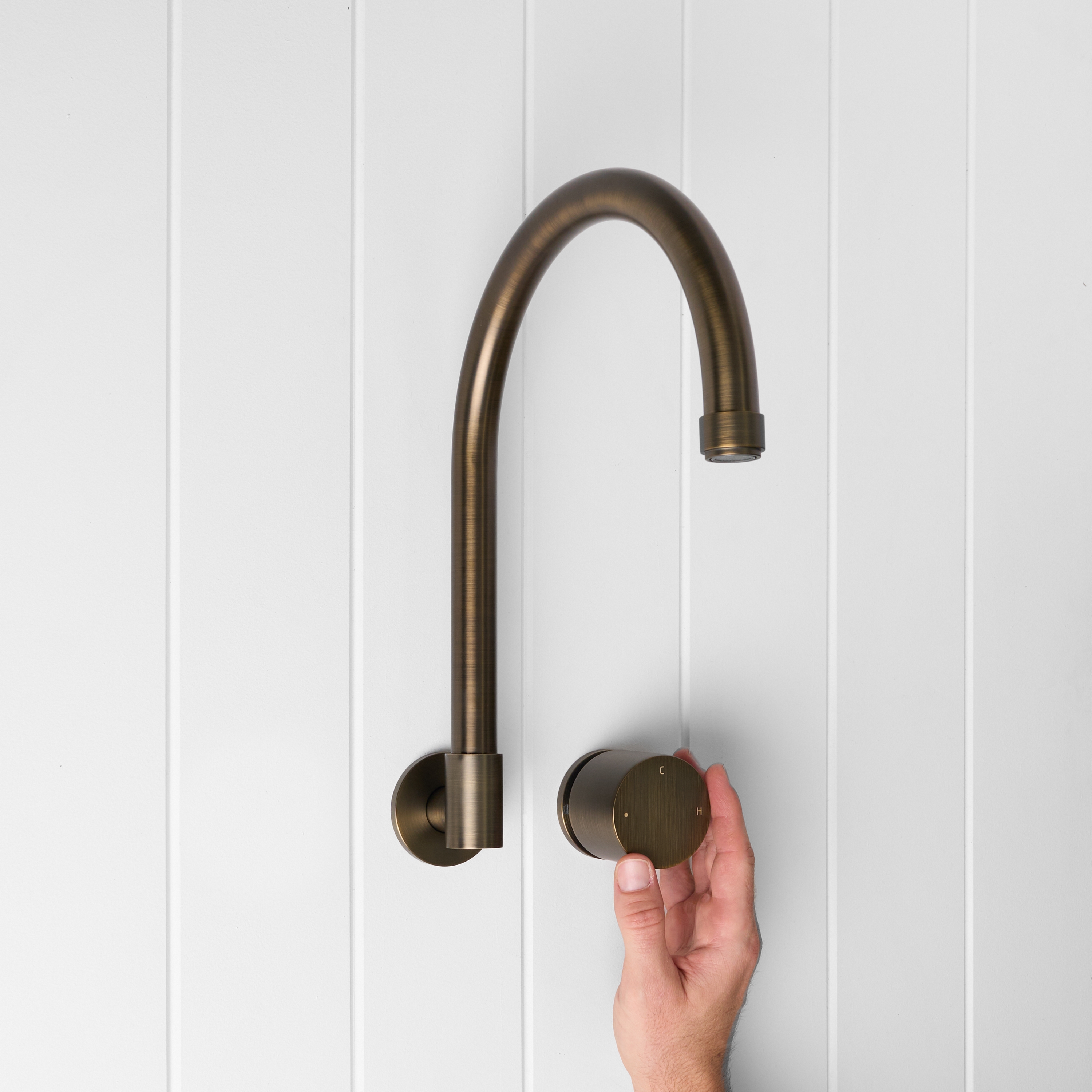The Melbourne Swivel Spout + Progressive Mixer Antique Brass combines a soft gooseneck profile with practical flexibility, offering a refined solution for compact spaces. Wall-mounted and designed to swivel up to 180 degrees, it allows you to adjust the direction of the water flow to suit your setup.