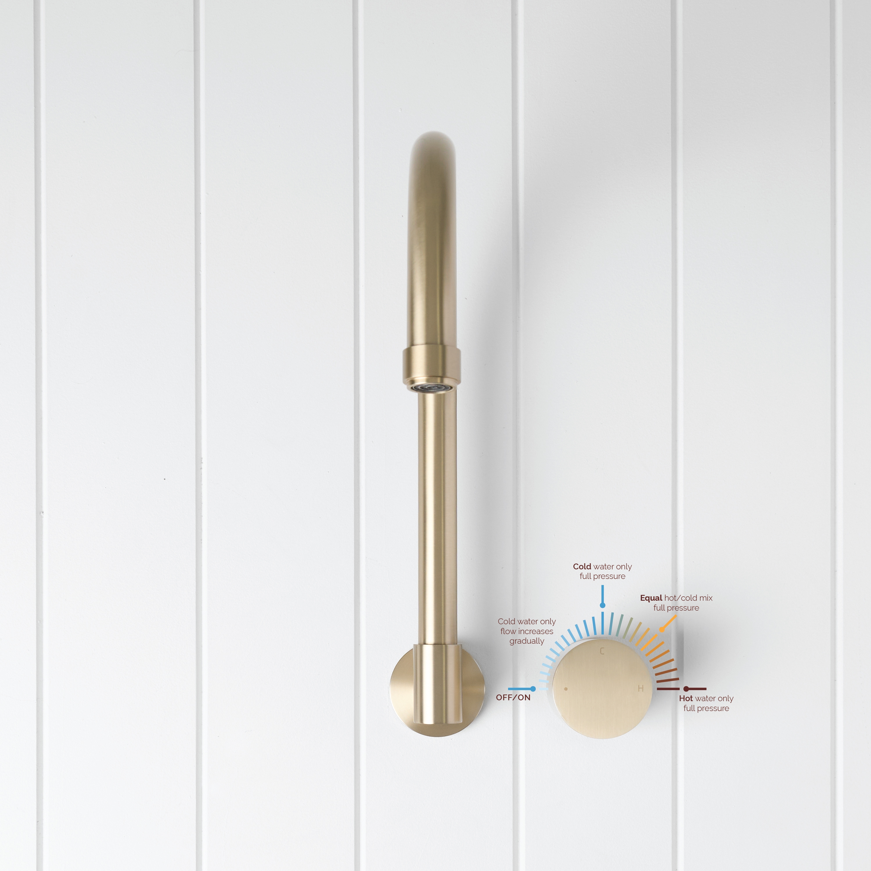 The Melbourne Swivel Spout + Progressive Mixer Warm Brushed Nickel combines a soft gooseneck profile with practical flexibility, offering a refined solution for compact spaces. Wall-mounted and designed to swivel up to 180 degrees, it allows you to adjust the direction of the water flow to suit your setup.