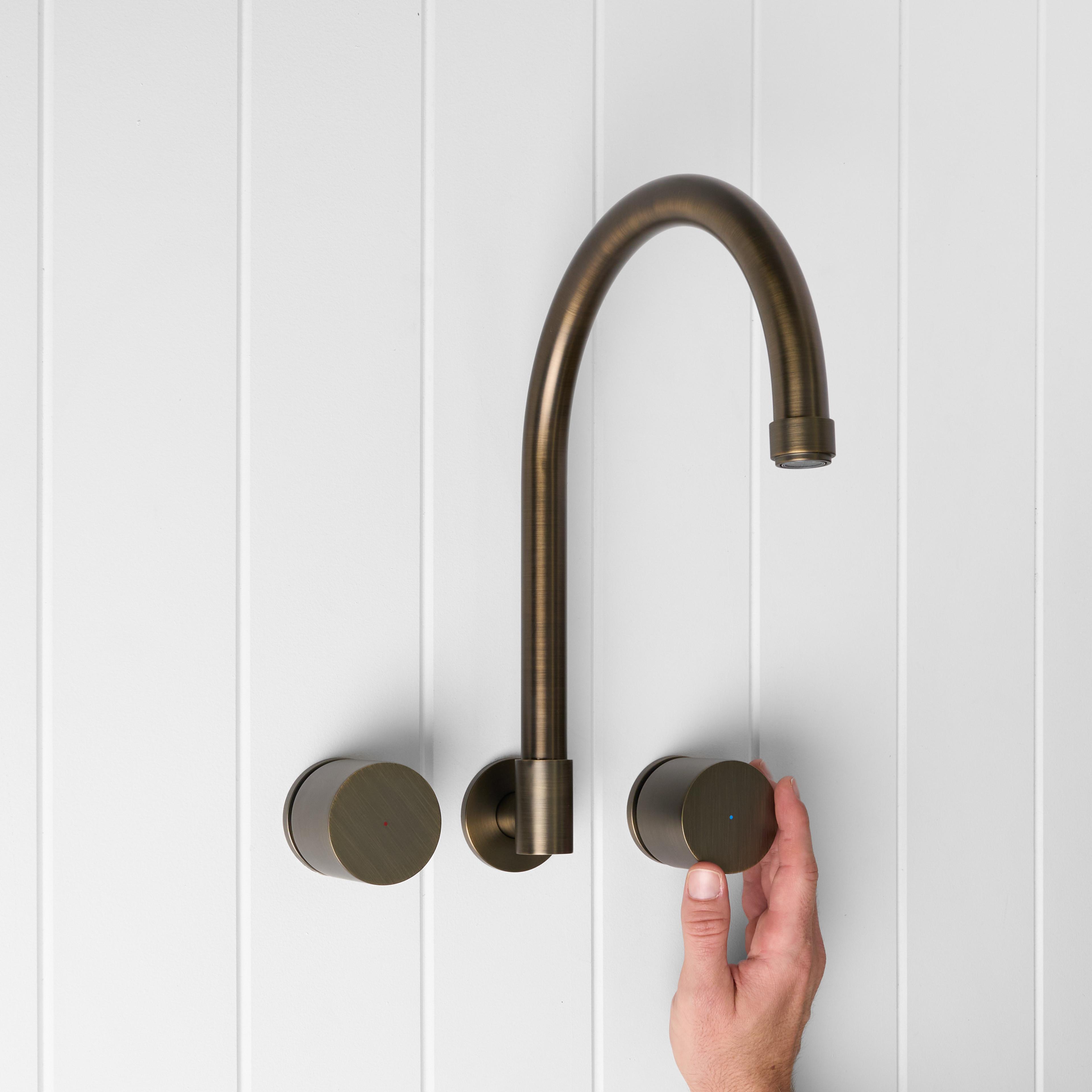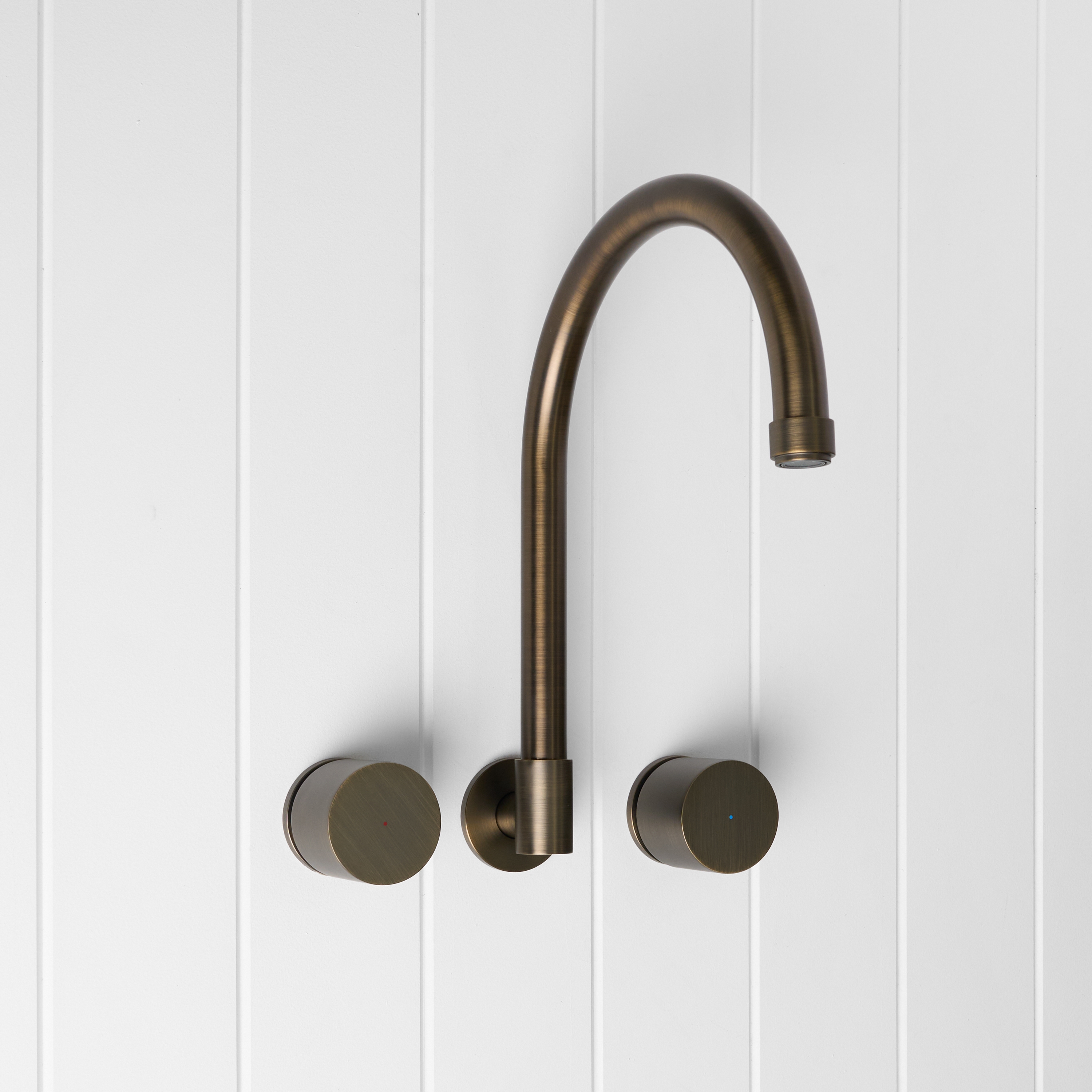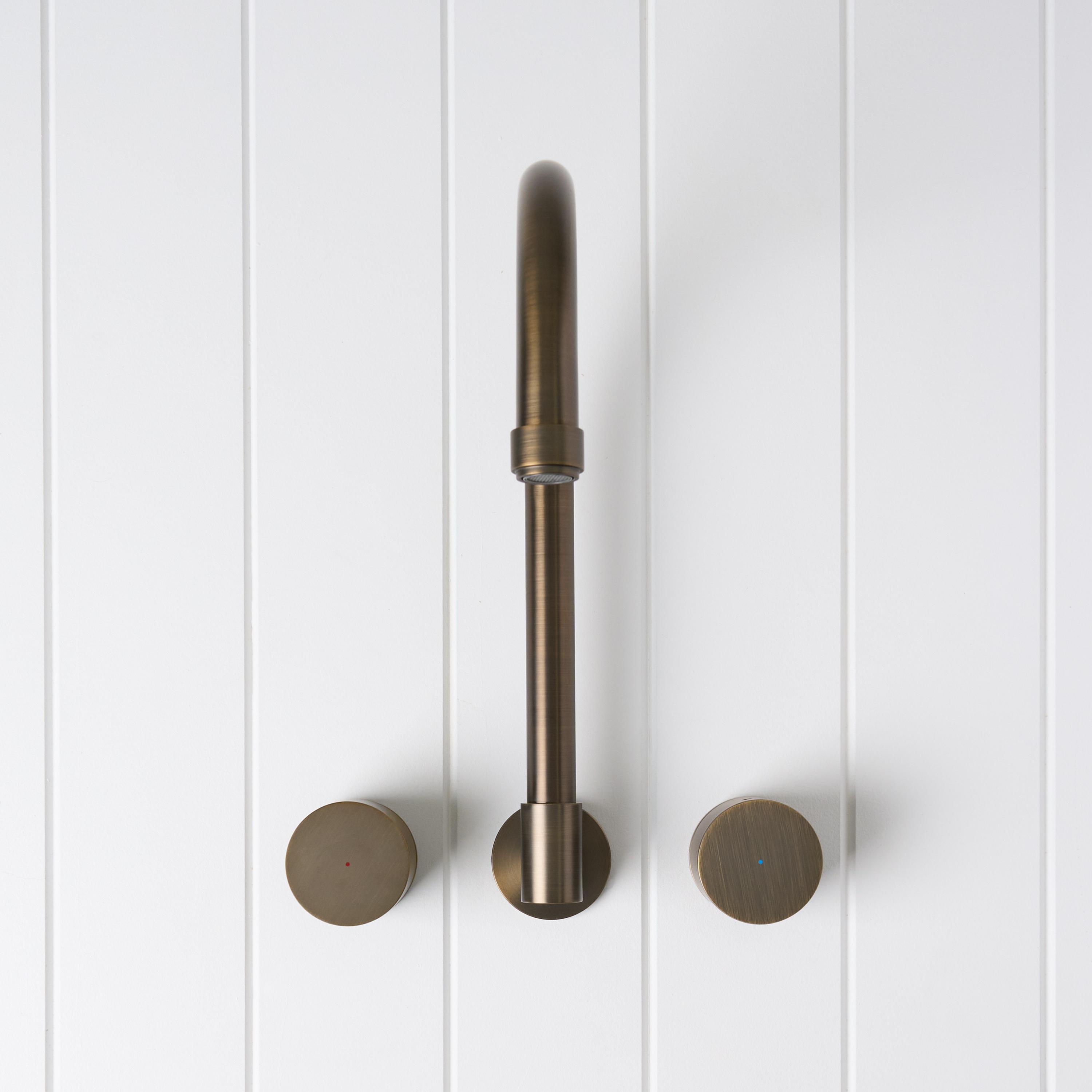 The Melbourne Swivel Spout + Round Taps Antique Brass combines a soft gooseneck profile with practical flexibility, offering a refined solution for compact spaces. Wall-mounted and designed to swivel up to 180 degrees, it allows you to adjust the direction of the water flow to suit your setup.