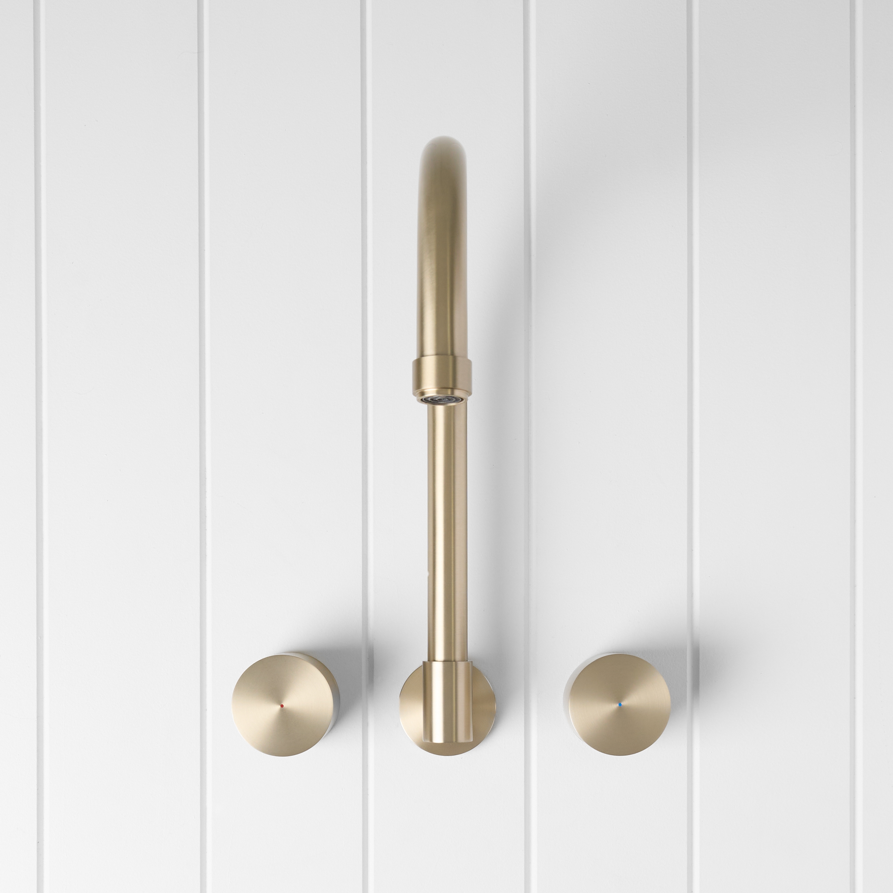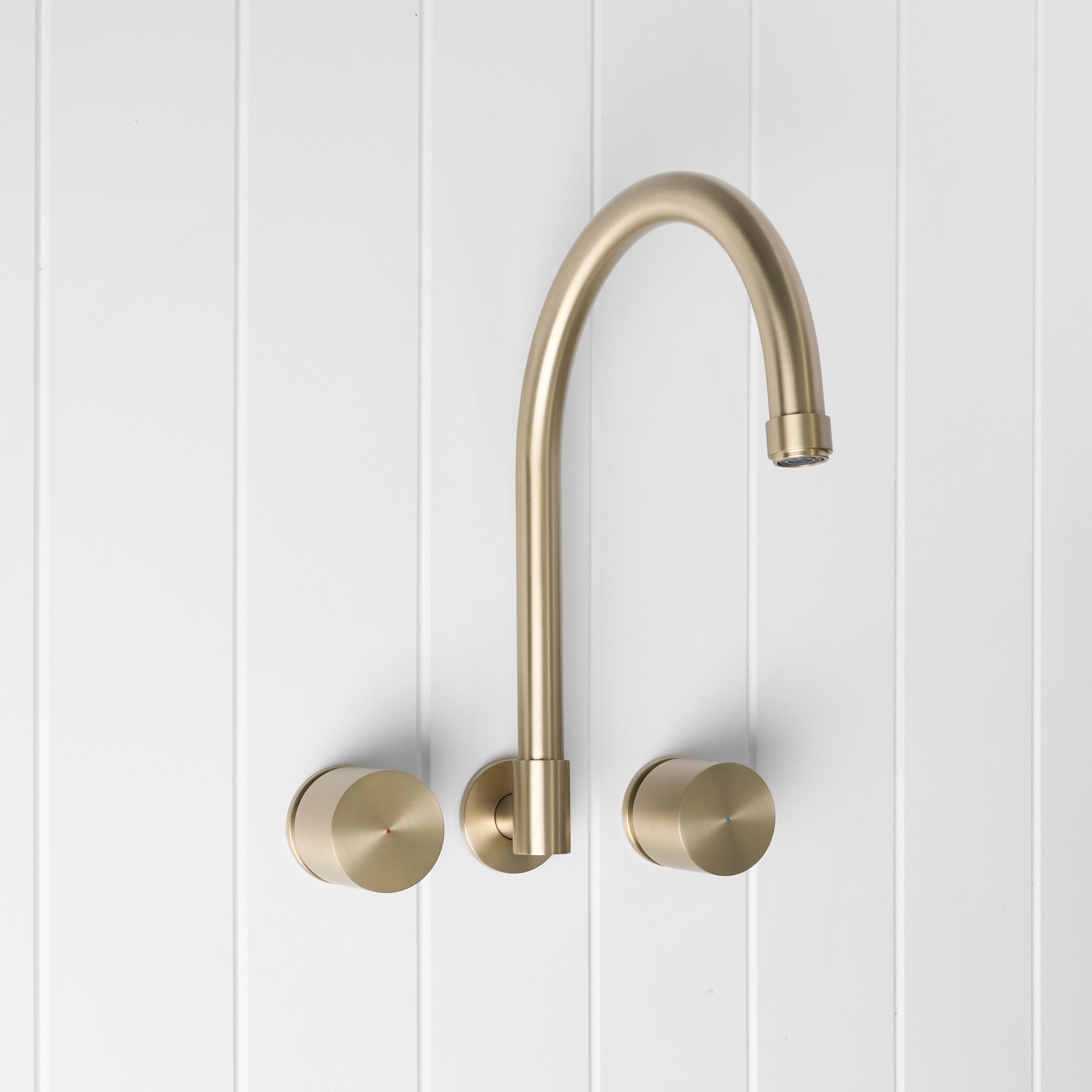 The Melbourne Swivel Spout + Round Taps Warm Brushed Nickel combines a soft gooseneck profile with practical flexibility, offering a refined solution for compact spaces. Wall-mounted and designed to swivel up to 180 degrees, it allows you to adjust the direction of the water flow to suit your setup.