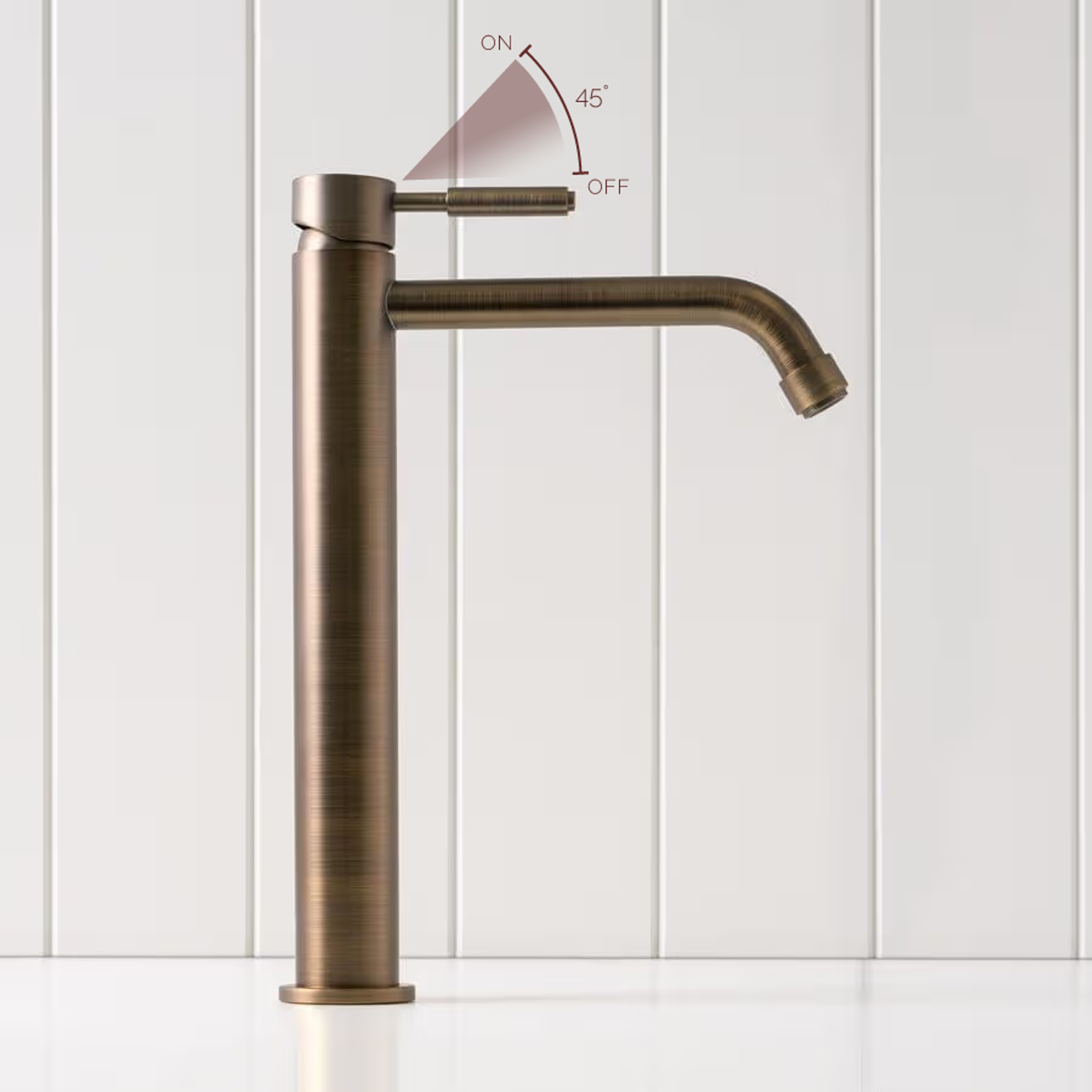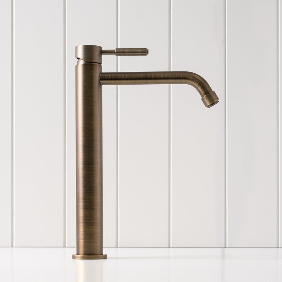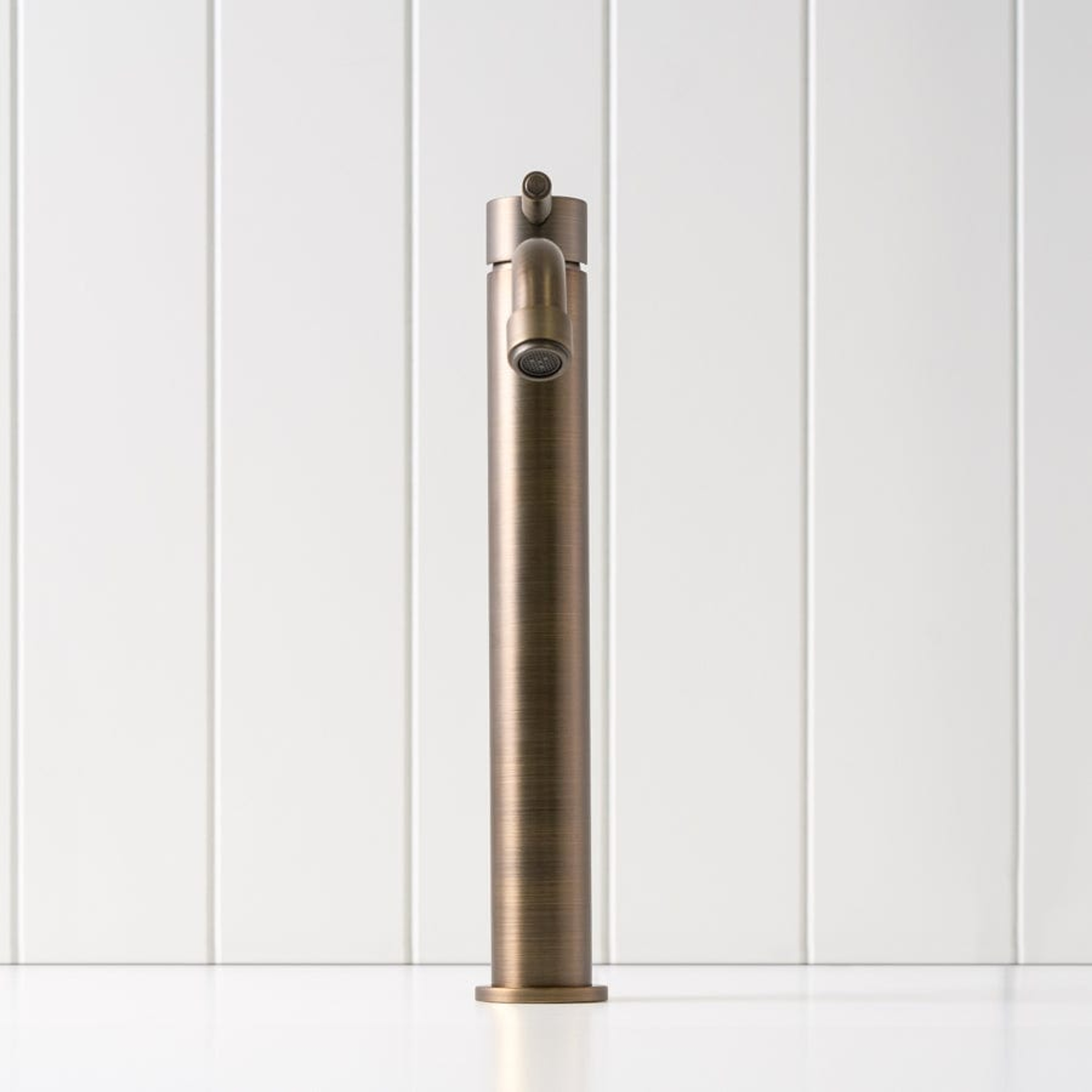 The Melbourne Tall Basin Mixer in Antique Brass combines classic warmth with modern form. Its elevated design pairs beautifully with your above counter basins, while the aged brass finish adds depth and texture to the space. Smooth to use and built to last, a timeless detail with everyday function.