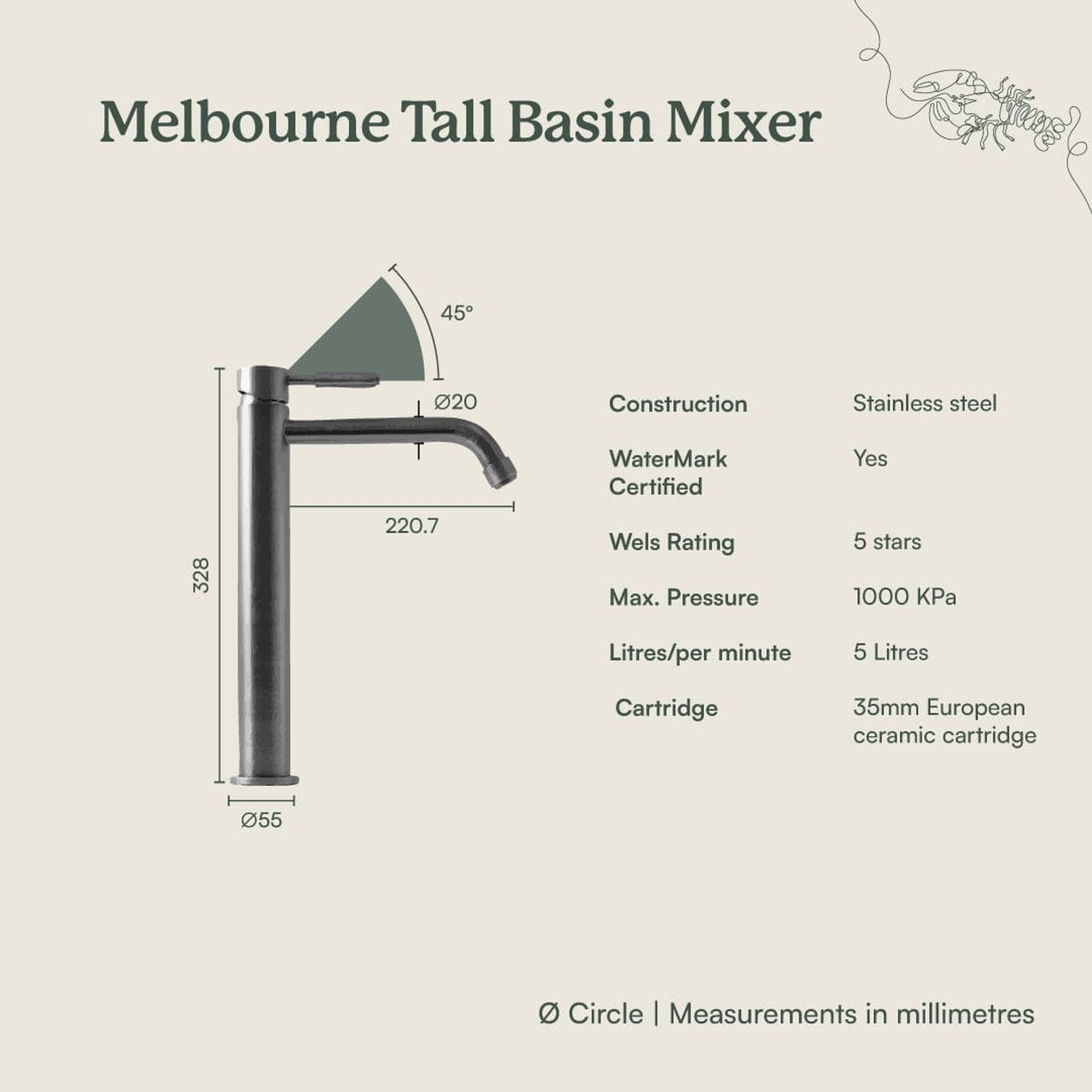 The Melbourne Tall Basin Mixer in Warm Brushed Nickel offers soft, contemporary sophistication. Its brushed finish and elevated design pair beautifully with stone or ceramic basins, creating a calm, cohesive look. Functional, refined, and made for modern Australian homes.