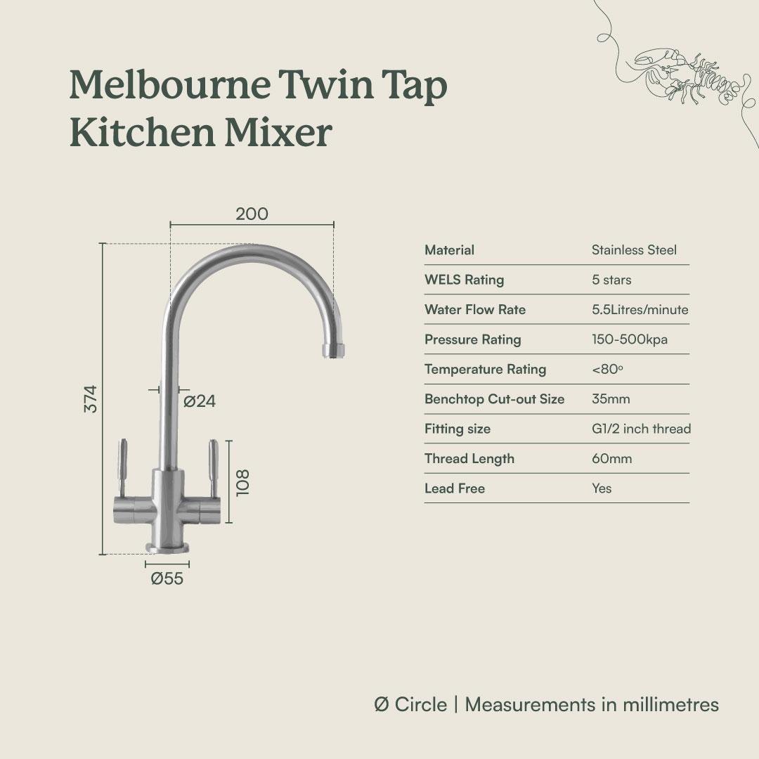 The Melbourne Twin Tap Kitchen Mixer in Brushed Brass brings a soft golden tone and contemporary elegance to your kitchen. Its dual handles offer smooth control, while the 360° swivel spout enhances everyday use. Crafted for durability and style, it’s a subtle statement in modern design.
