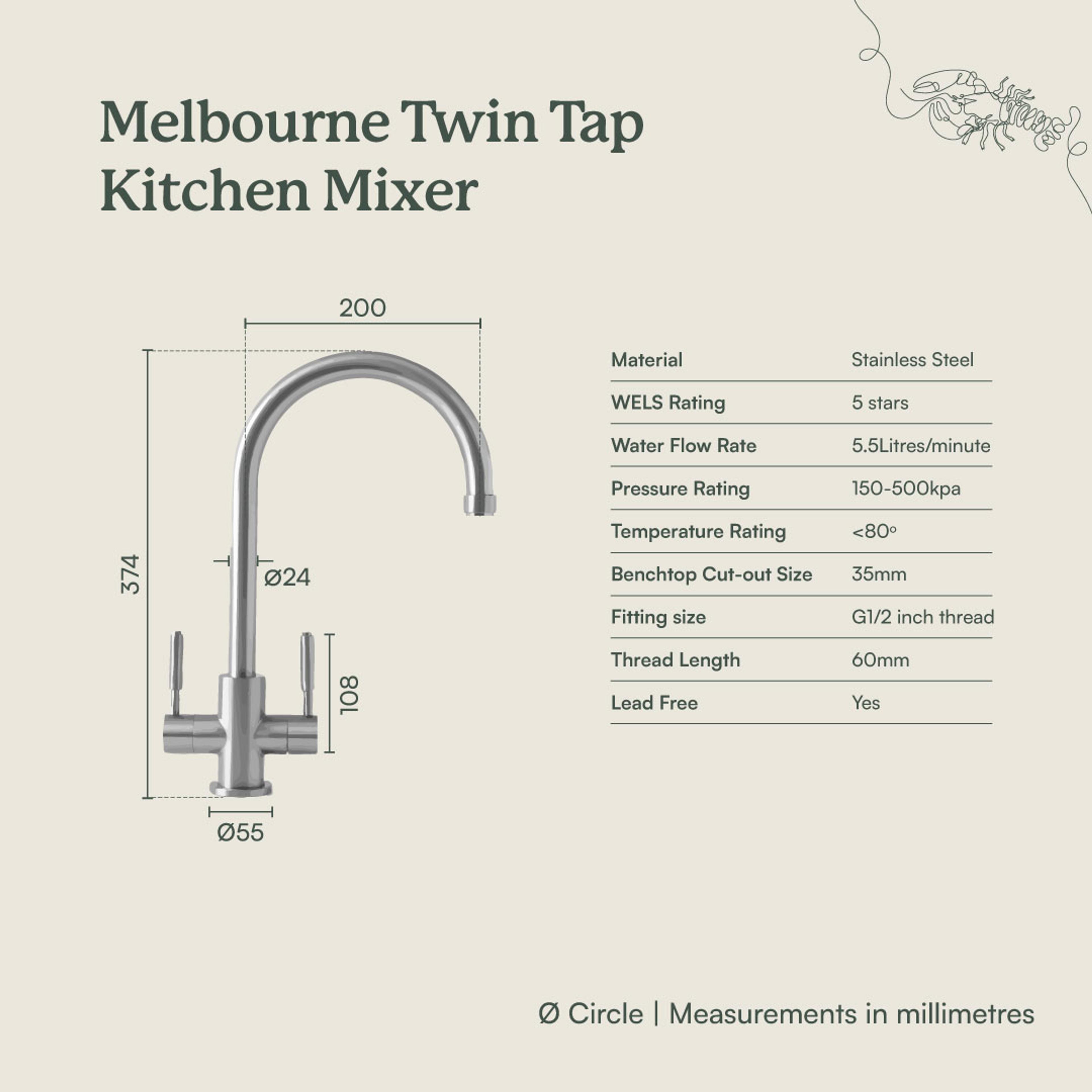 The Melbourne Twin Tap Kitchen Mixer in Warm Brushed Nickel blends modern simplicity with a soft, refined finish. Its twin levers provide precise temperature control, and the 360° swivel spout adds flexibility and ease. Elegant and efficient, it’s designed to look beautiful and work seamlessly every day.