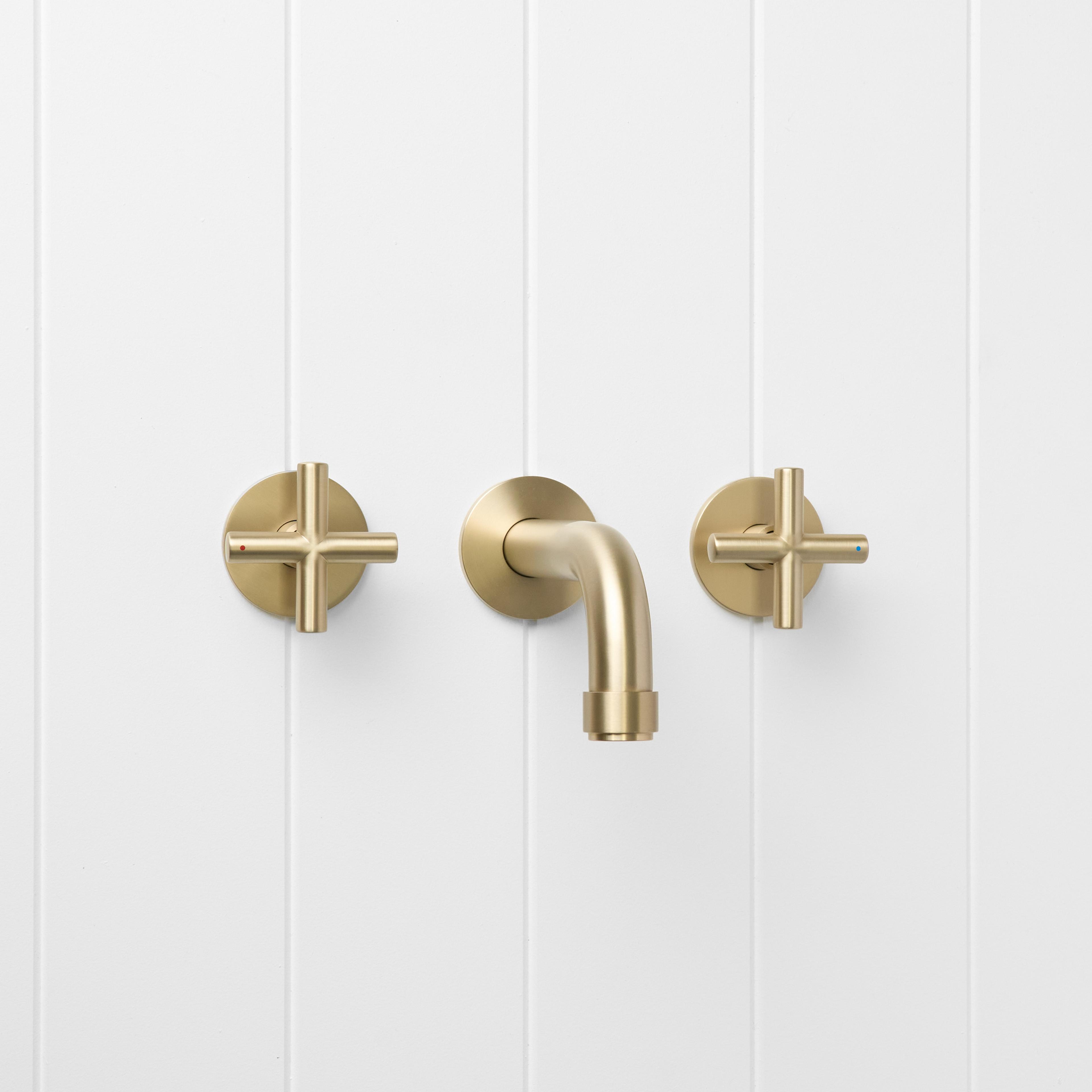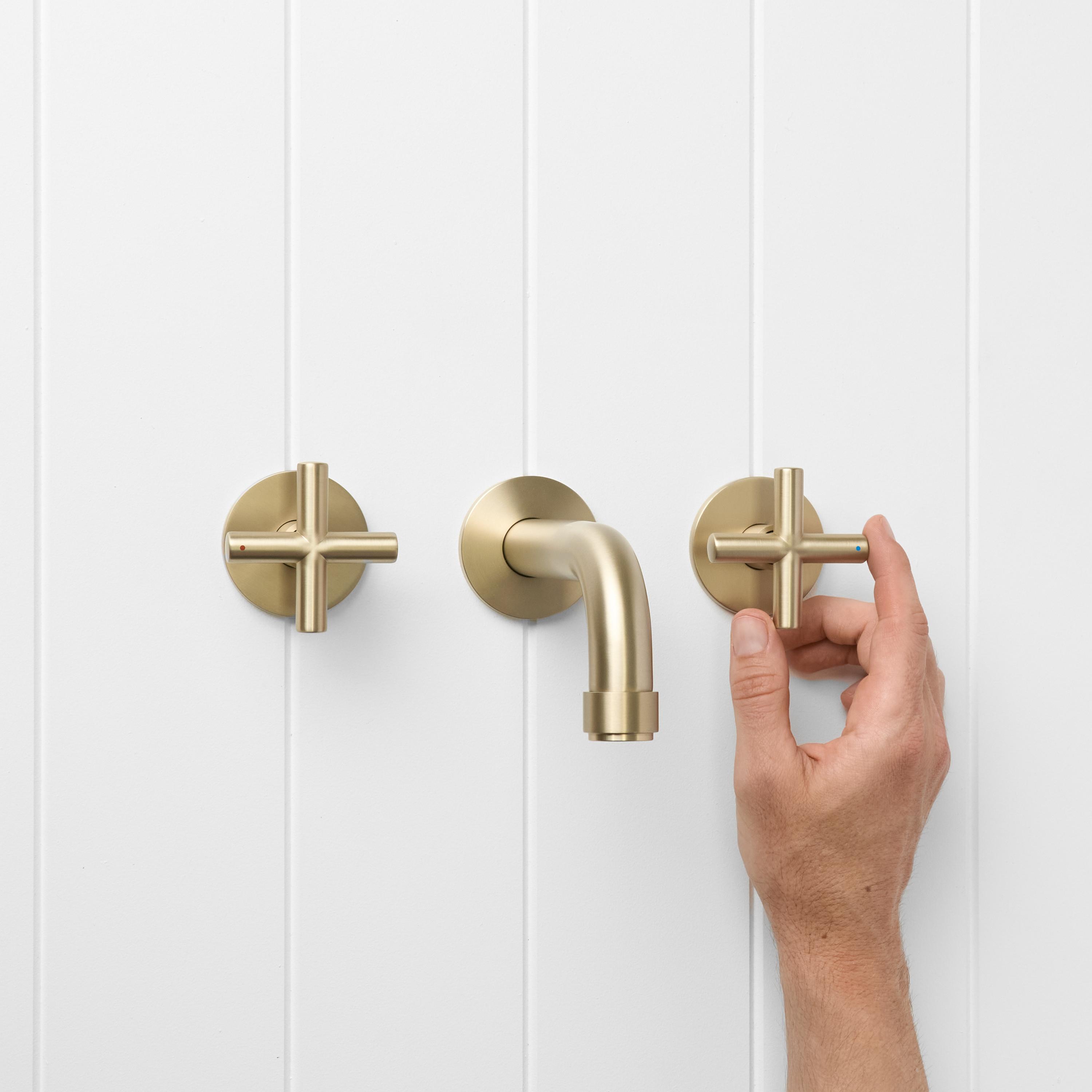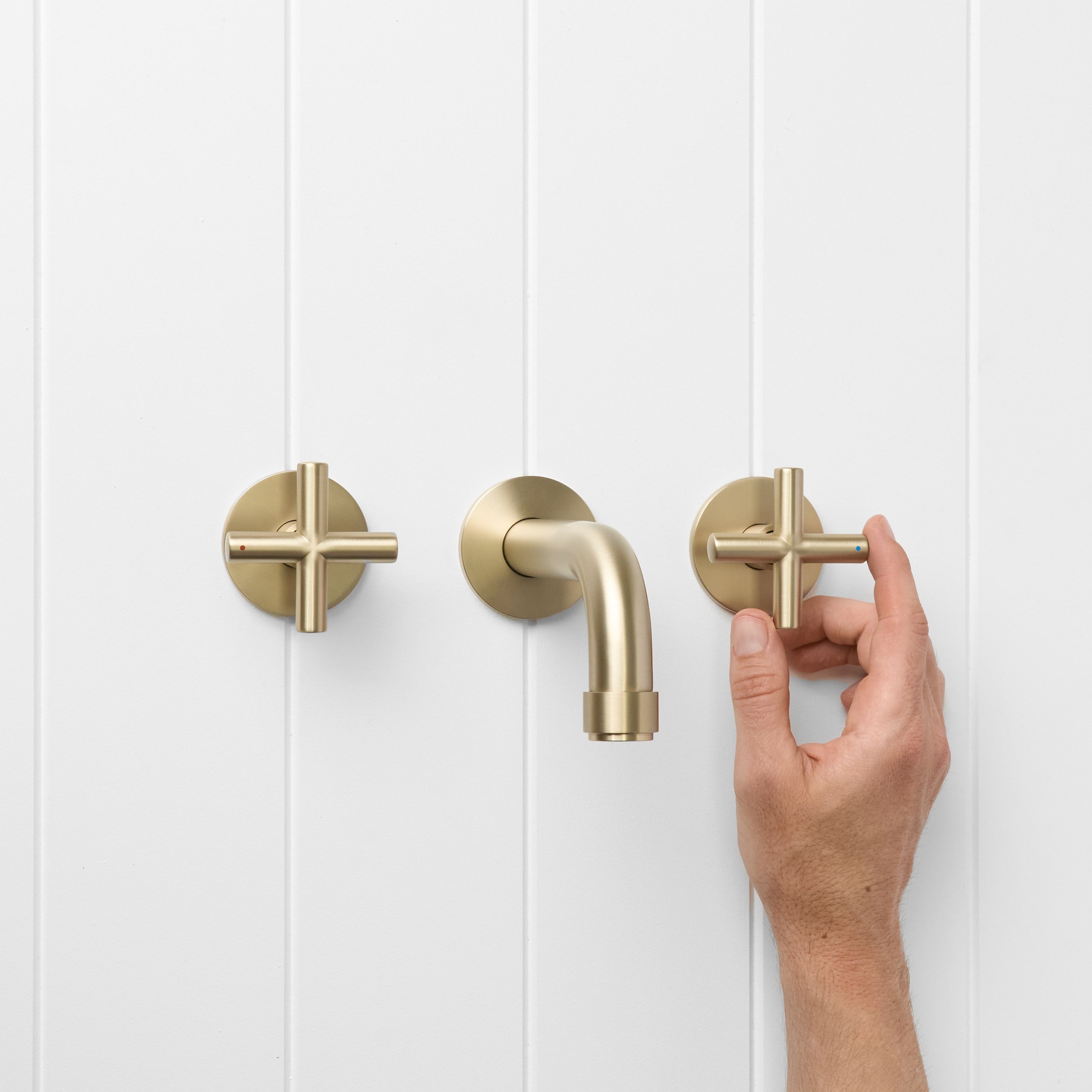 The Melbourne Wall Spout + Cross Taps in Warm Brushed Nickel brings a soft, neutral glow to bathroom walls. The Warm Brushed Nickel finish over stainless steel sits gently with both warm and cool palettes, while the curved spout and round taps create a relaxed focal point at the basin or bath.