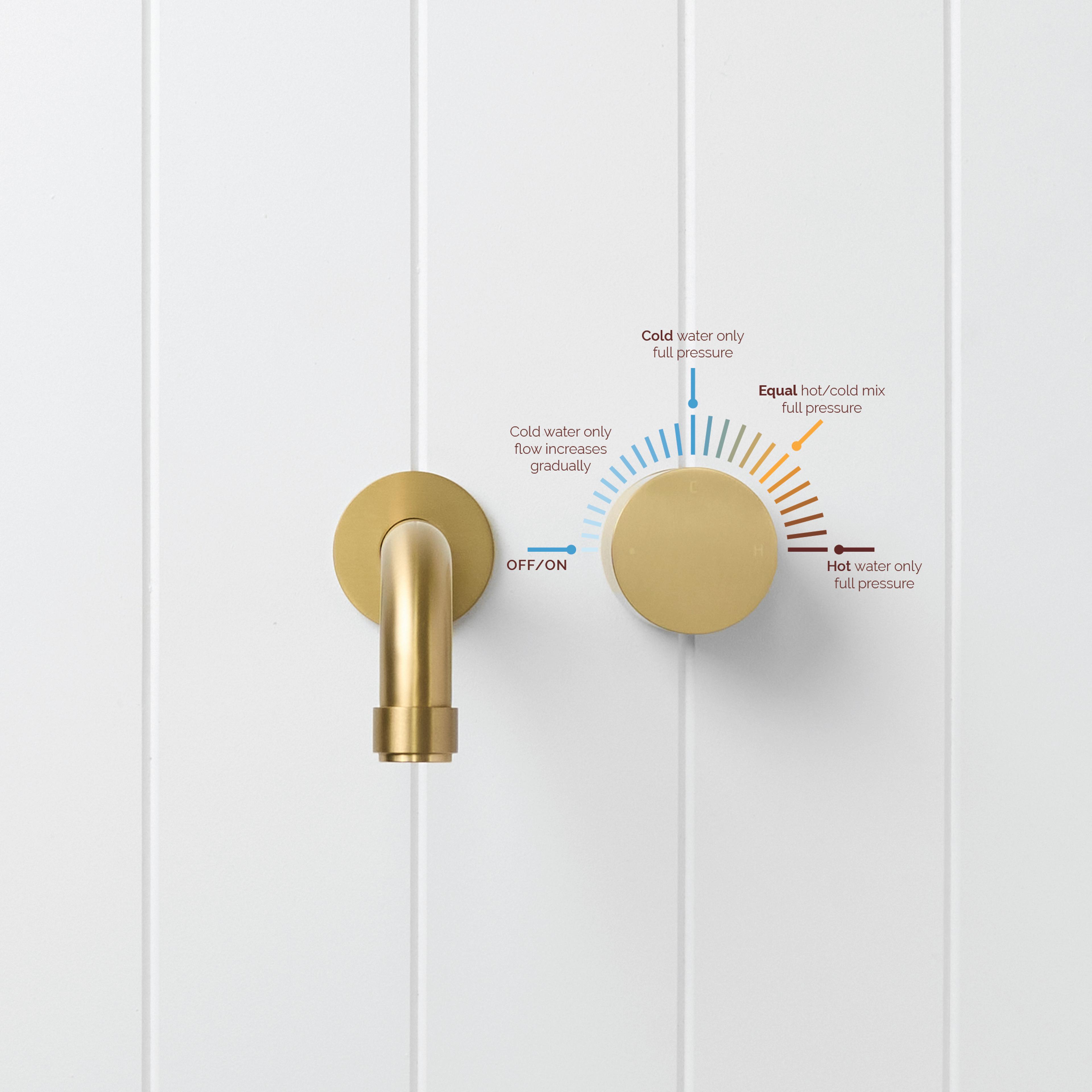 The Melbourne Wall Spout and Progressive Mixer in Brushed Brass adds soft glow and smooth control to the bathroom. The brushed finish over stainless steel feels calm against stone and textured tiles, while the progressive mixer lets you move from gentle cool flow to warm shower with one motion. This wall spout and mixer creates a refined basin or bath moment.