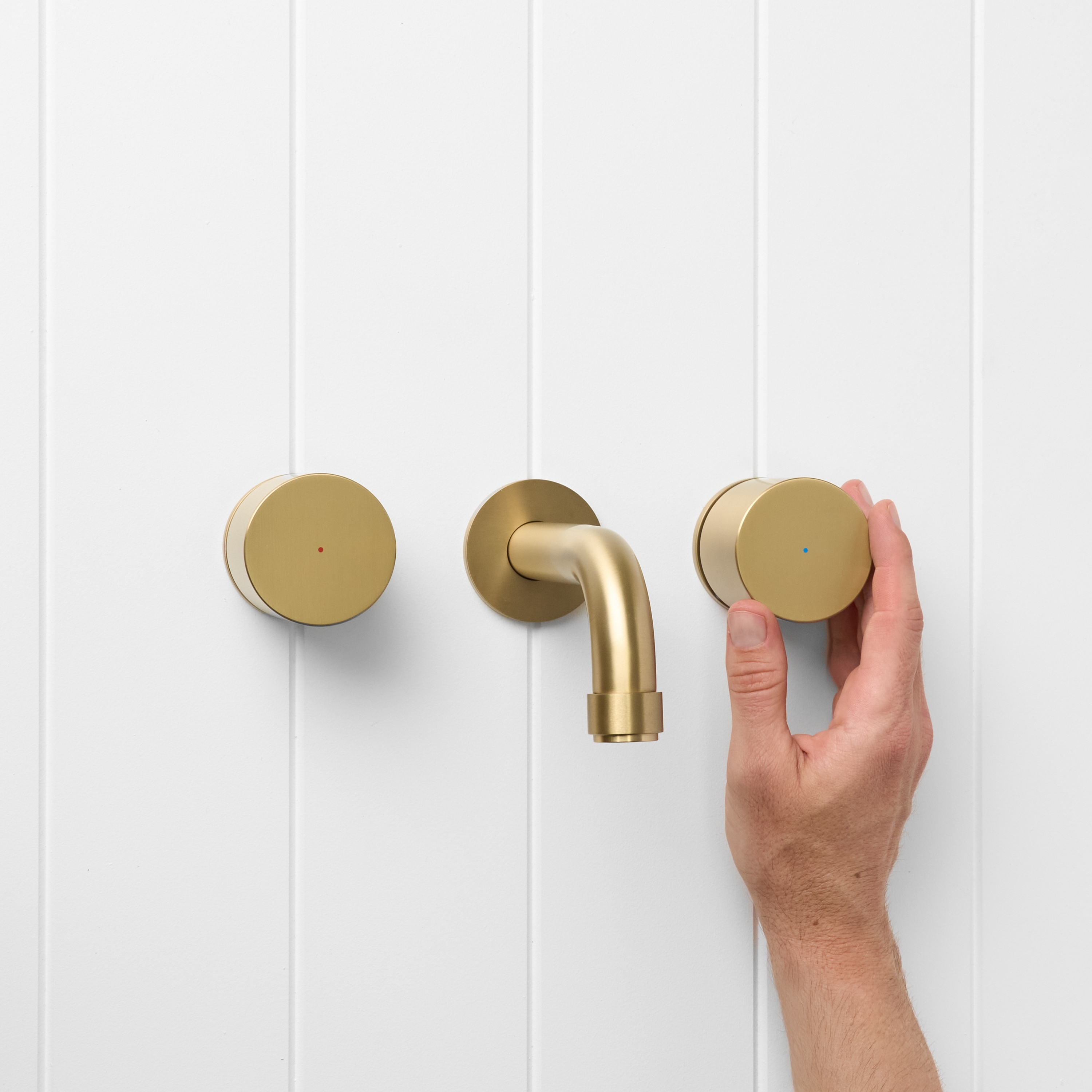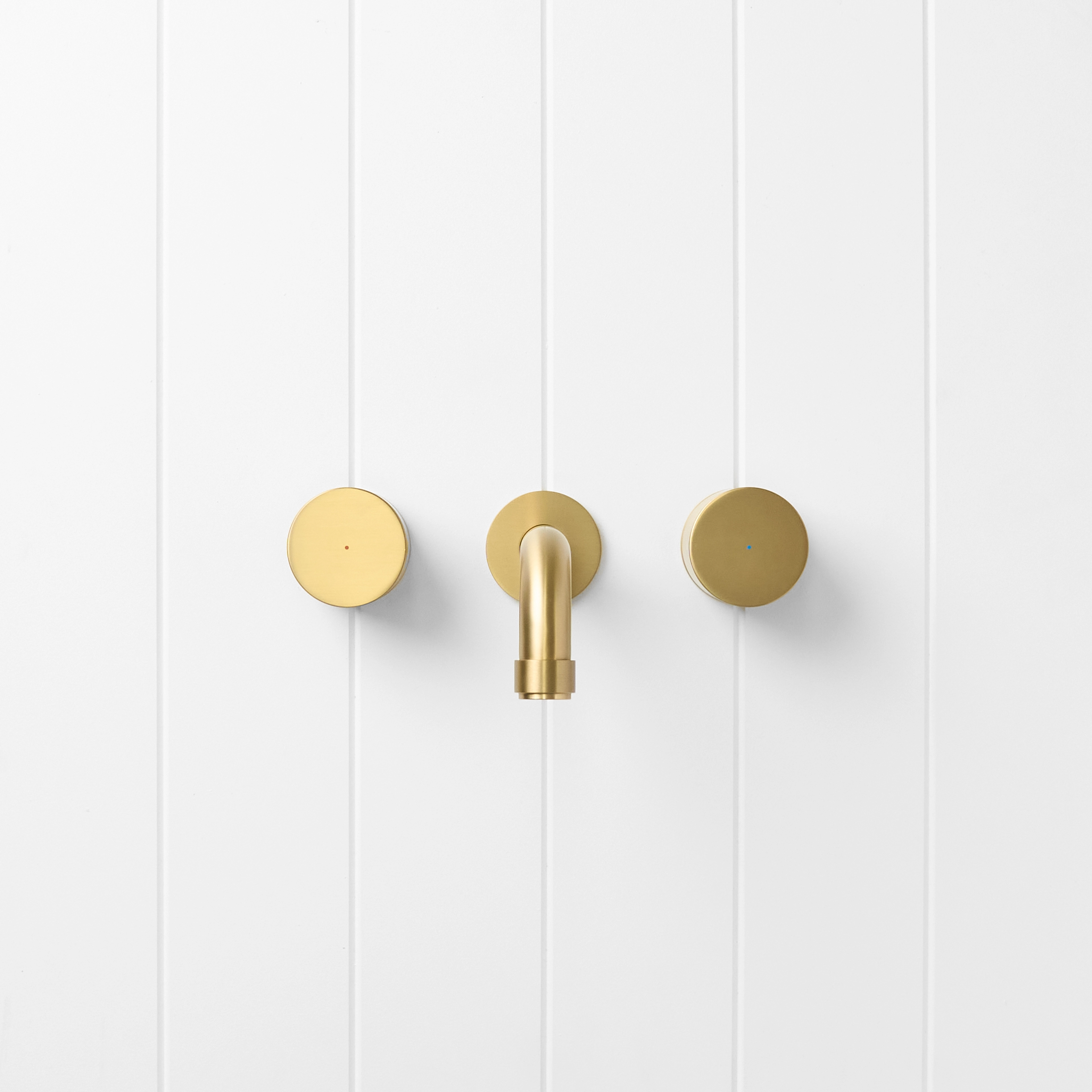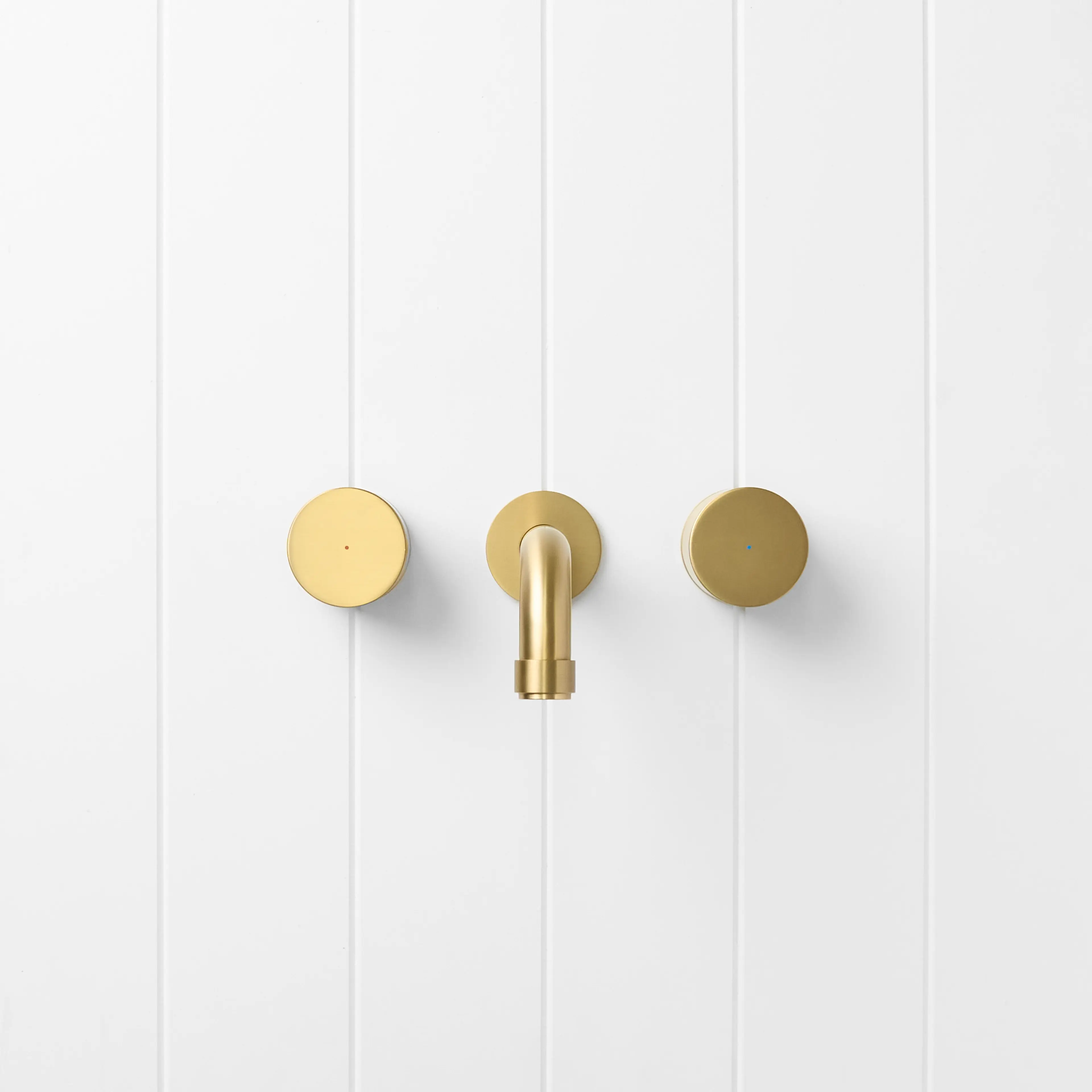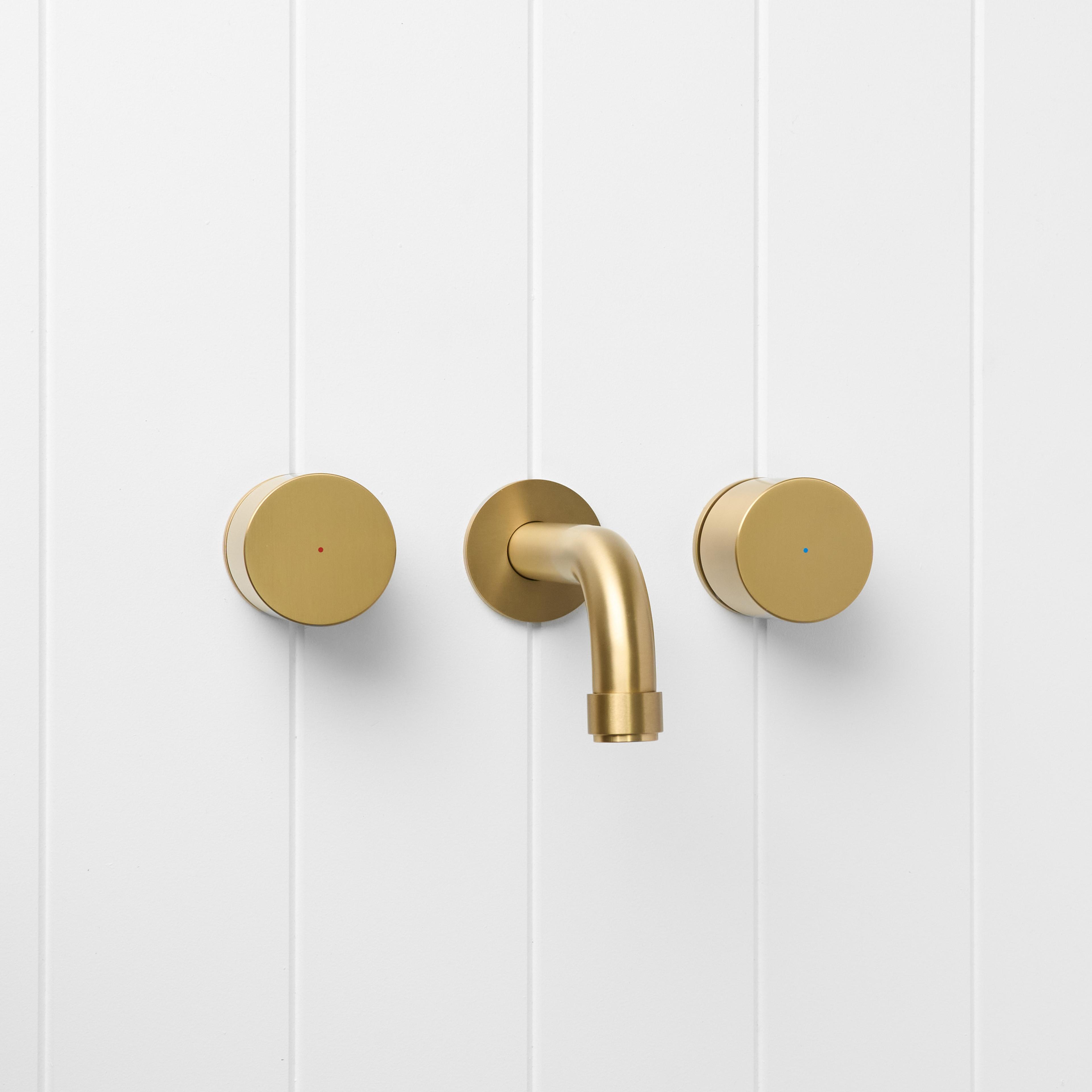 The Melbourne Wall Spout and Round Taps in Brushed Brass adds soft glow and simple geometry to bathroom walls. The brushed finish over stainless steel feels calm against warm tiles and timber, while the curved spout creates a gentle water fall into the basin. This set gives a considered focal point without visual clutter.