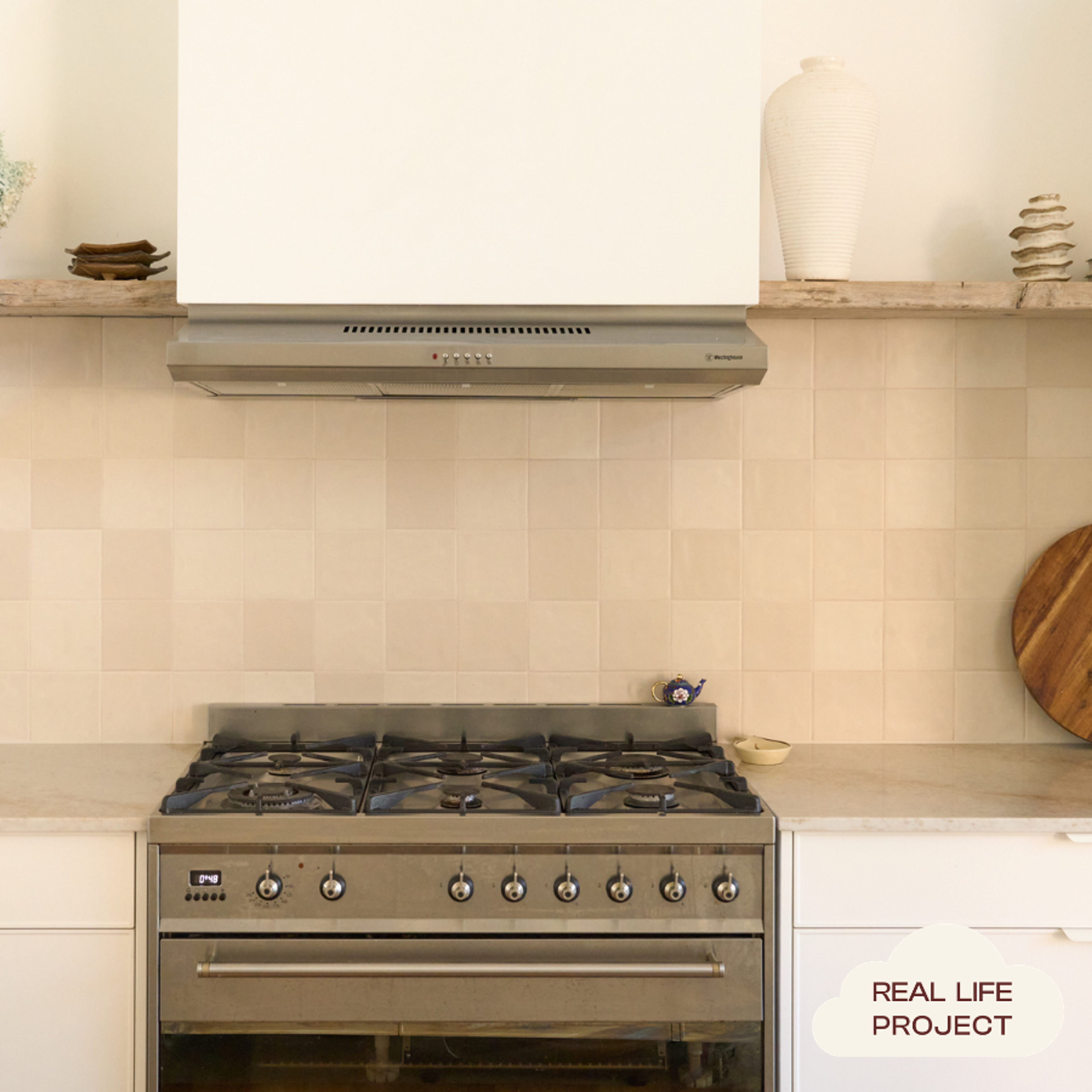 Our Newport Bone Matte Mixed tiles keeps the look soft and tonal, pairing perfectly with timber joinery and brushed brass details.