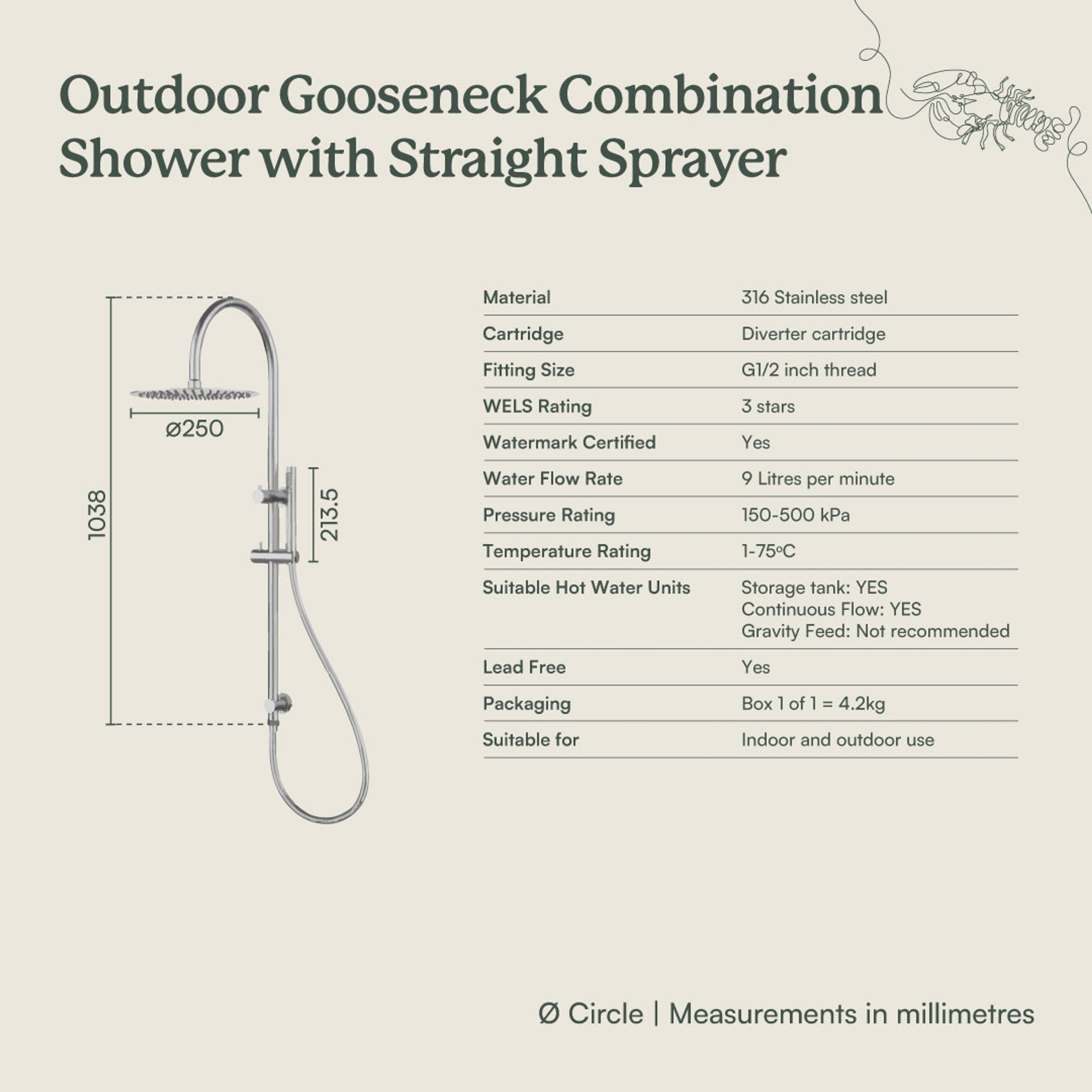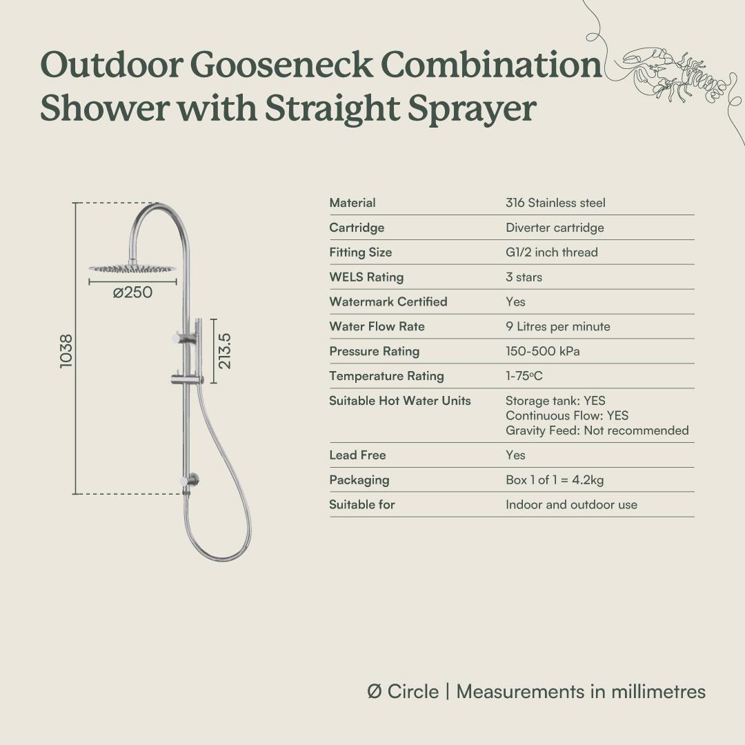 The Outdoor Gooseneck Combination Shower combines an overhead rain shower with our Straight Shower Hose + Sprayer, offering a practical solution for outdoor use. Made from durable 316 stainless steel, it’s designed to handle outdoor conditions with ease.
