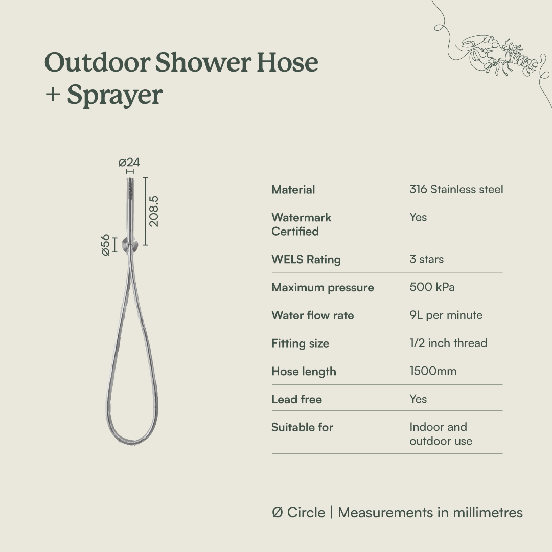 The Outdoor Shower Hose + Sprayer is a practical handheld shower designed for flexibility and everyday outdoor use. Made from durable 316 stainless steel, it’s built to withstand outdoor conditions while keeping a clean, modern look.