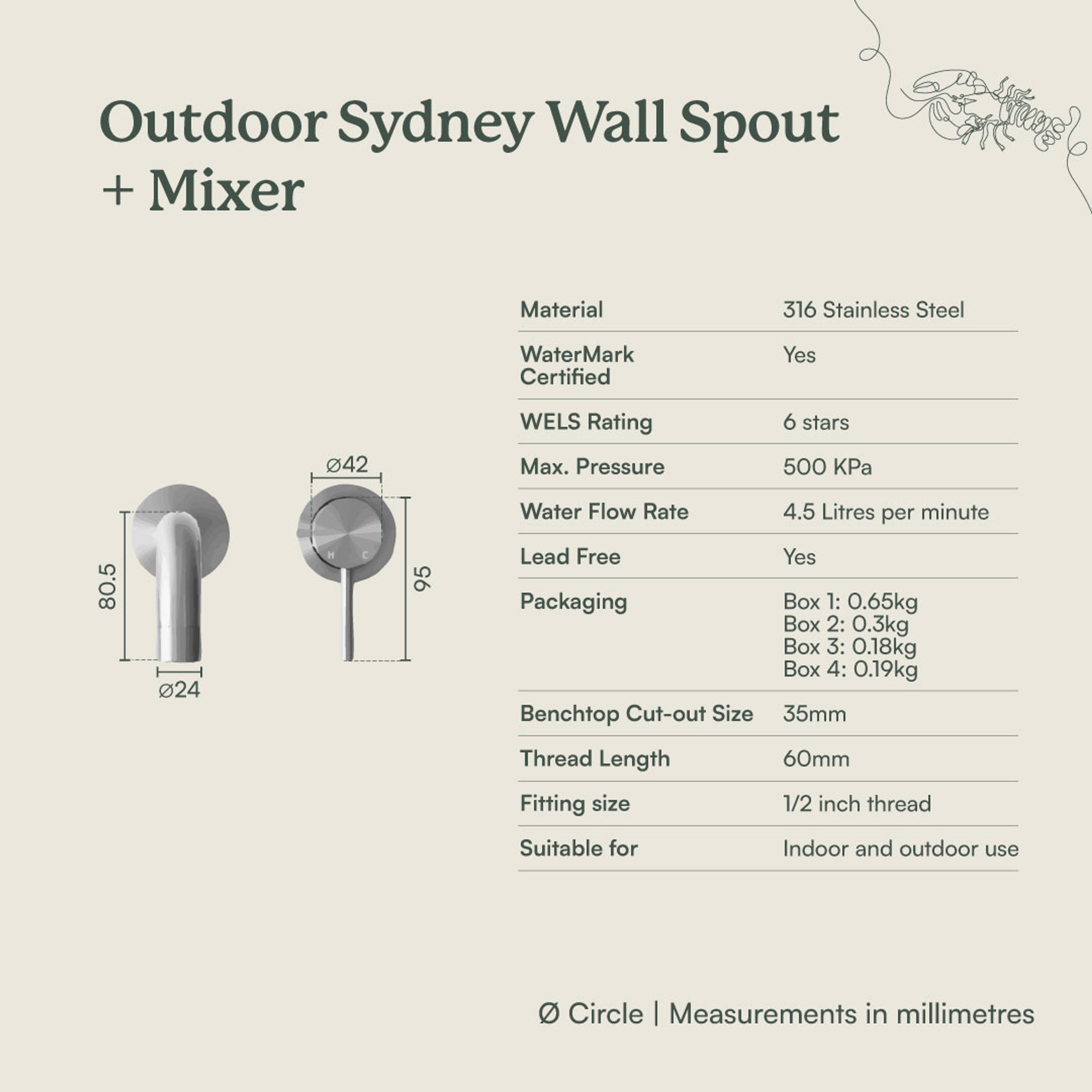 The Outdoor Sydney Wall Spout and Mixer in Stainless Steel is designed for functional outdoor spaces that value simplicity and durability. Made from 316 stainless steel, it’s built to handle outdoor conditions while maintaining a clean, modern look.