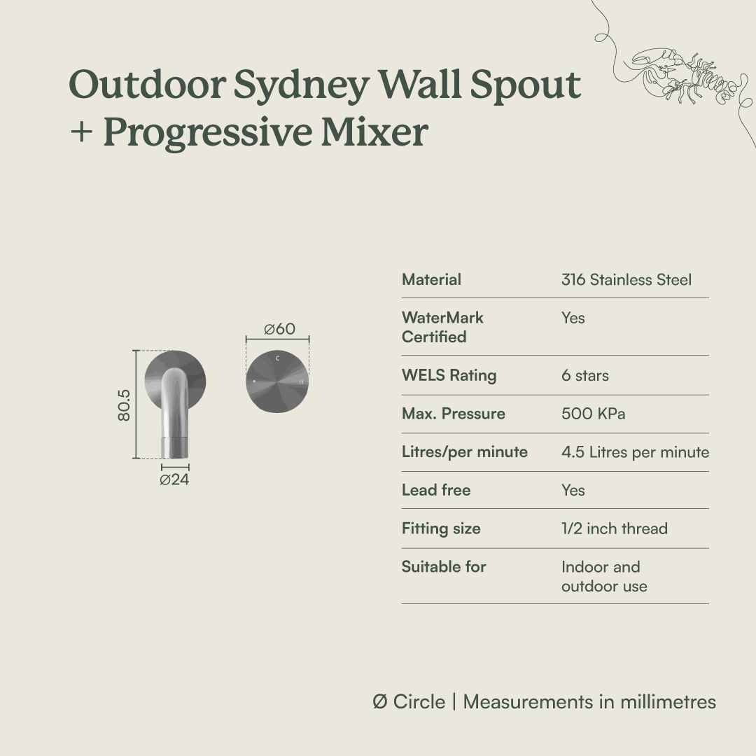 The Outdoor Sydney Wall Spout + Progressive Mixer in Stainless Steel offers a simple, streamlined solution for outdoor basins and sinks. Made from durable 316 stainless steel, it’s designed to withstand outdoor conditions while maintaining a clean, modern look.