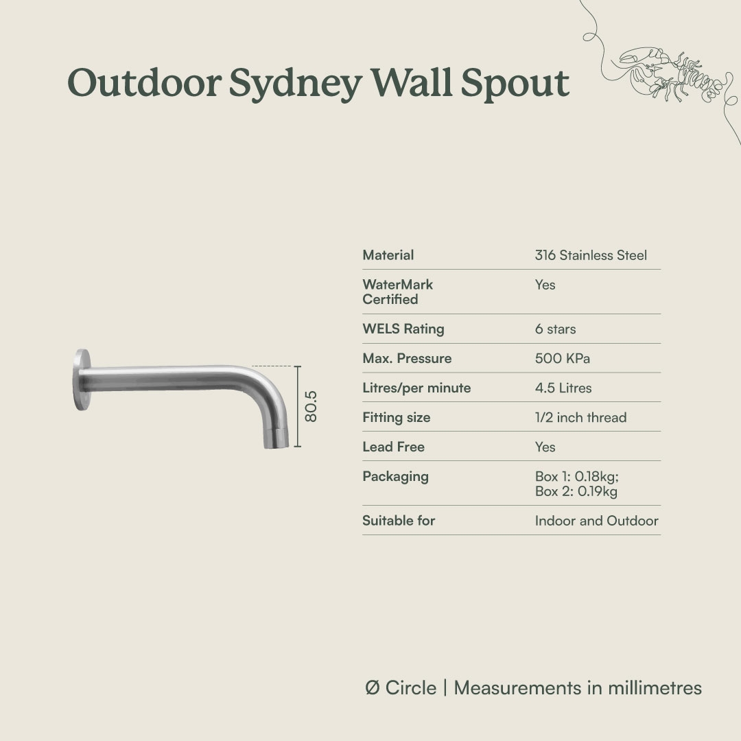 The Outdoor Sydney Wall Spout in Stainless Steel offers a simple, streamlined water outlet for outdoor spaces. Made from durable 316 stainless steel, it’s designed to handle outdoor conditions while maintaining a clean, modern look.