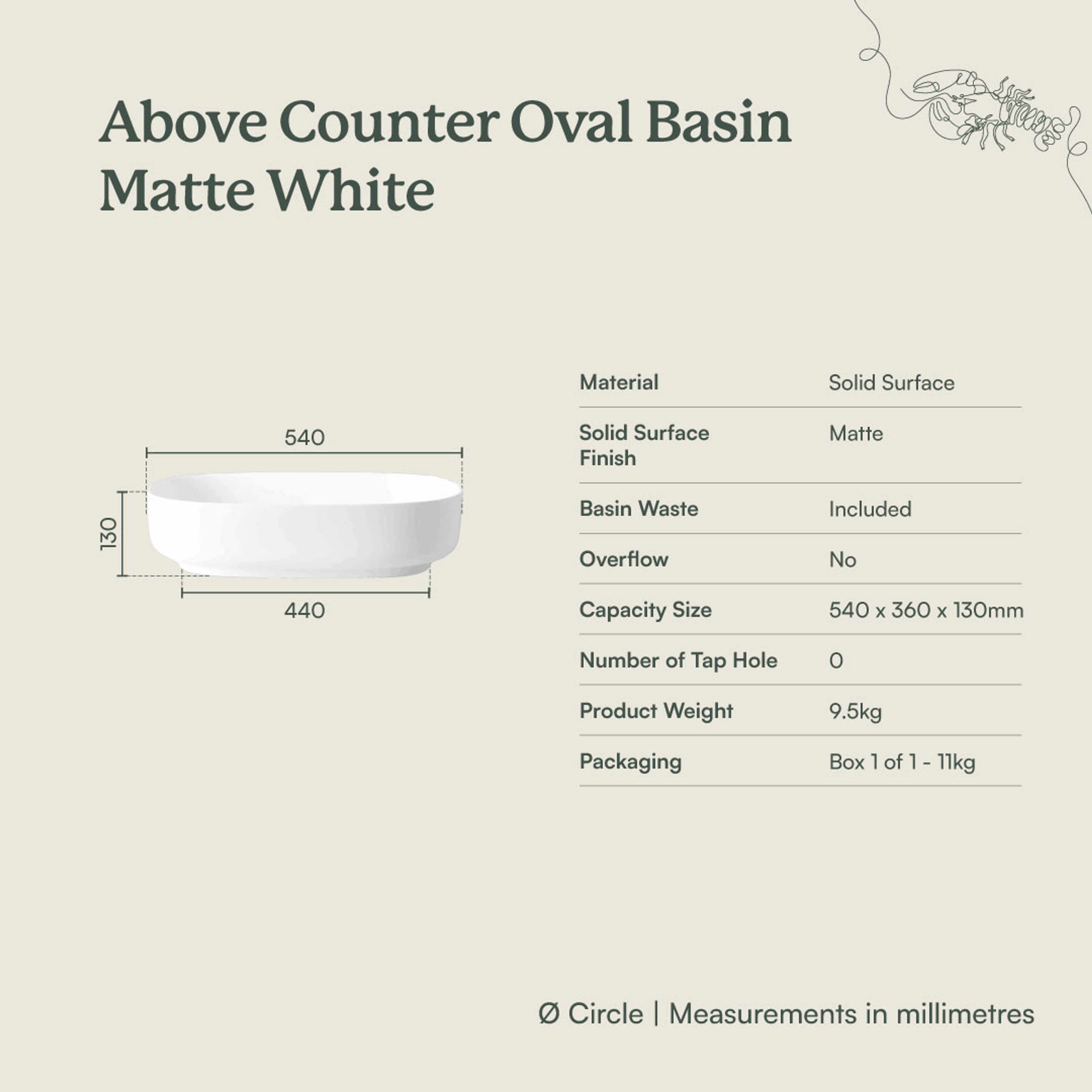 | Material | Made from non-porous low-maintenance solid surface material |