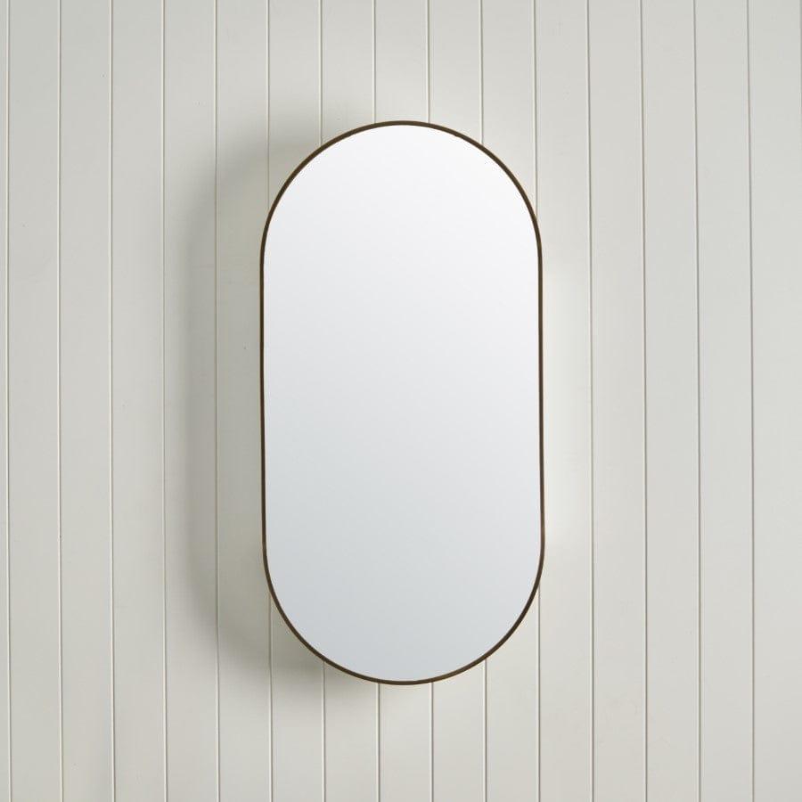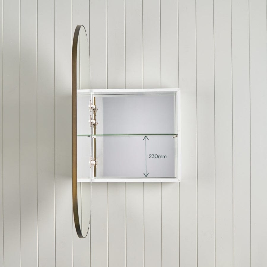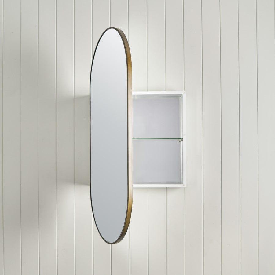 The Oval Mirror Cabinet in Antique Brass brings a refined focal point to any bathroom. Designed to be wall mounted or recessed, it offers generous internal storage with adjustable shelves to keep your space feeling clean and intentional. With mirrors on both sides of the door, it enhances light and adds a considered layer of detail to your bathroom design.