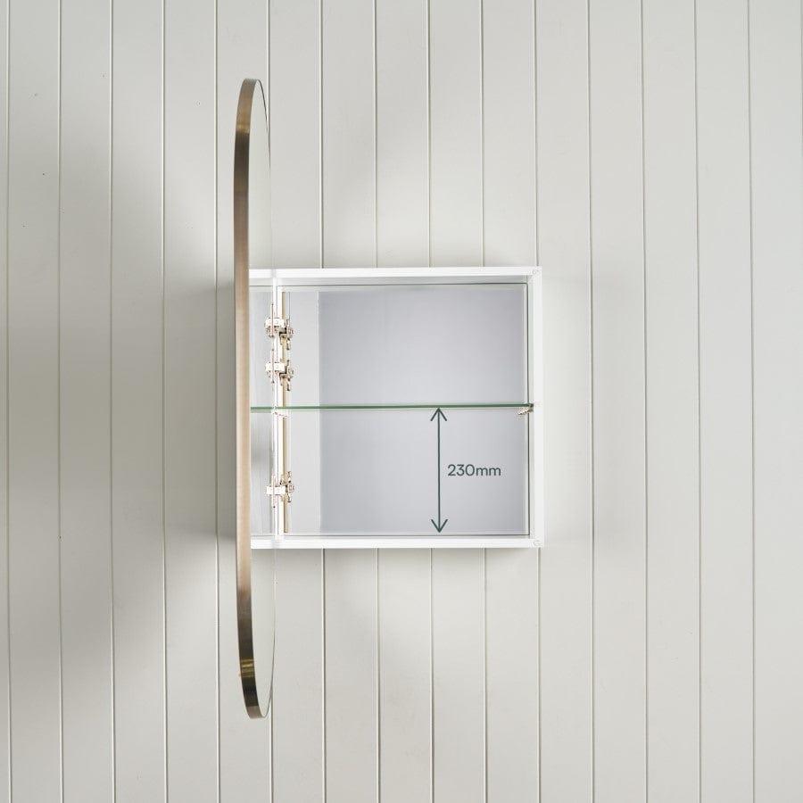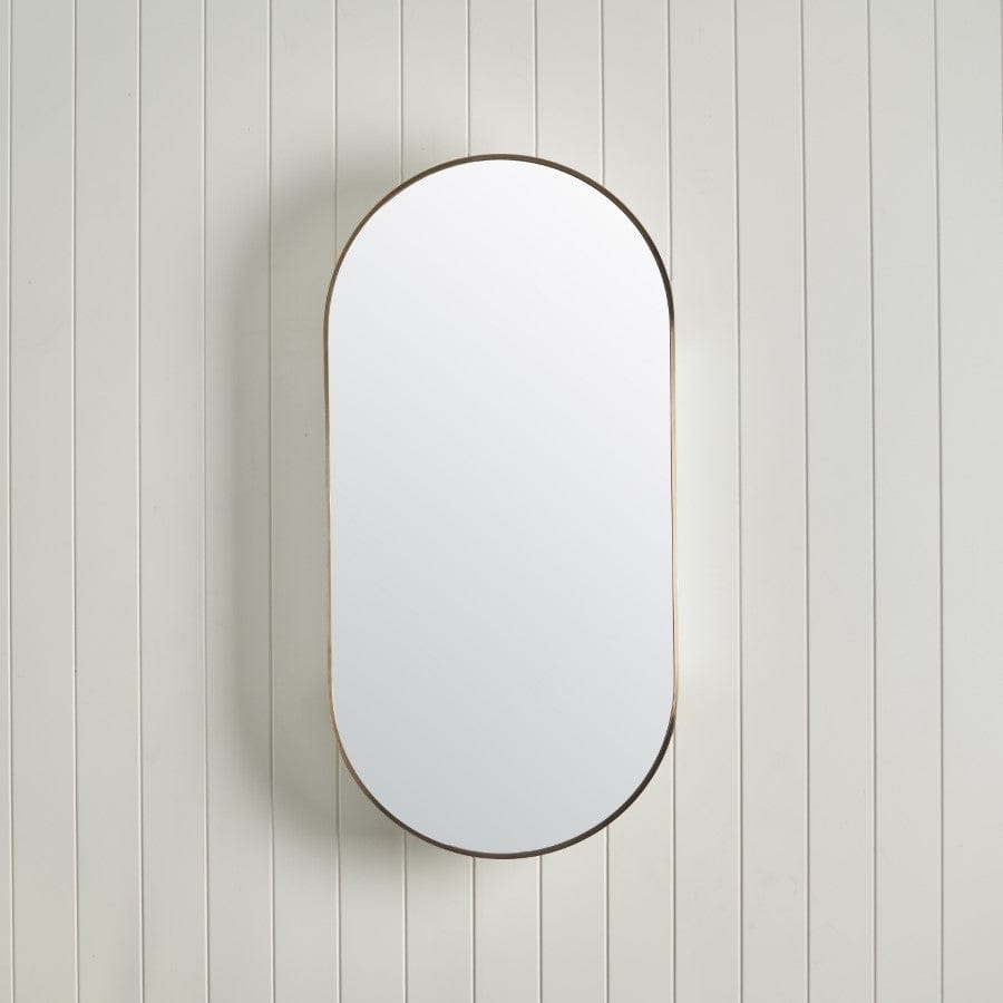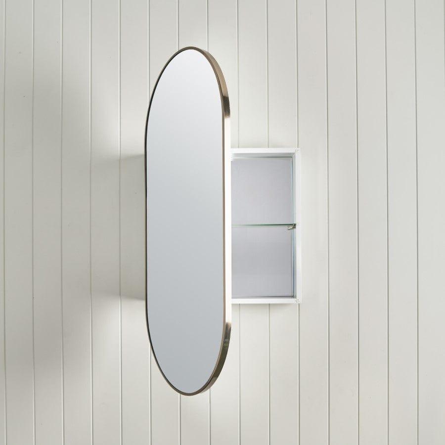 The Oval Mirror Cabinet in Warm Brushed Nickel introduces a subtle, modern feature to bathroom spaces. With the choice to recess or wall mount, it provides generous storage and adjustable shelves. Dual sided mirrored doors mean you can use the mirror whether the door is open or closed.