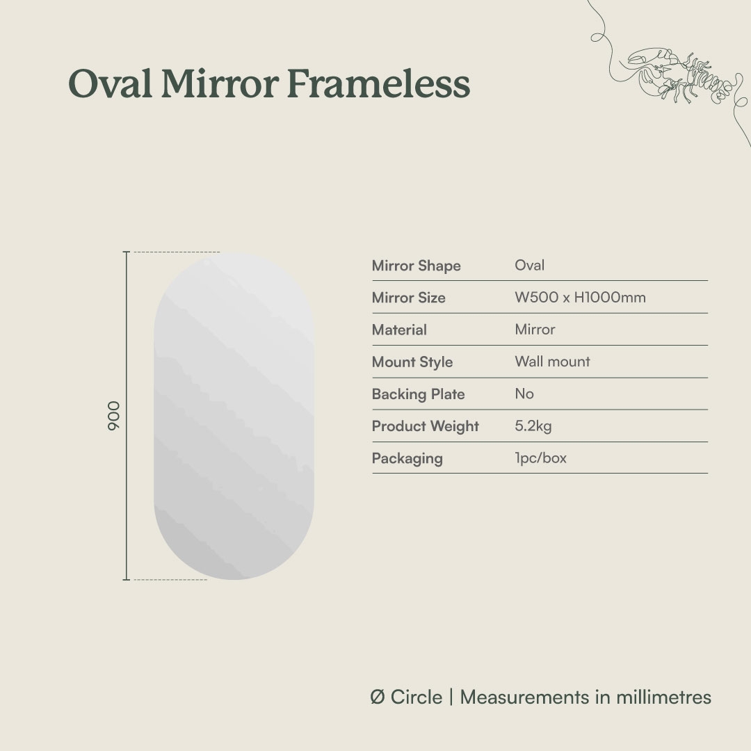 The Frameless Oval Mirror brings a clean, effortless shape to any space. Its works beautifully in bathrooms, bedrooms, entries, or living areas. Without a frame, the mirror sits lightly against the wall, adding clarity and lift without competing with surrounding finishes. A simple, modern piece that supports a range of interior styles.