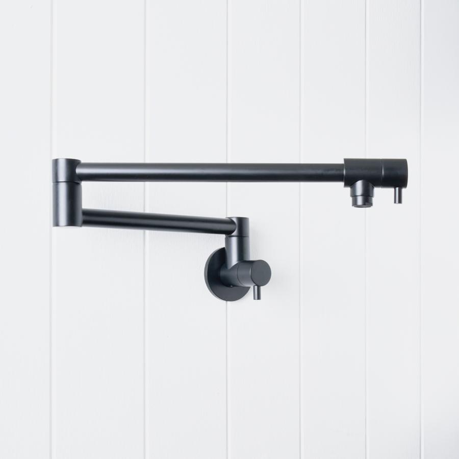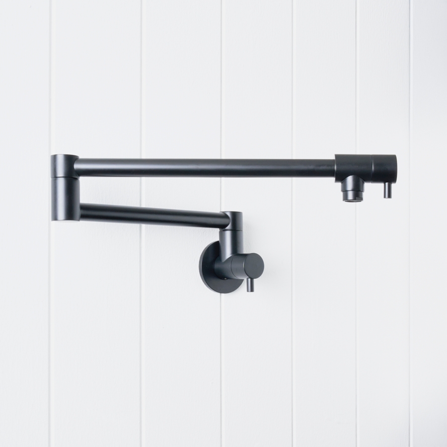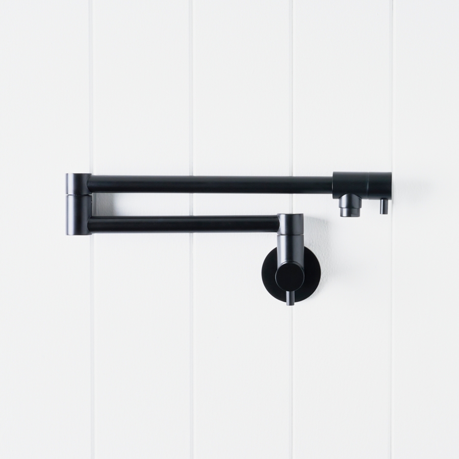 The Pot Filler in Matte Black brings a confident, minimalist edge to farmhouse kitchens. Mounted over wide cooktops, this black pot filler tap lets you fill saucepans and stockpots in place, cutting down on spills and strain. It’s a strong design moment that ties in with black hardware and appliances.