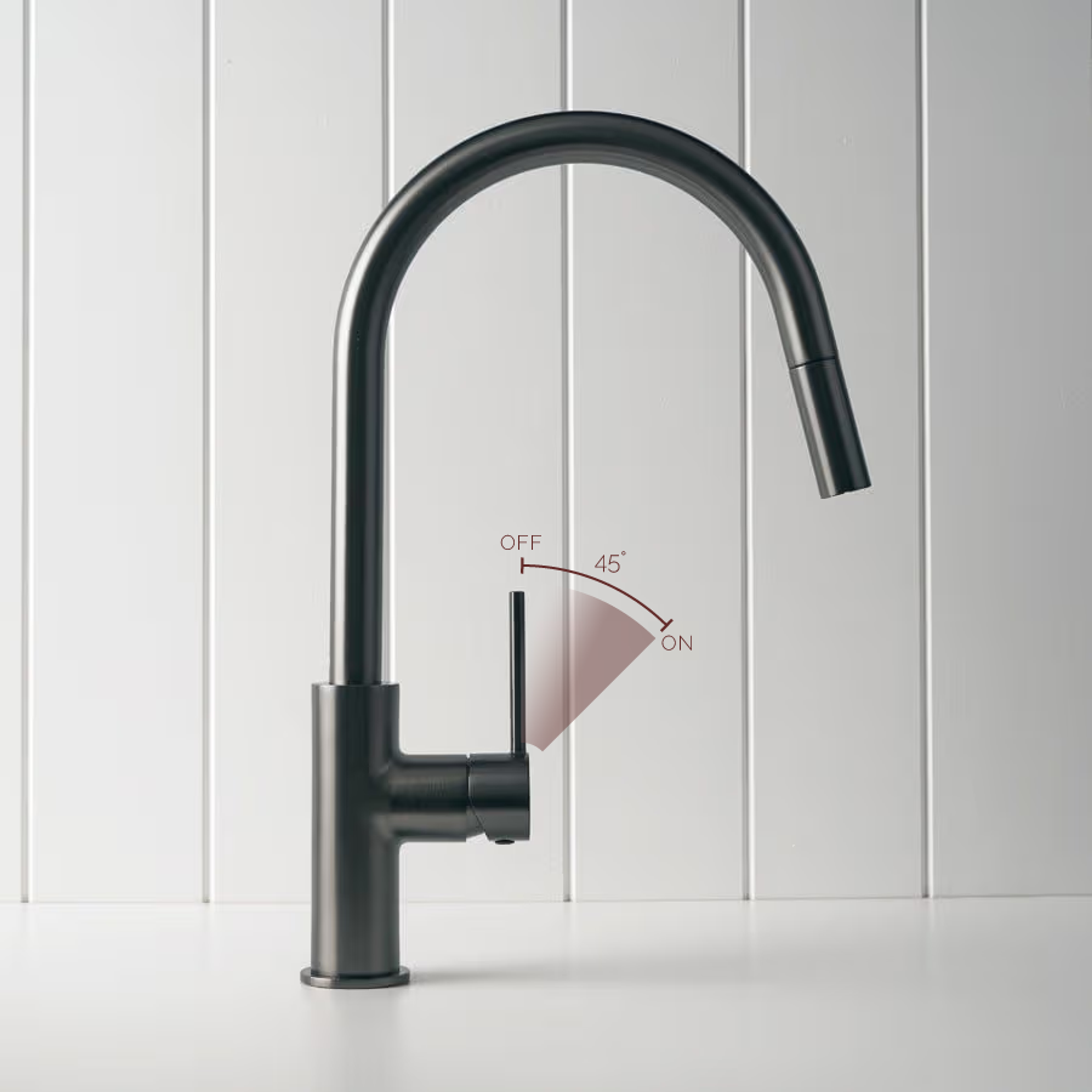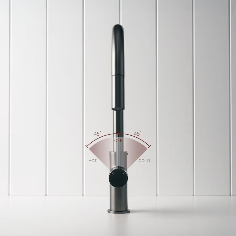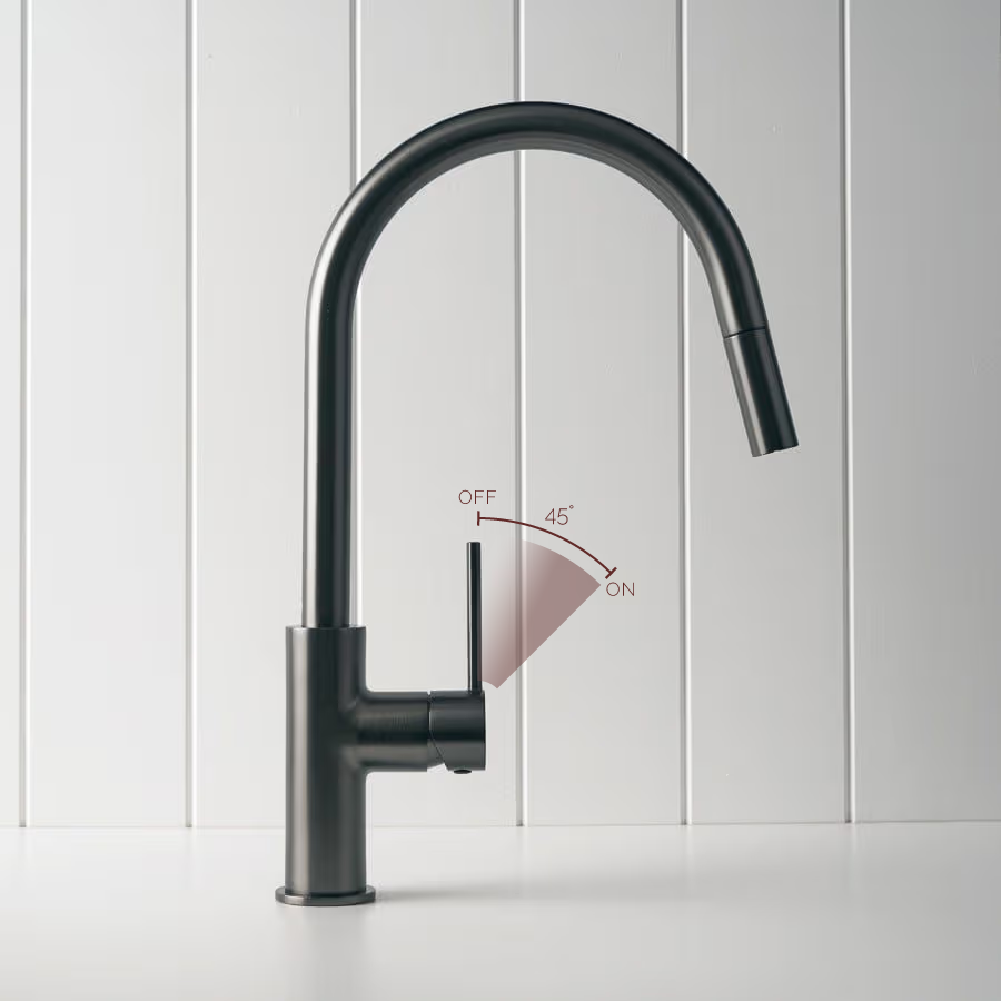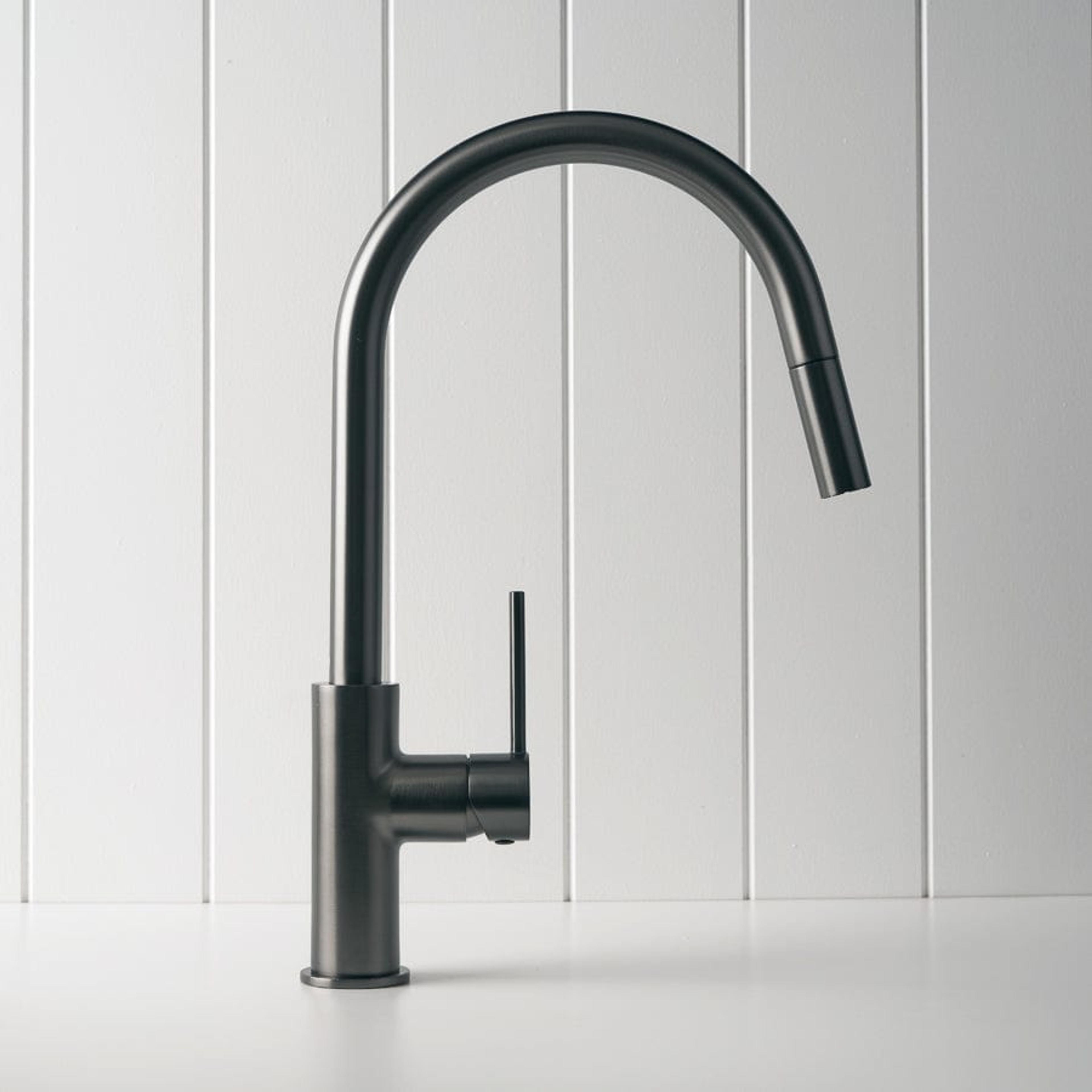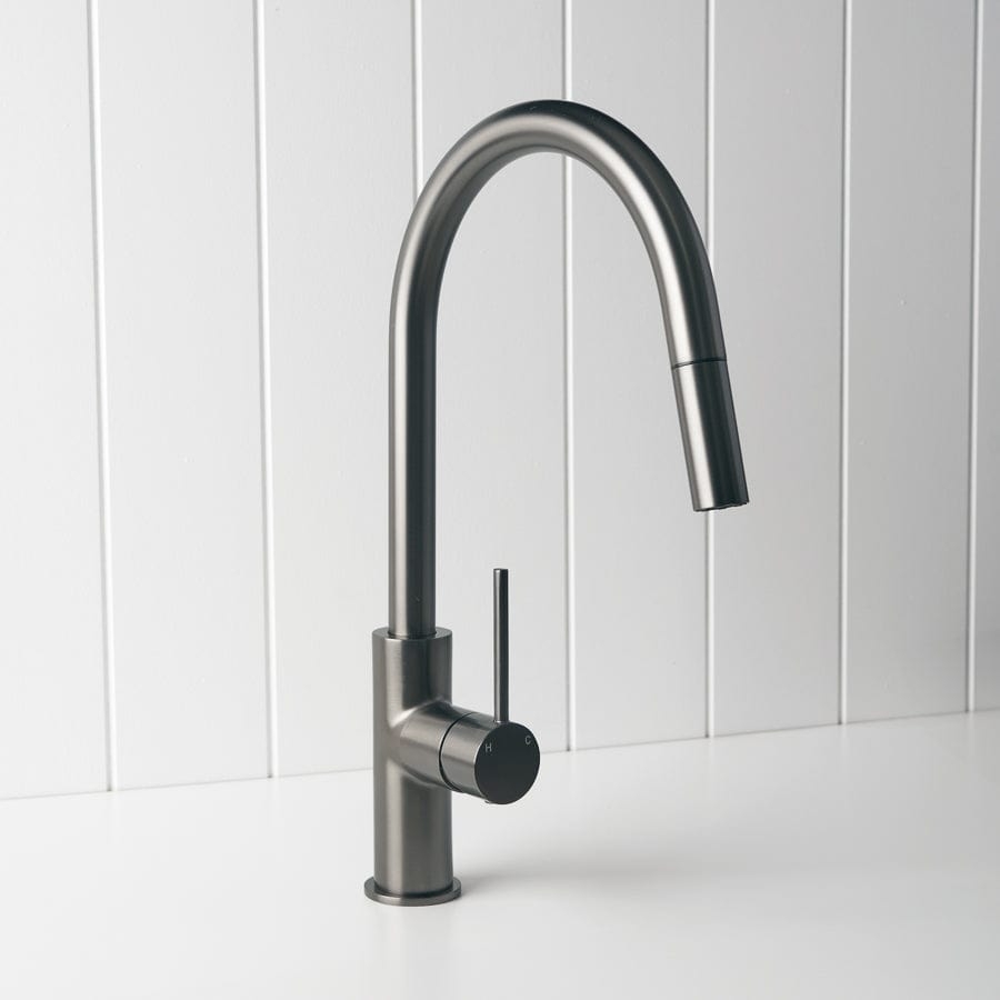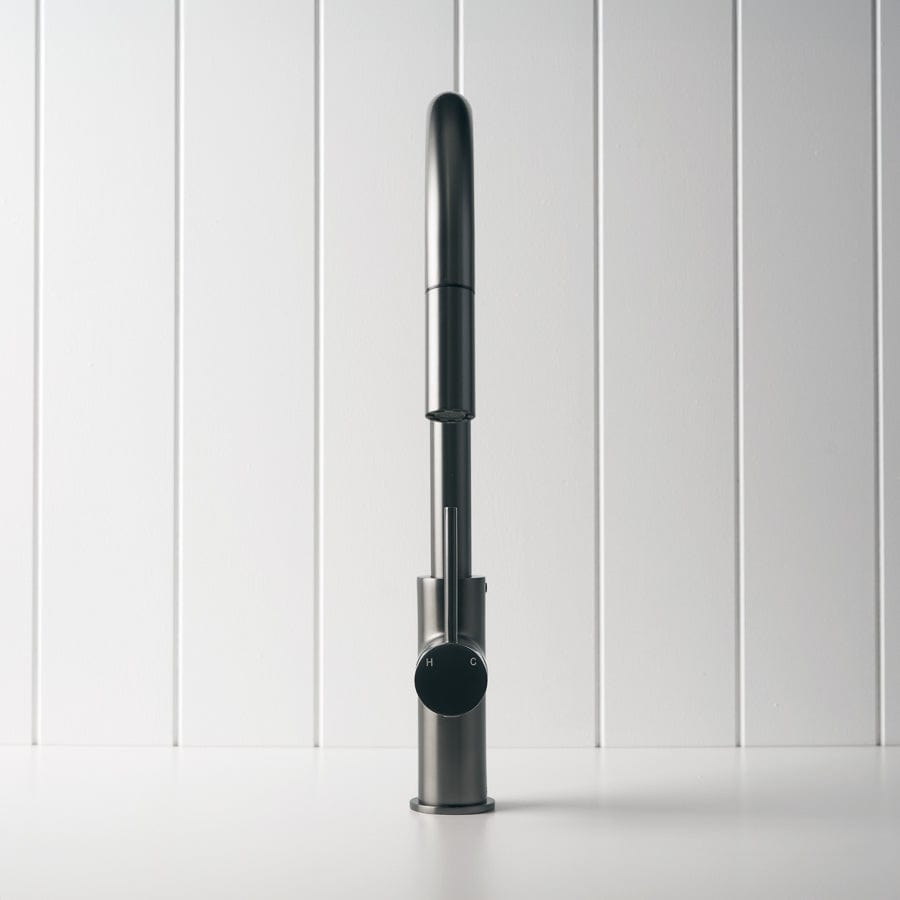 The Pullout Kitchen Mixer in Gunmetal adds a deep, modern tone that anchors pale stone and timber. Its pullout nozzle and swivel spout give extra reach for large sinks and wide cooktops. A gunmetal pullout kitchen mixer that keeps the working zone practical and design-forward.