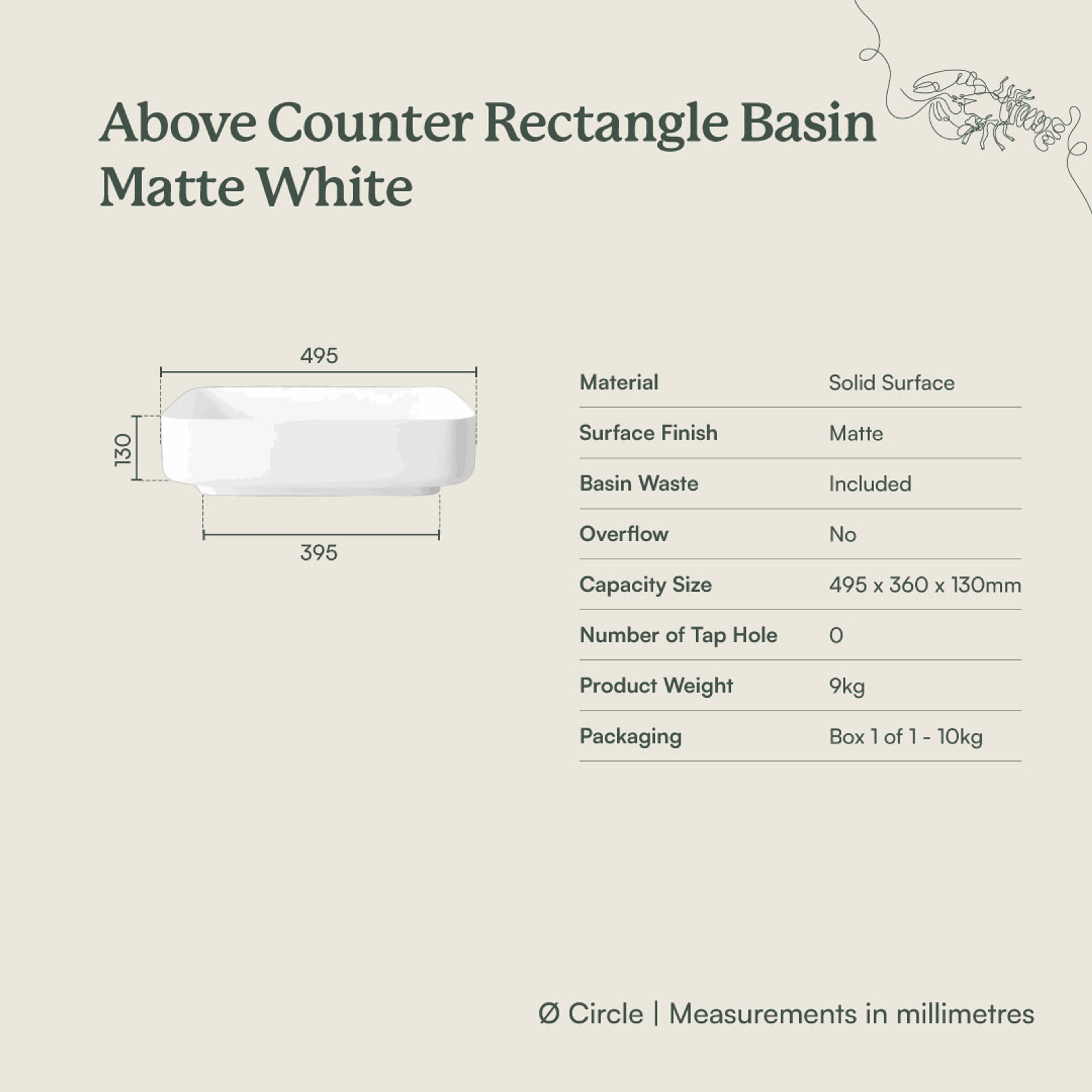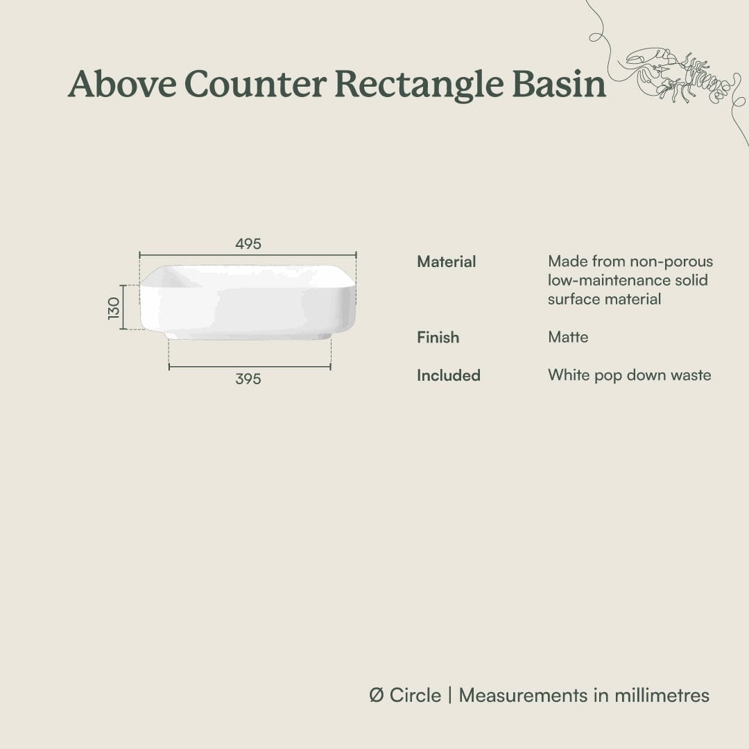 The Above Counter Rectangle Basin in Matte White brings crisp, modern lines to the vanity while still feeling soft around the edges. Made from non porous, low maintenance solid surface material with a matching white pop down waste, it keeps the bathroom palette calm and cohesive. For renovators seeking a feature basin that also controls splashes and clutter, its raised sides and compact footprint work beautifully.