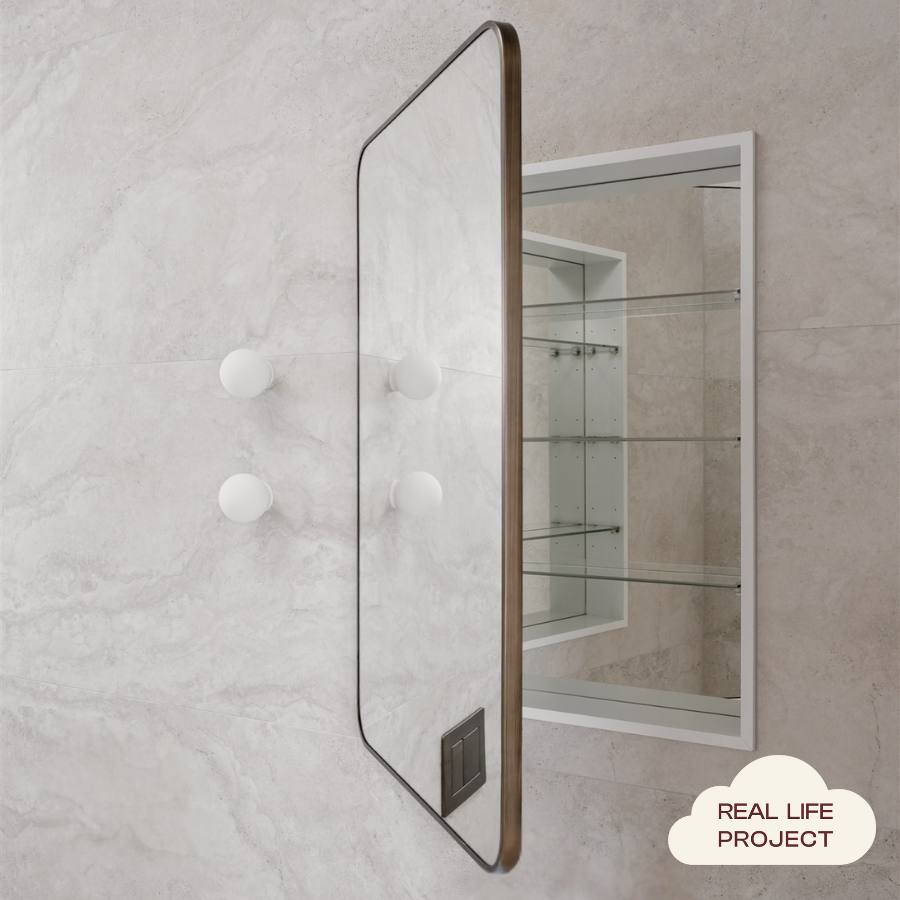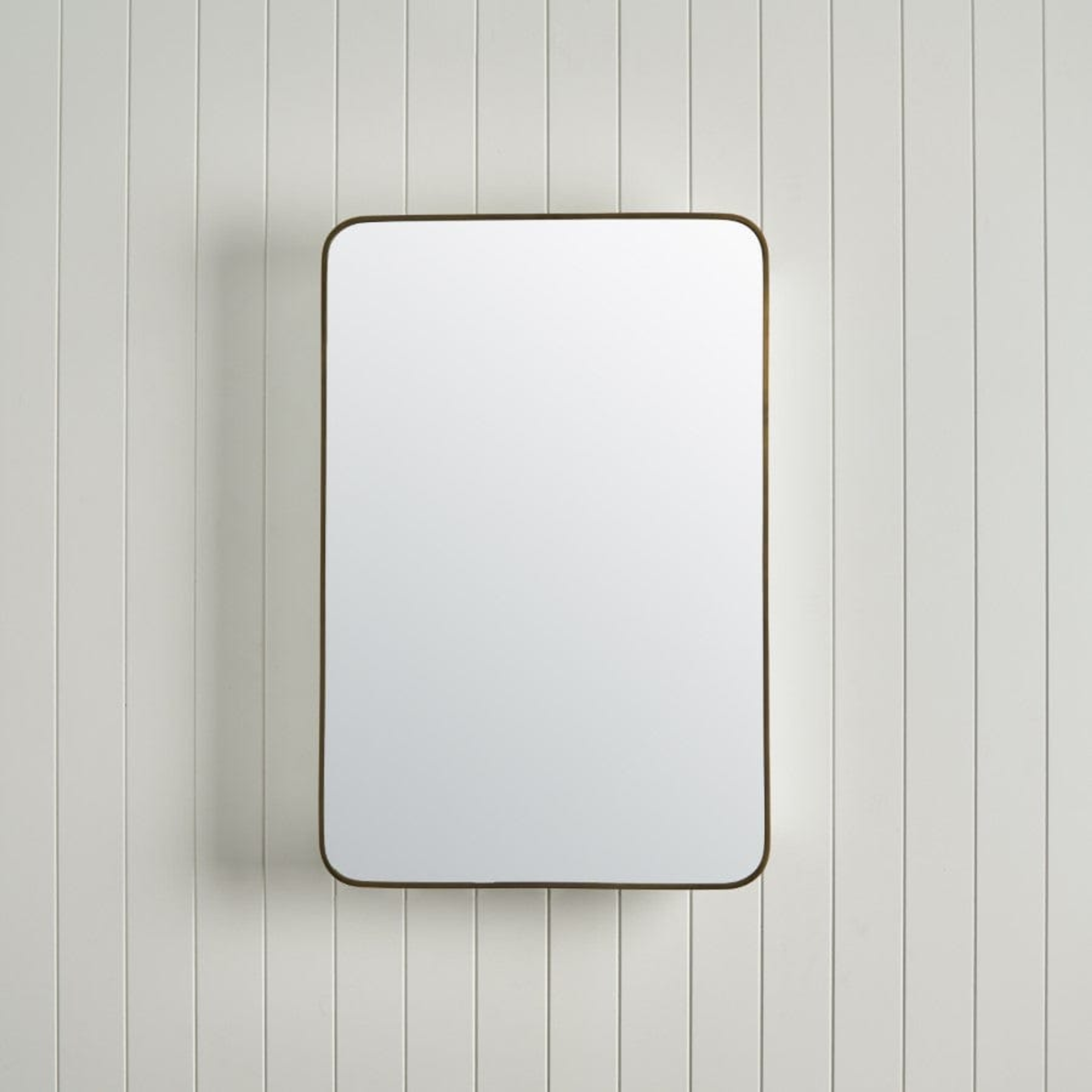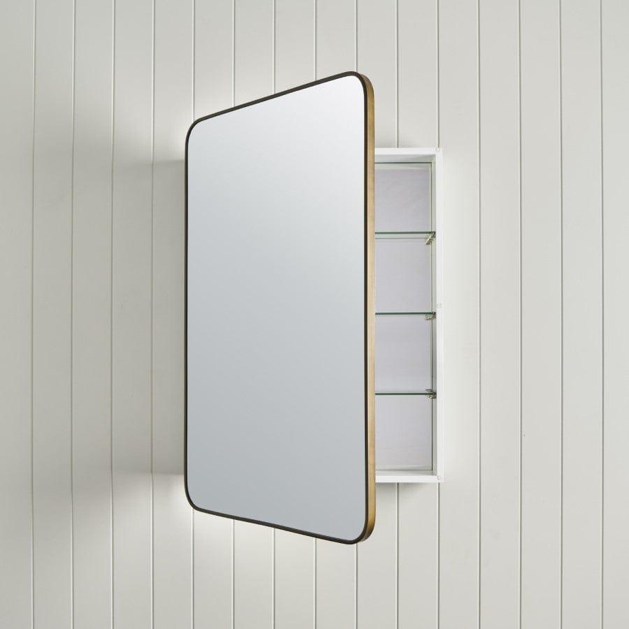 The Rectangular Mirror Cabinet in Antique Brass adds a warm, character frame while hiding everyday clutter. Designed for bathrooms, it can be recessed into the wall or mounted over tiles using the included brackets. Dual mirror doors and adjustable shelves create a practical, light-filled grooming zone with generous storage.