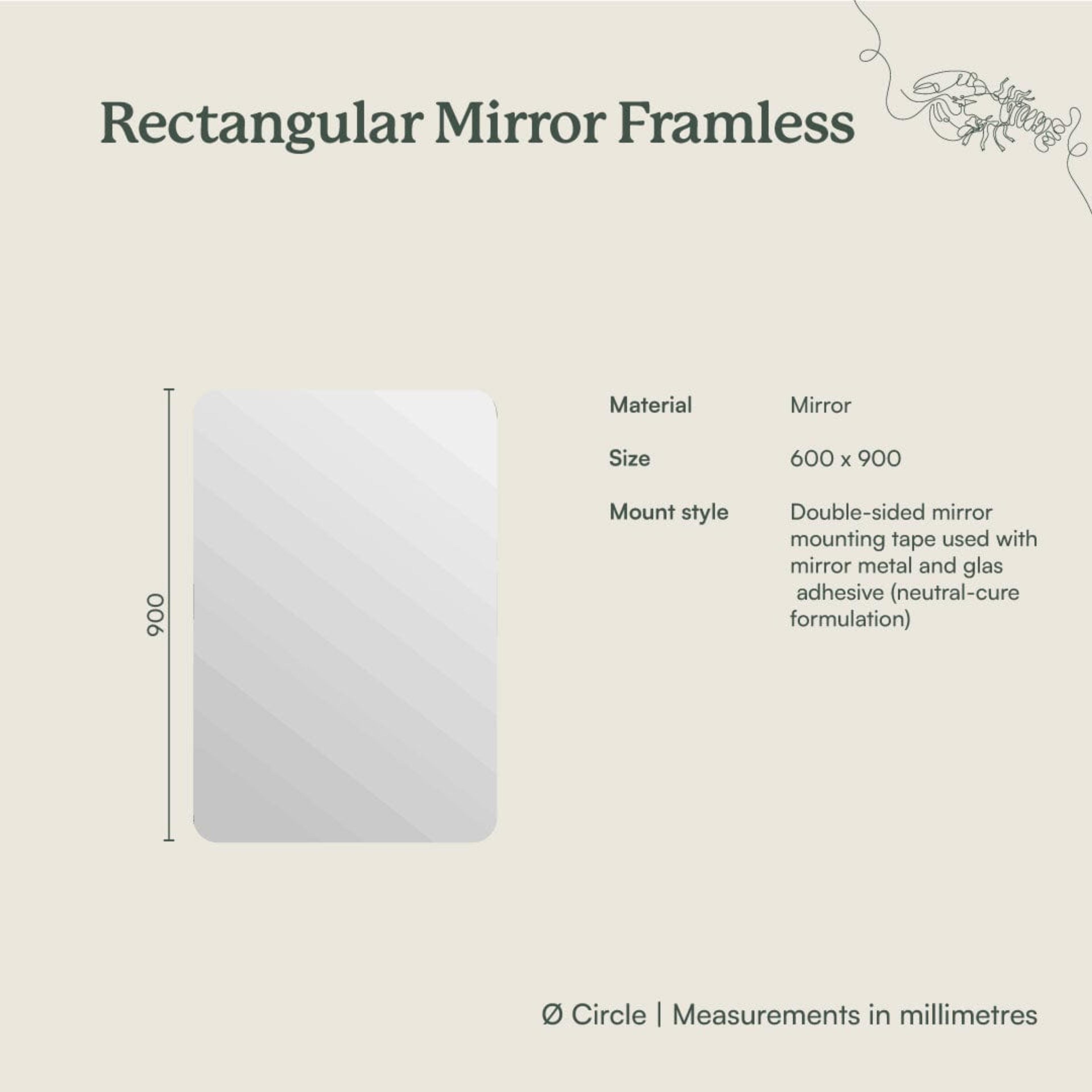 | Features | This mirror is designed to be installed using adhesives Suitable for use in bathrooms Frameless |