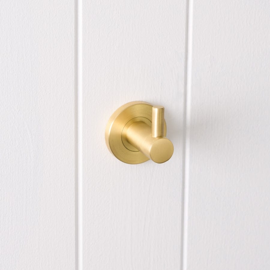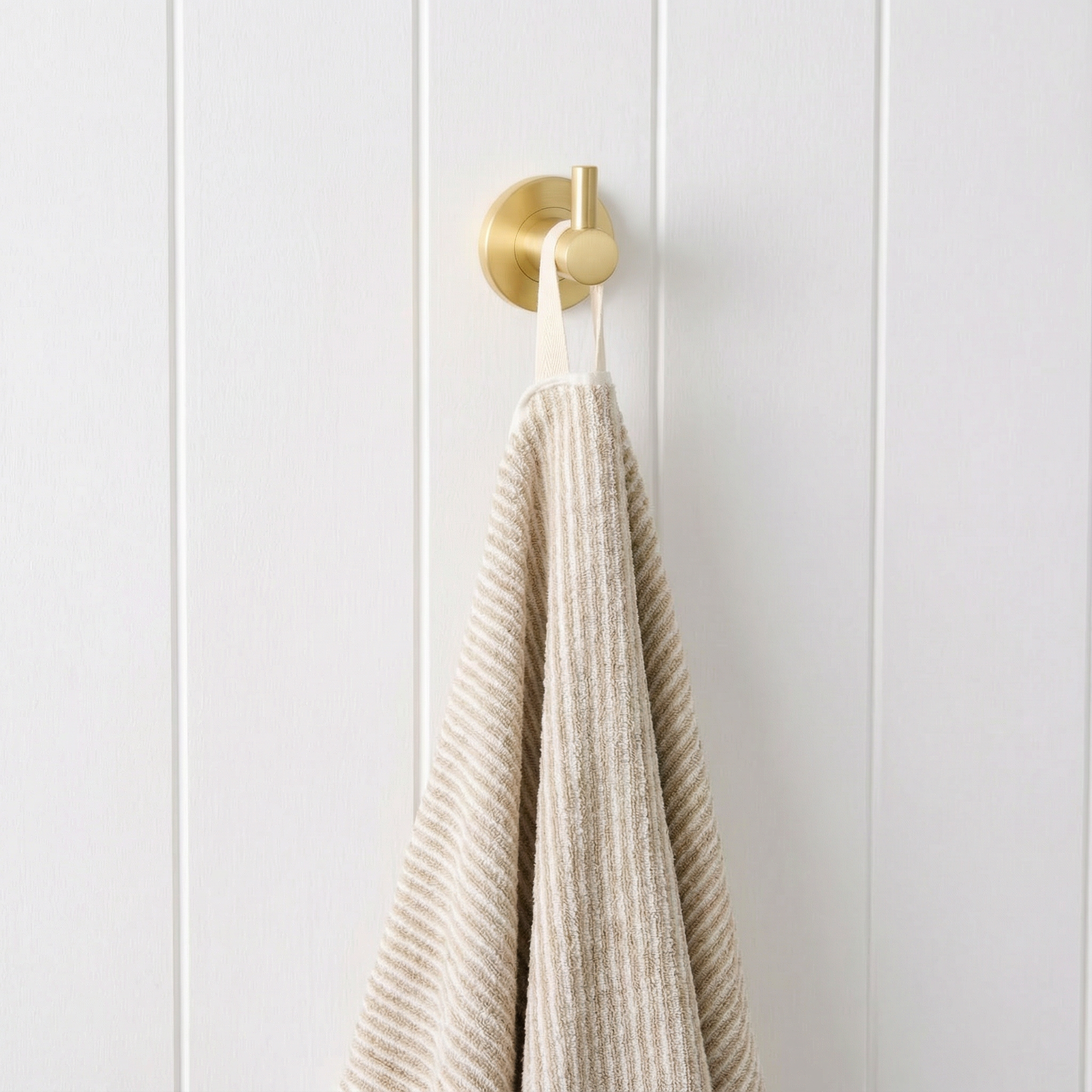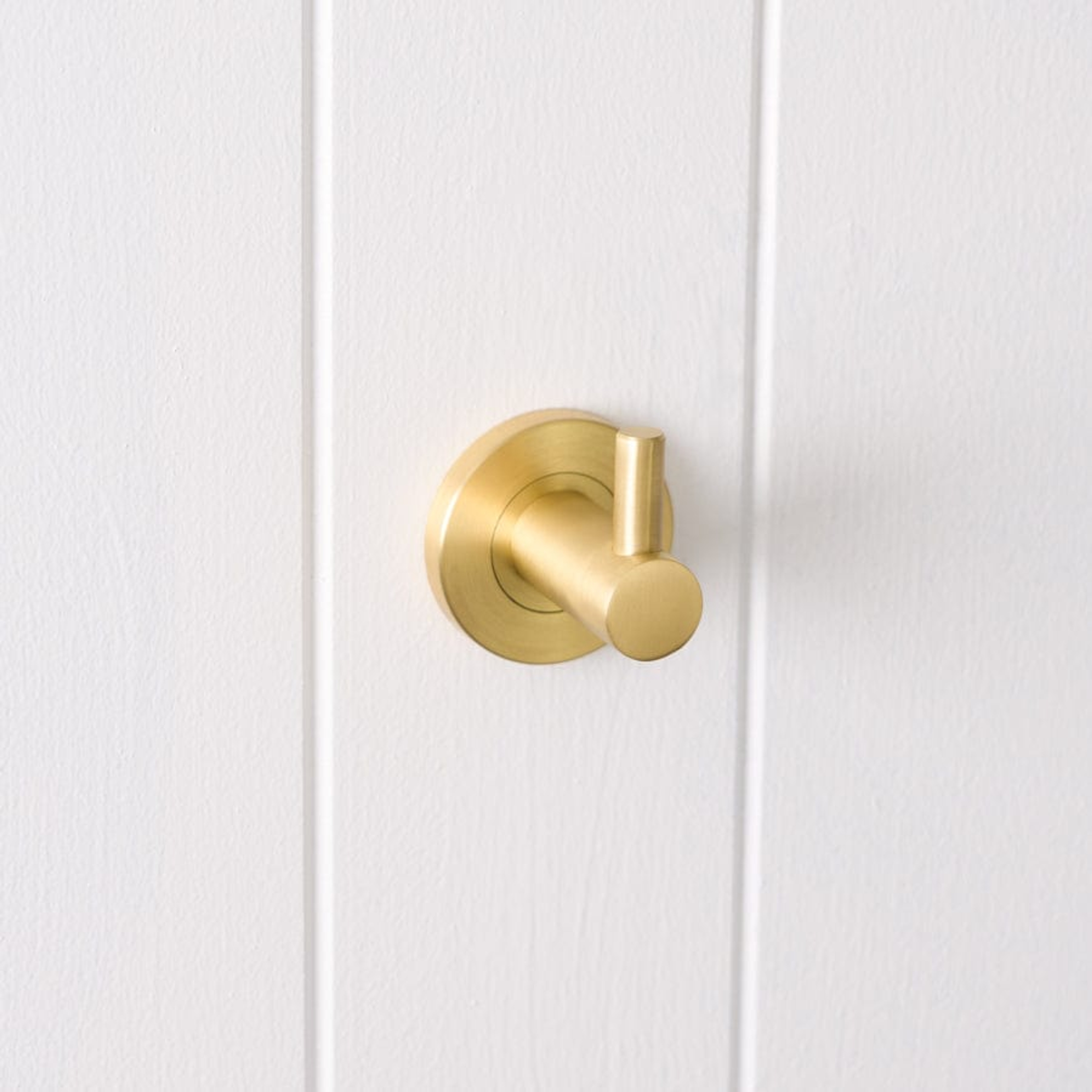 The Sydney Robe Hook in Brushed Brass adds soft warmth and a clean circular detail to bathroom walls. The Brushed Brass finish over stainless steel pairs beautifully with stone, white tiles and warm timber. Use this robe hook beside the shower to keep towels handy without cluttering the space.