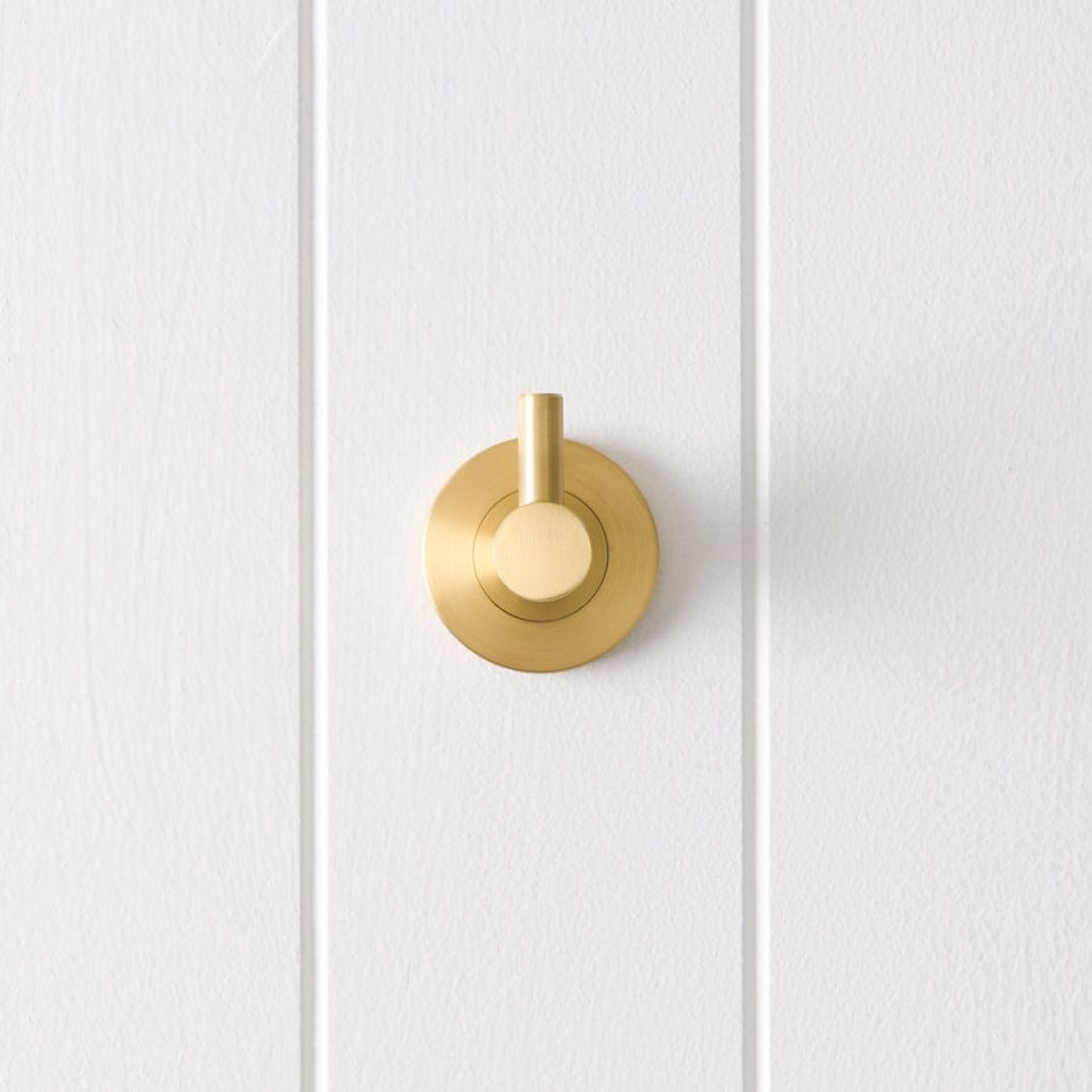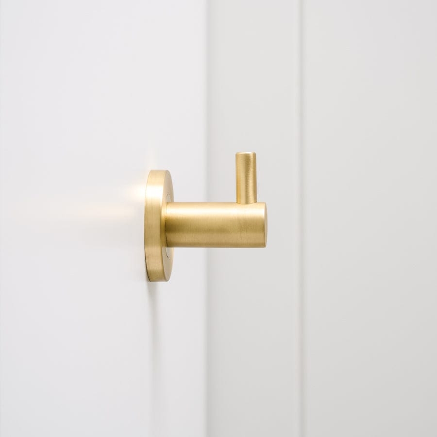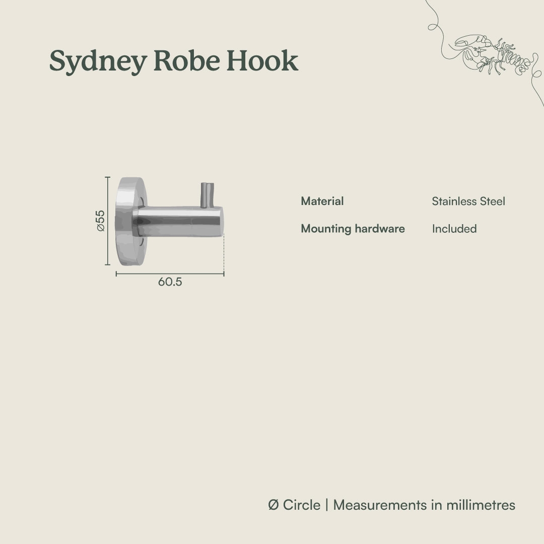 The Sydney Robe Hook in Brushed Brass adds soft warmth and a clean circular detail to bathroom walls. The Brushed Brass finish over stainless steel pairs beautifully with stone, white tiles and warm timber. Use this robe hook beside the shower to keep towels handy without cluttering the space.