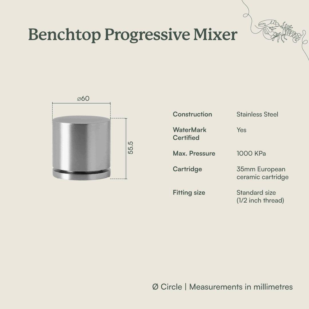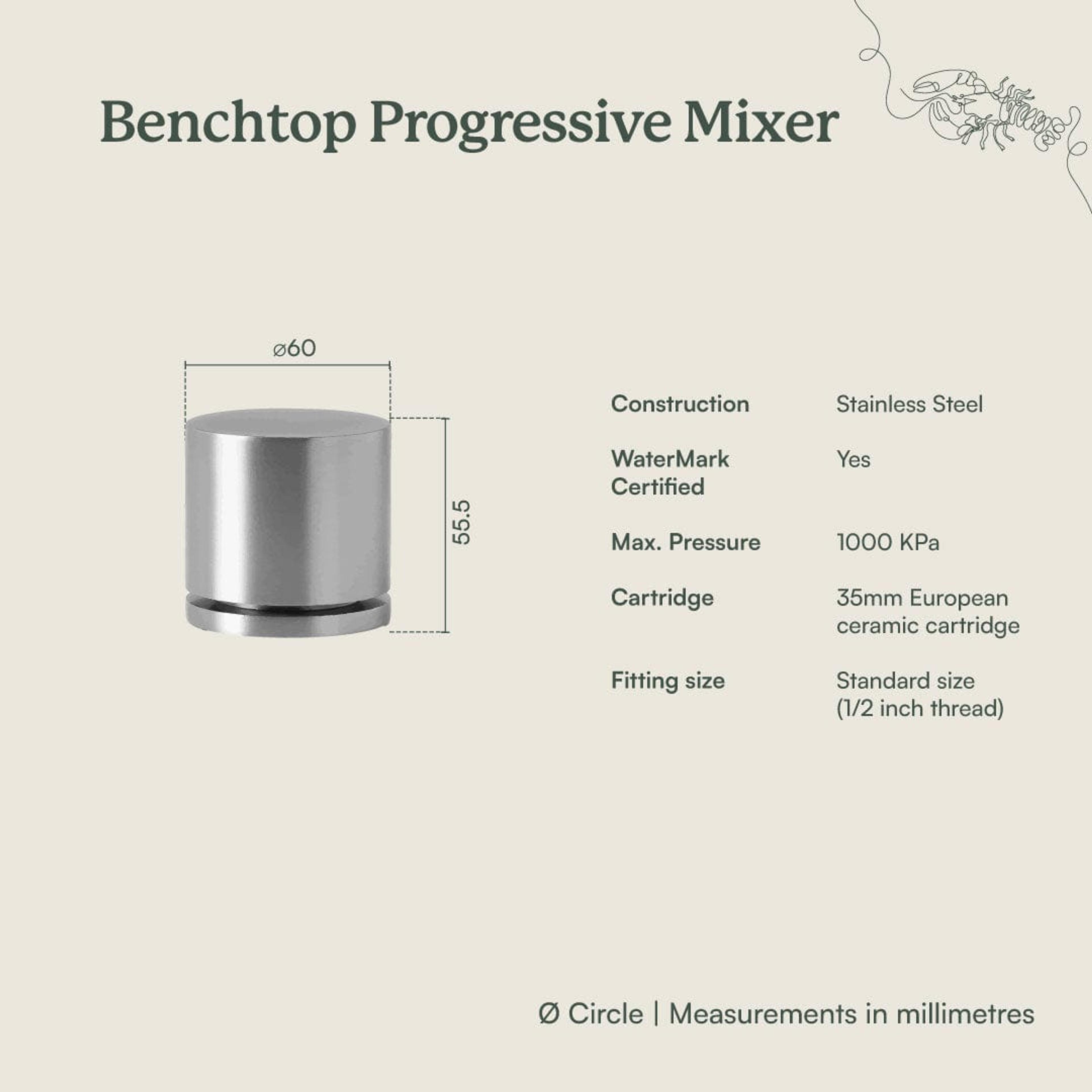 The Round Benchtop Progressive Mixer in Antique Brass brings a warm, character detail to basin tops. A simple twist of the dial moves smoothly from cool, gentle flow to full warm pressure, then hotter as you turn further. Precise control and a compact form make this mixer ideal for kitchens and bathrooms.