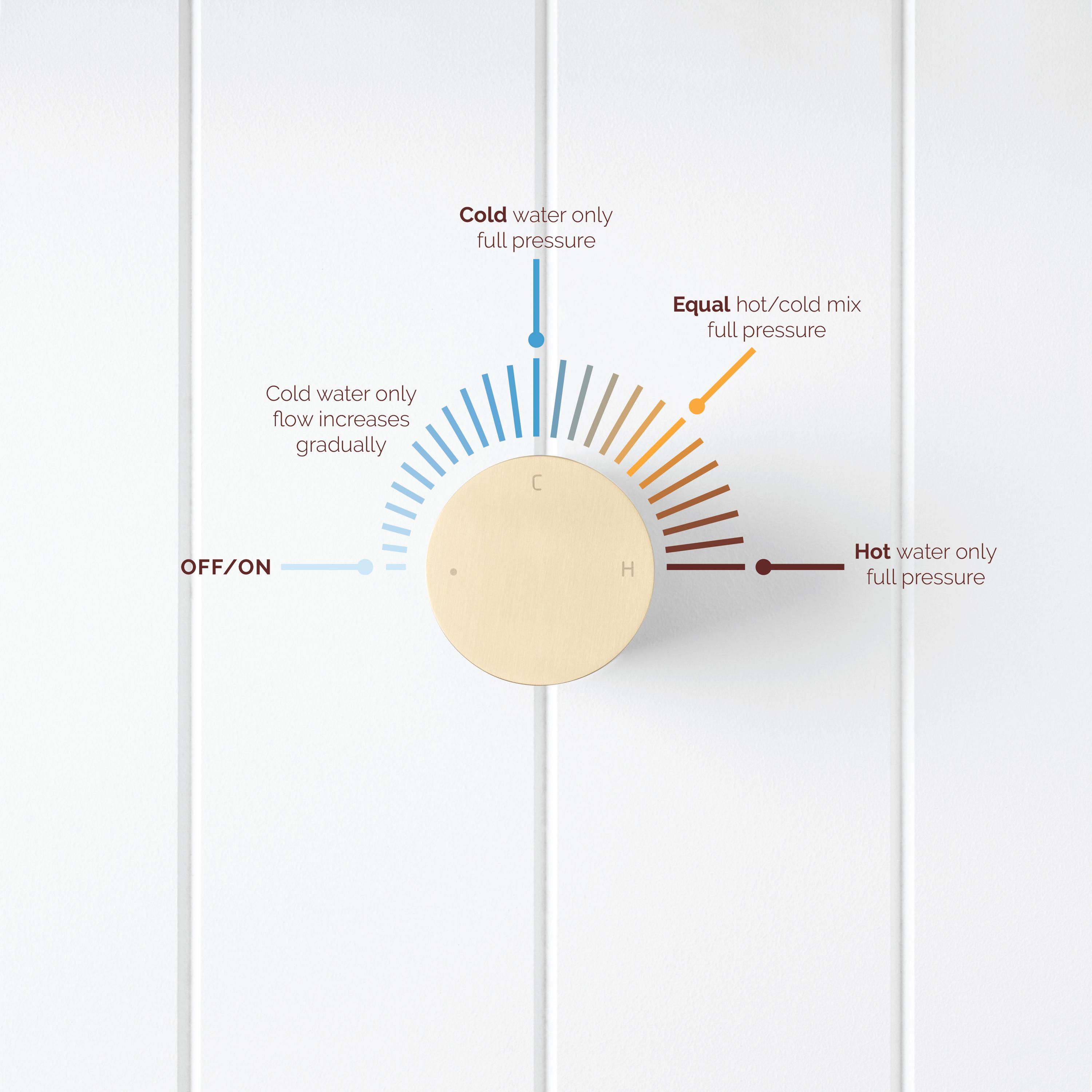The Round Wall Progressive Mixer in Brushed Brass brings a soft, brushed glow to minimalist showers and vanities. Its round dial offers fine control over temperature and pressure, simply rotate to move from cool rinse to warm, full spray.