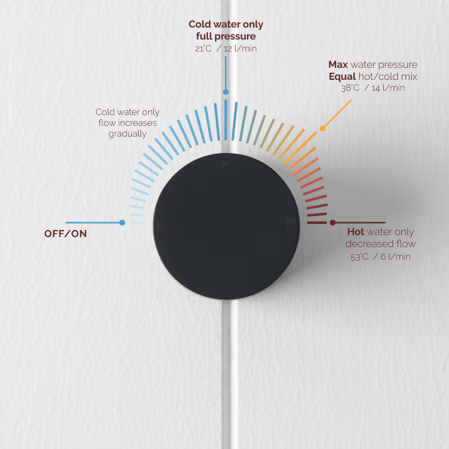 The Round Wall Progressive Mixer in Matte Black adds a bold, graphic touch to tiled showers and above-counter basins. Its slim round plate keeps the look minimal, while the progressive dial lets you move from cool trickle to warm, full pressure with one smooth turn. Confident lines, easy everyday control.