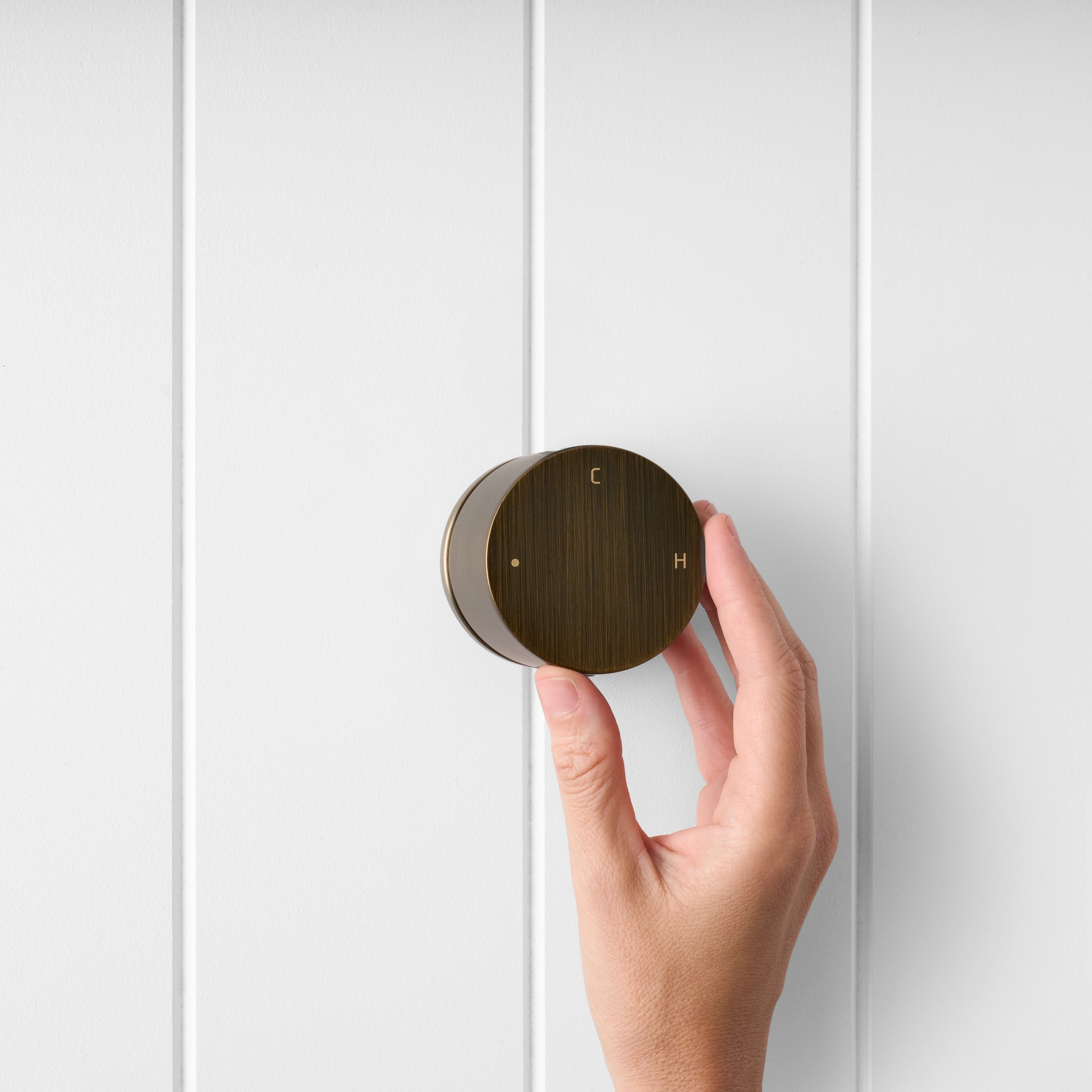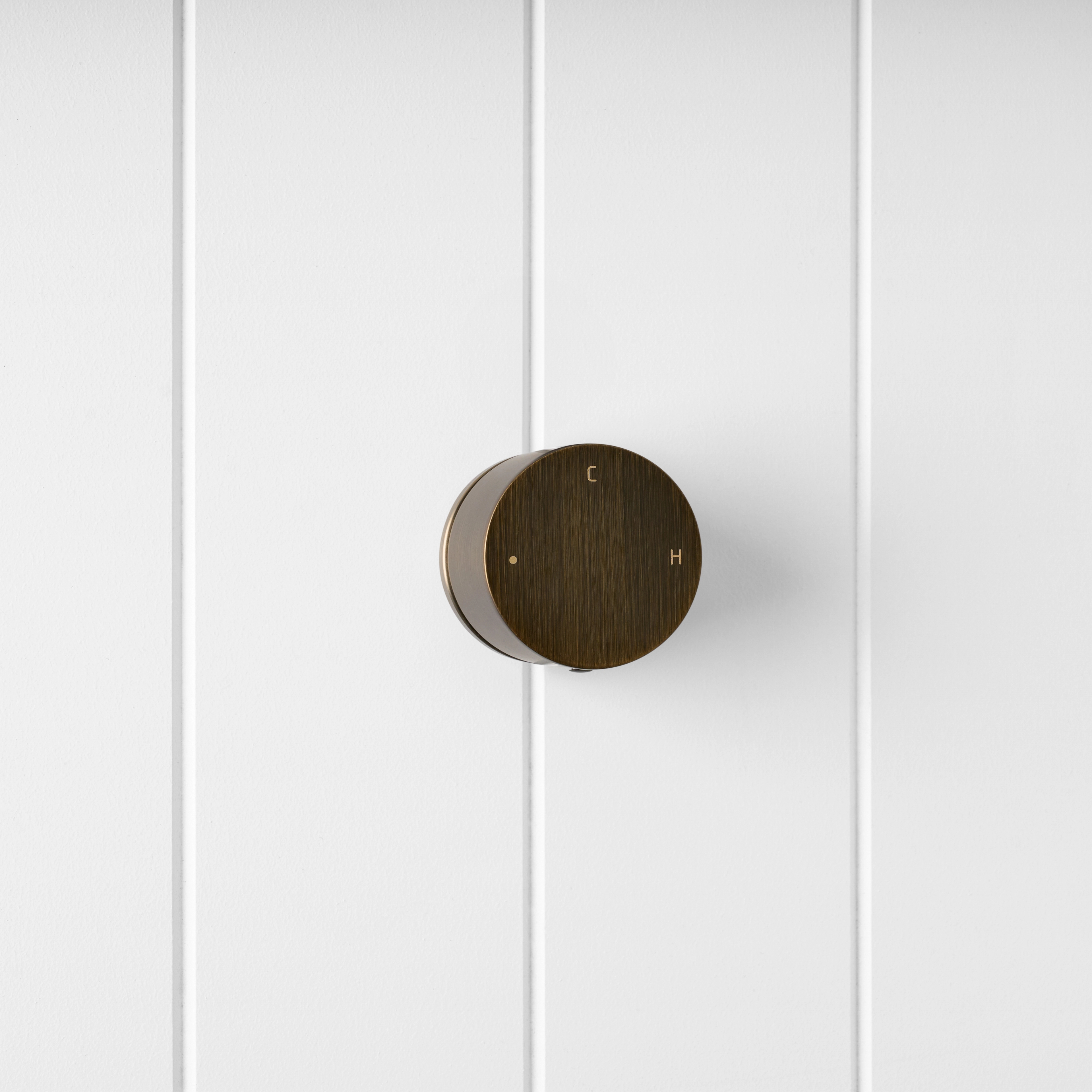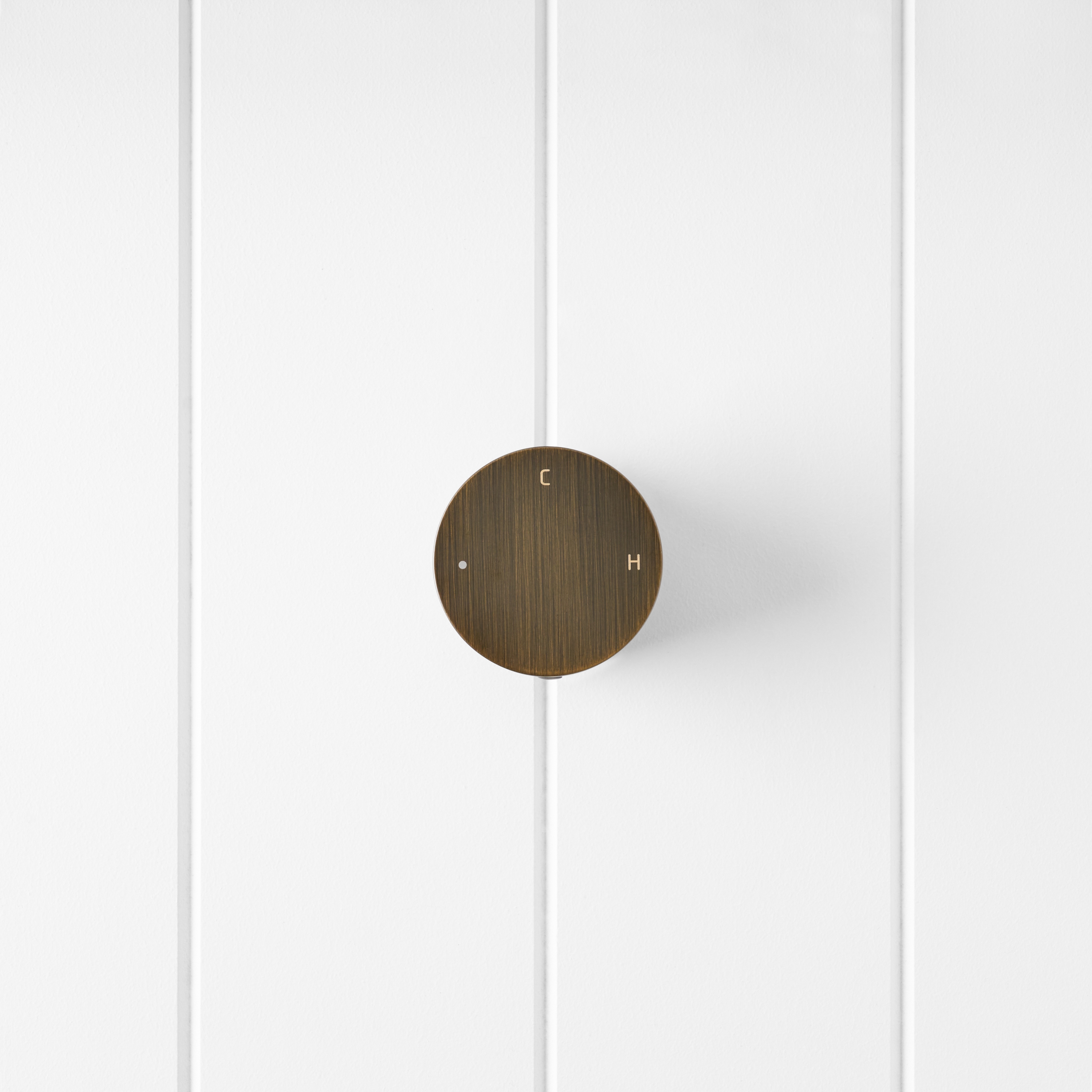 The Round Wall Progressive Mixer in Antique Brass brings warm character to a modern, minimal shower or basin. With a single circular dial, water starts cool and gentle, then builds smoothly to full pressure and warmer temperatures as you turn.